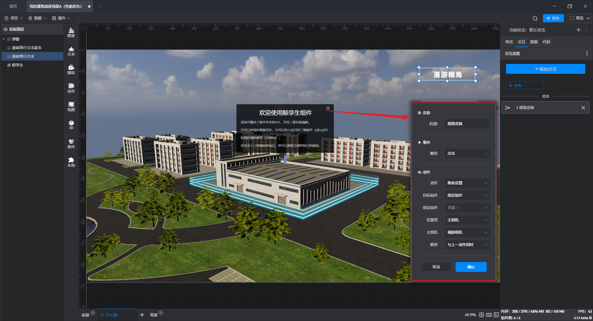 在鲸孪生中可以通过添加路径动画的方式设置漫游相机的漫游视角。