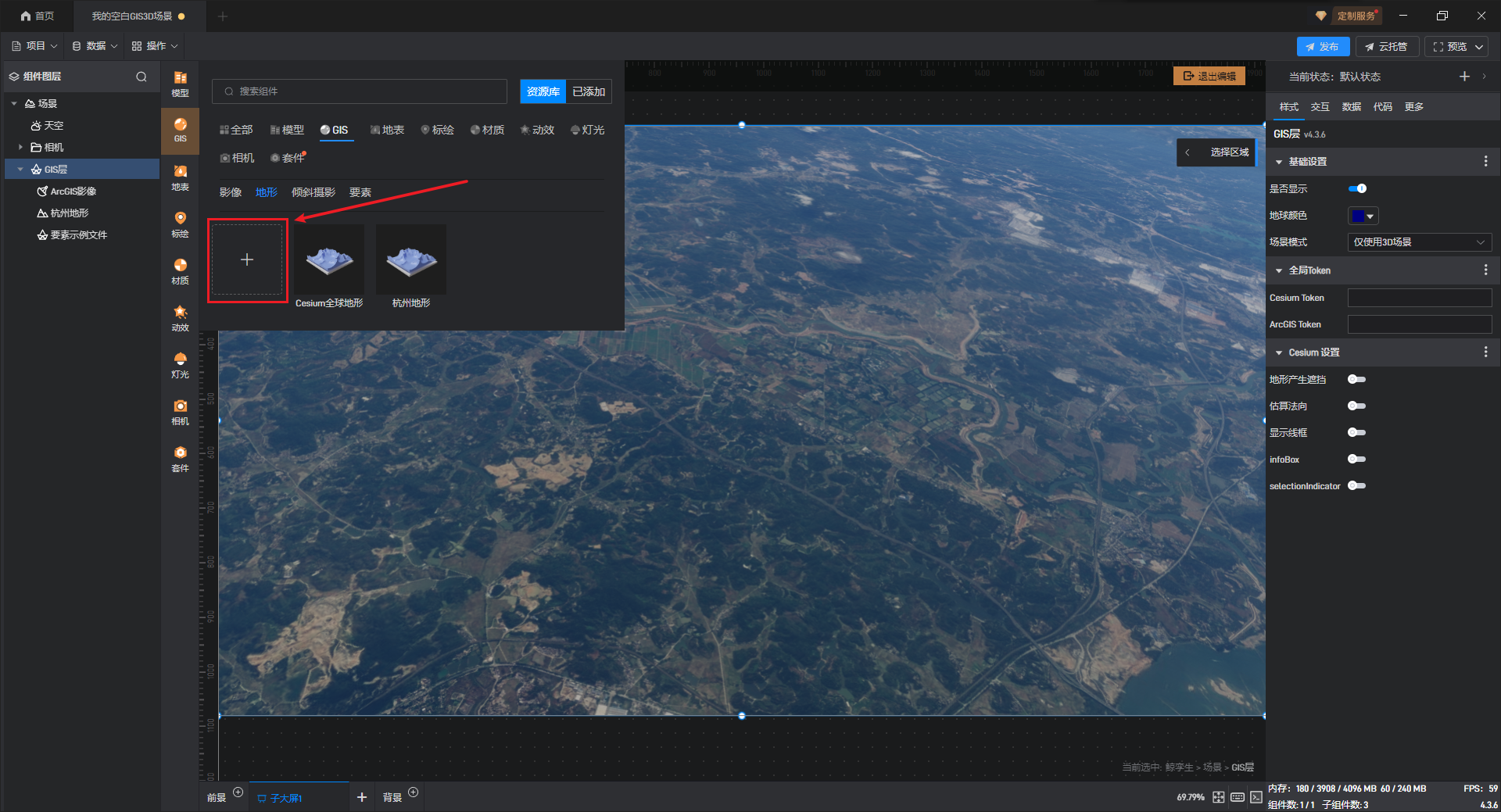 点击“GIS-地形”左侧的“+”按钮,即可添加自定义 GIS 地形。(具体添加方式请参看教程:GIS 地形的添加)