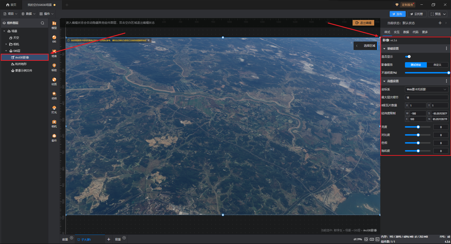 添加影像后,在左侧图层选中影像组件,即可在右侧设置对样式等进行设置。(具体设置方式请参看:GIS 影像的设置)
