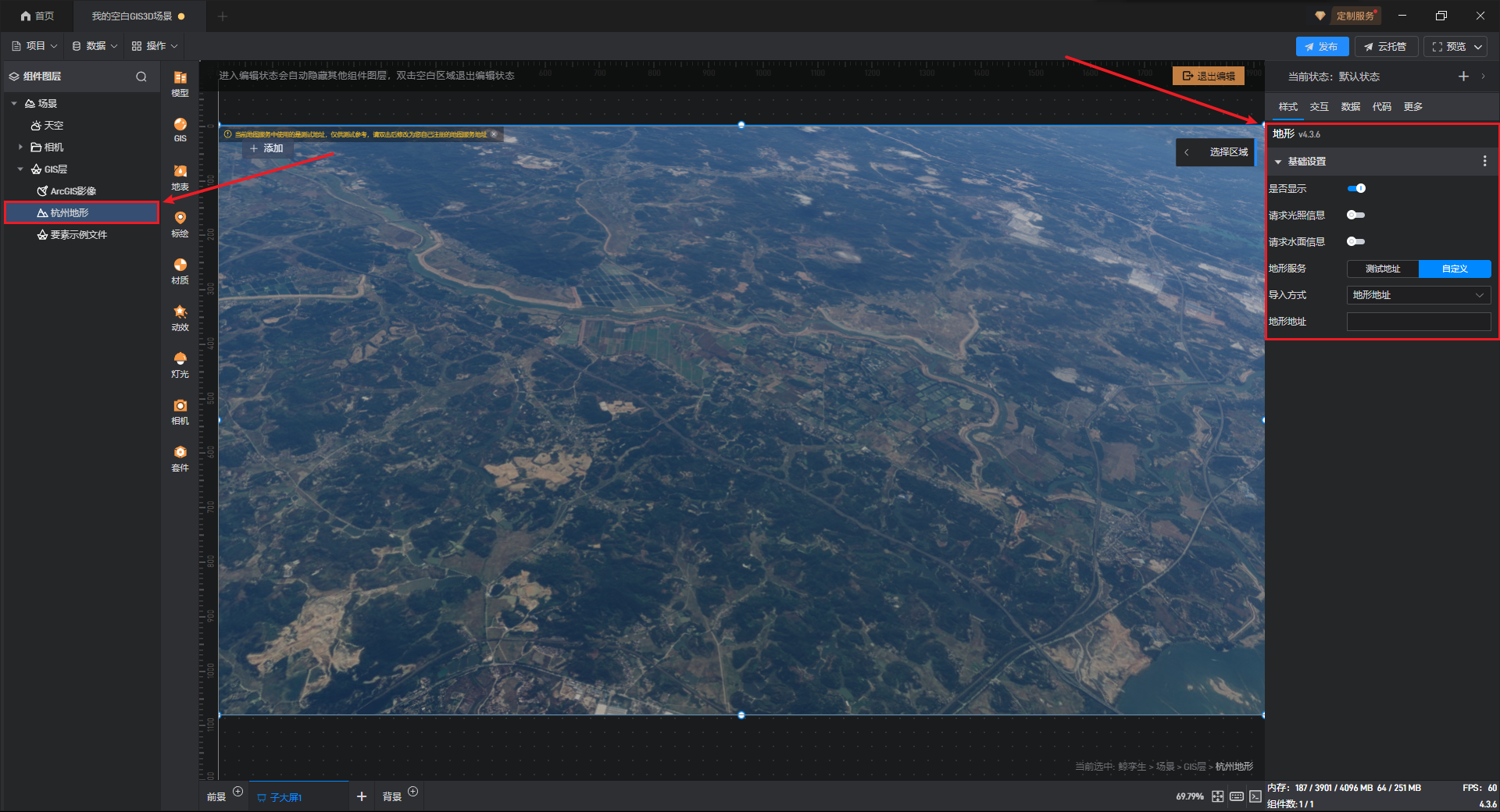 添加地形后,在左侧图层选中地形组件,即可在右侧设置对样式等进行设置。(具体设置方式请参看:GIS 地形)