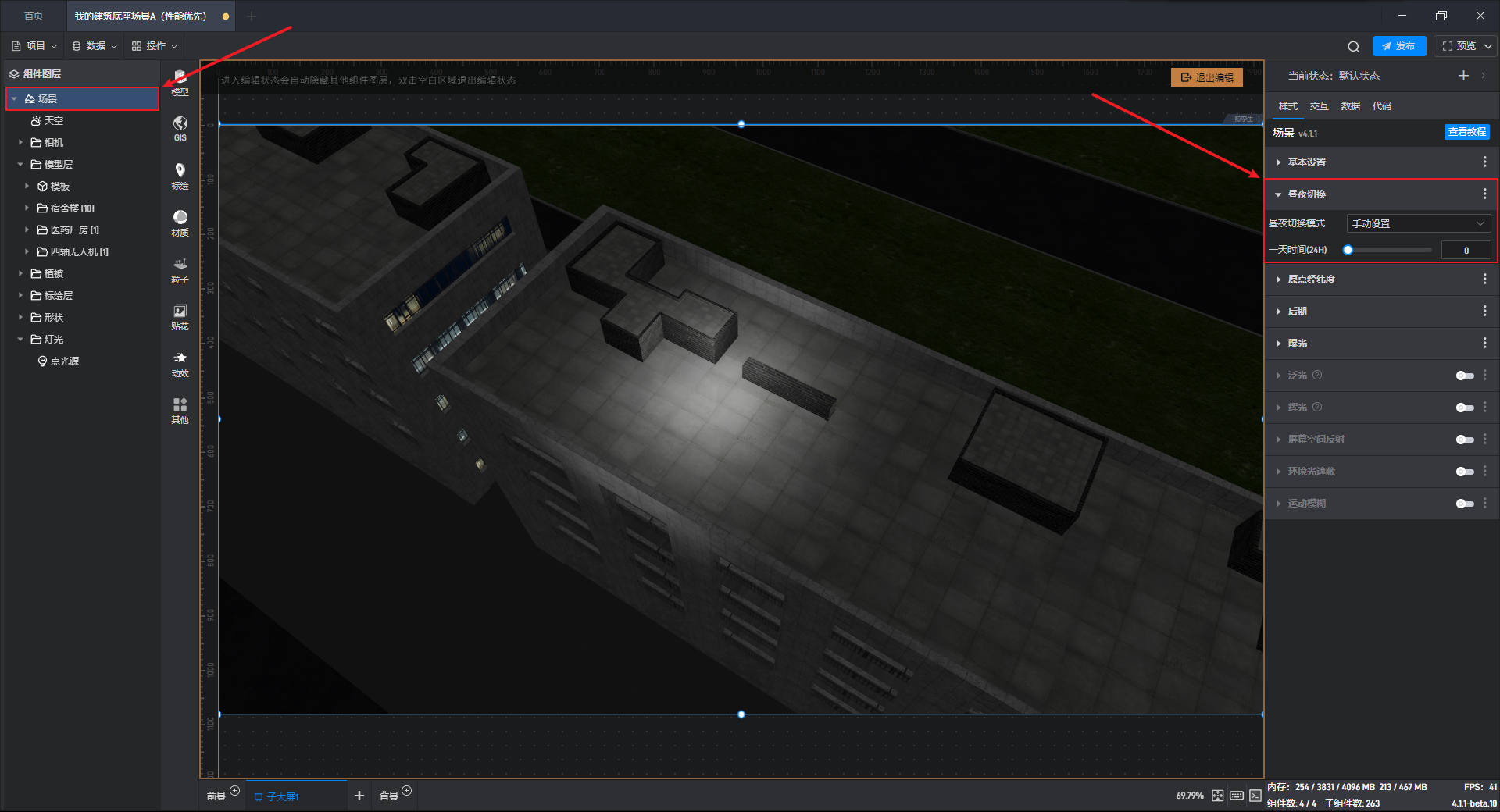 | 丁达尔效应 | 调整点光源的亮度,在雨天、雾天等场景中调高丁达尔效应可以增加真实感。 |
