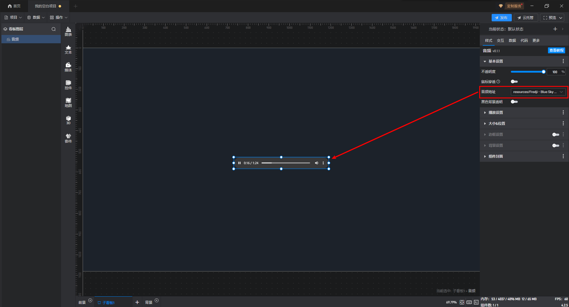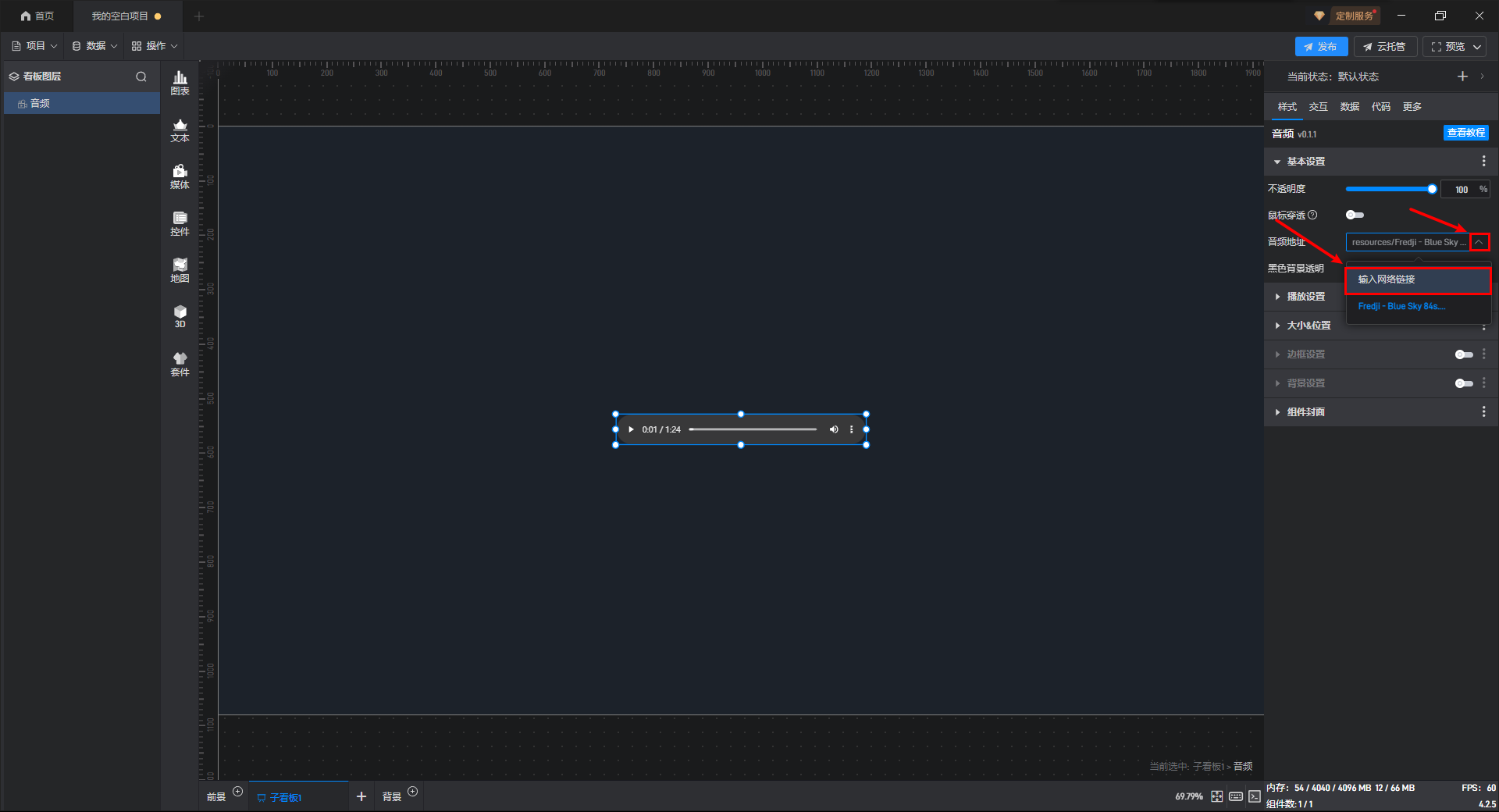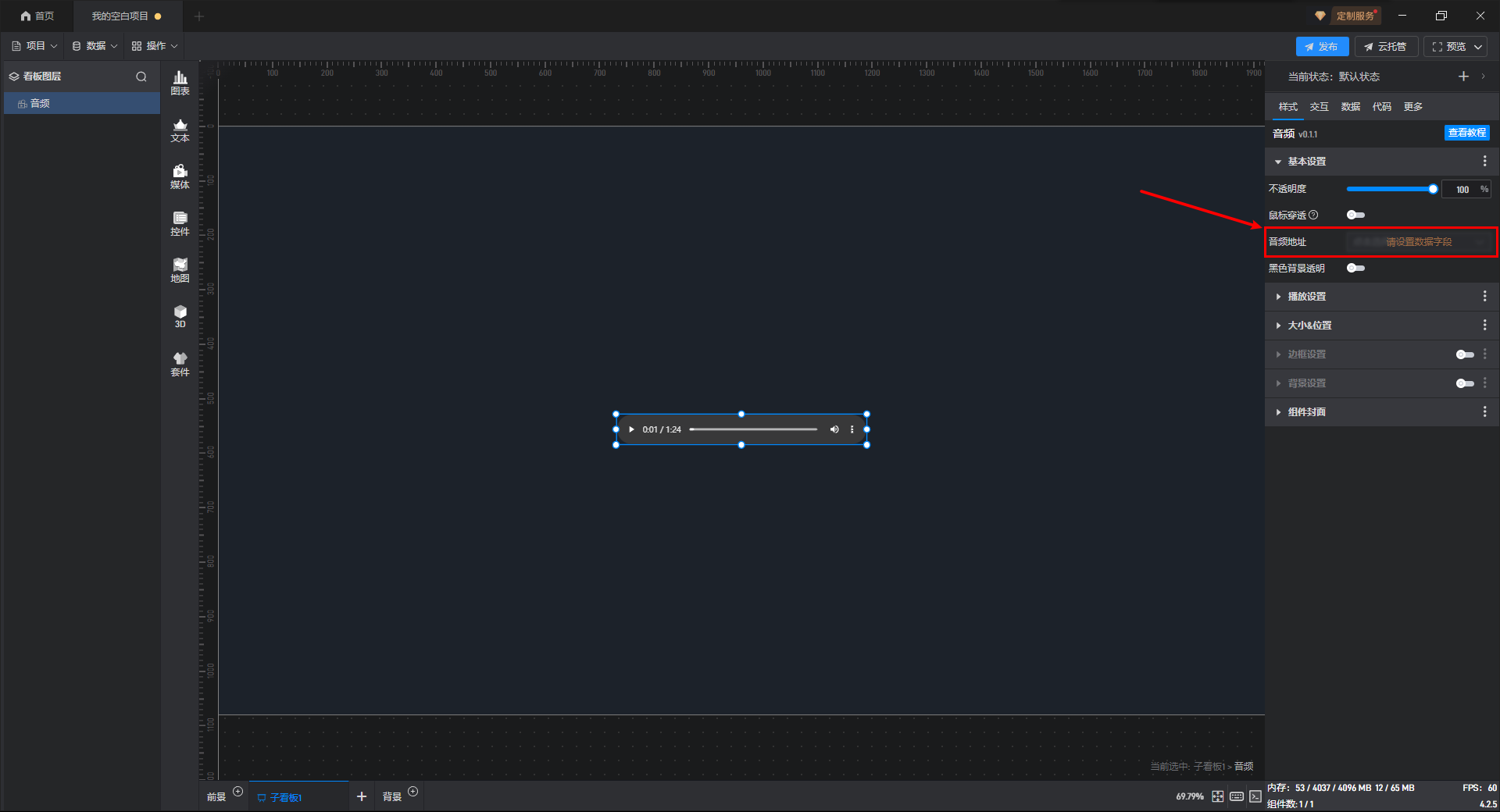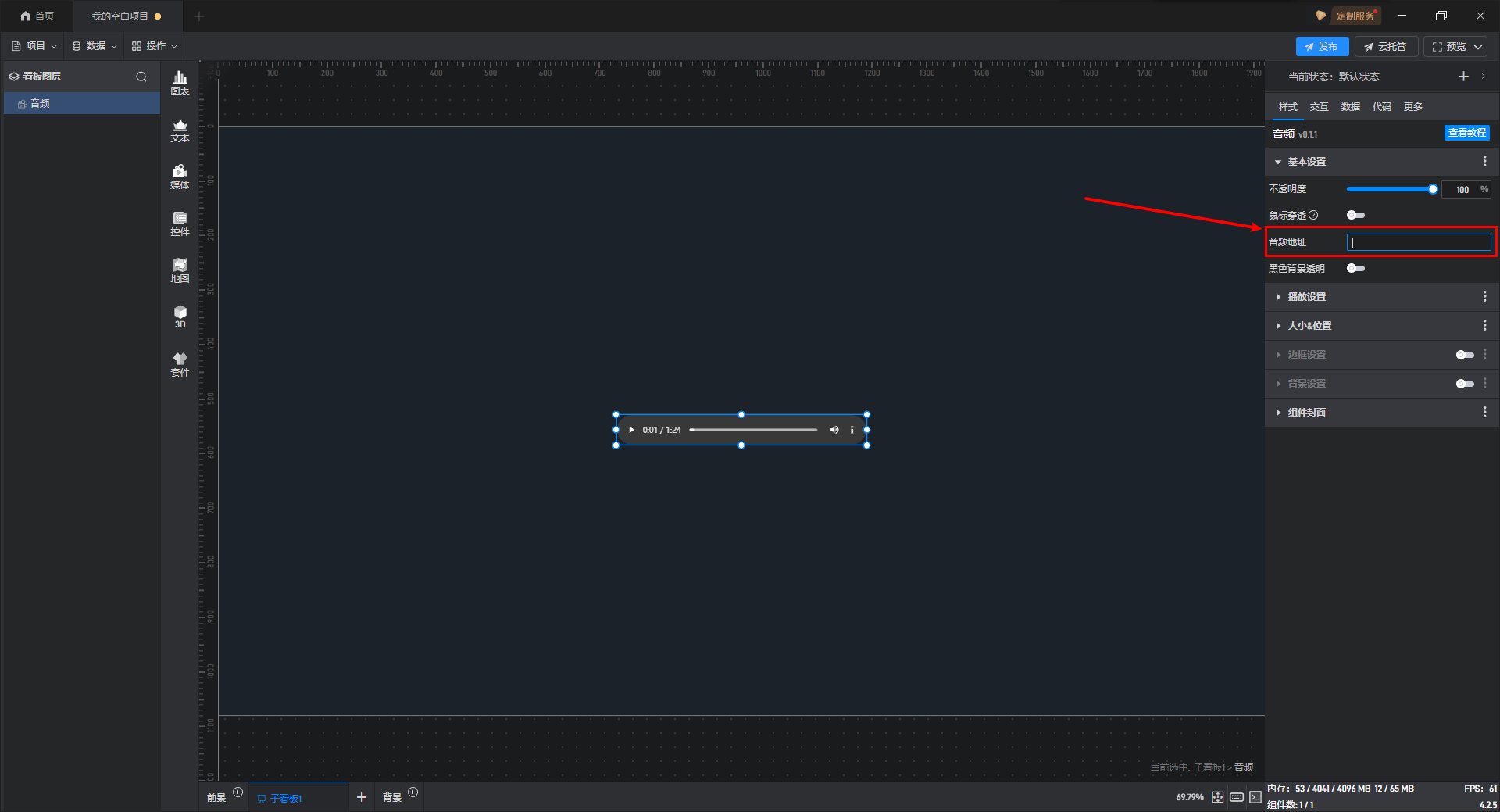 点击选中音频组件,在右侧样式“基本设置”项中,可以对“音频地址”进行设置。