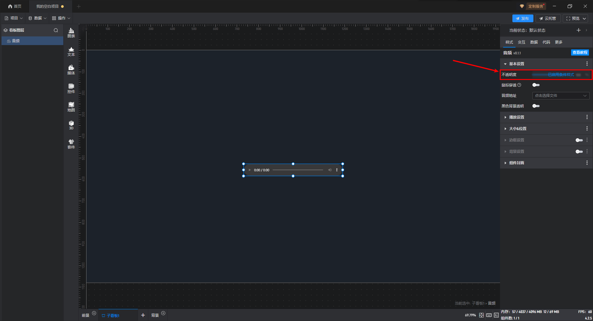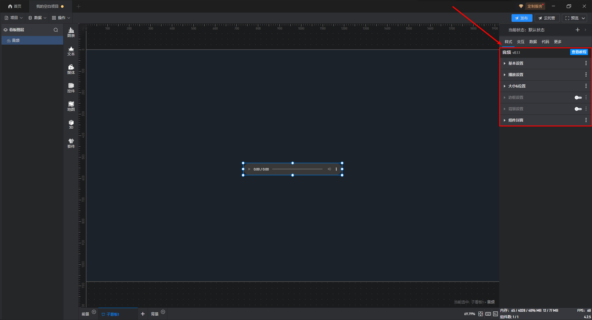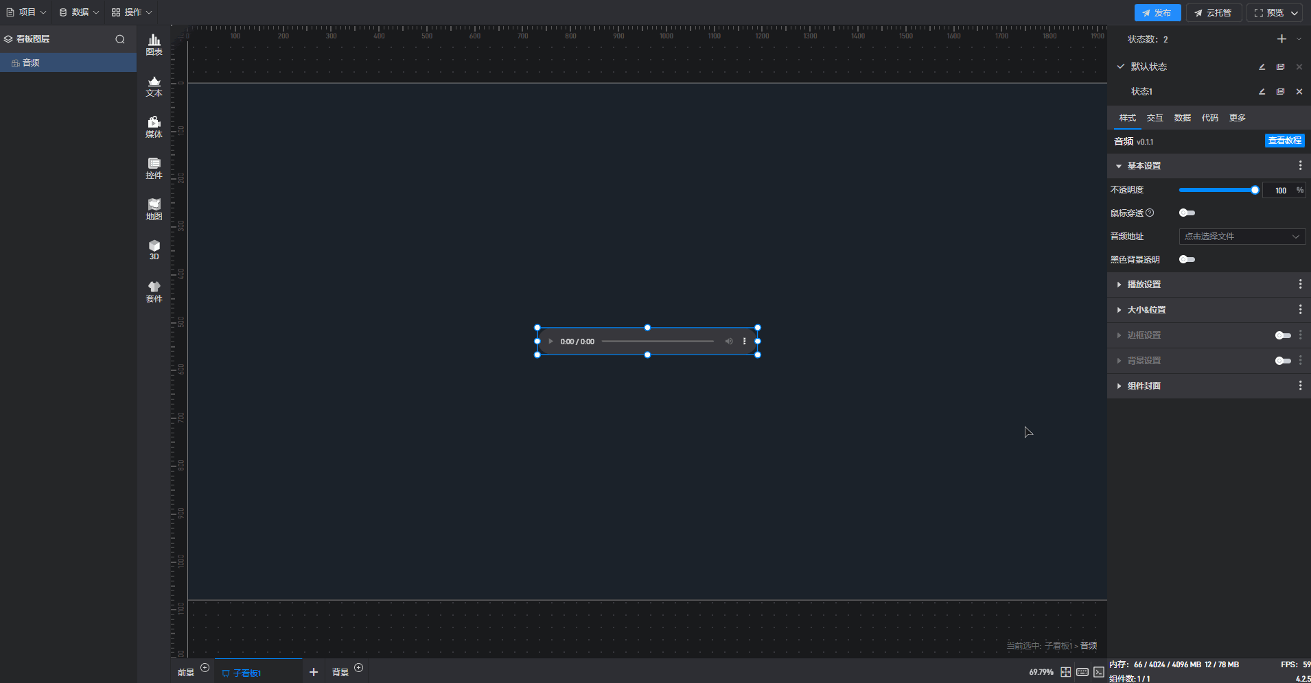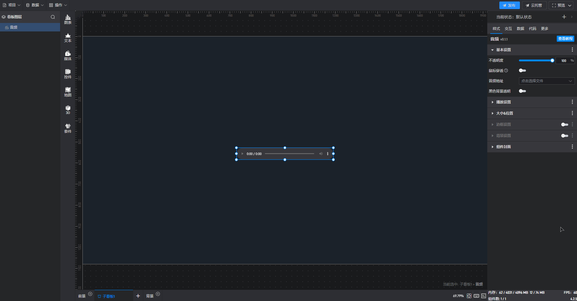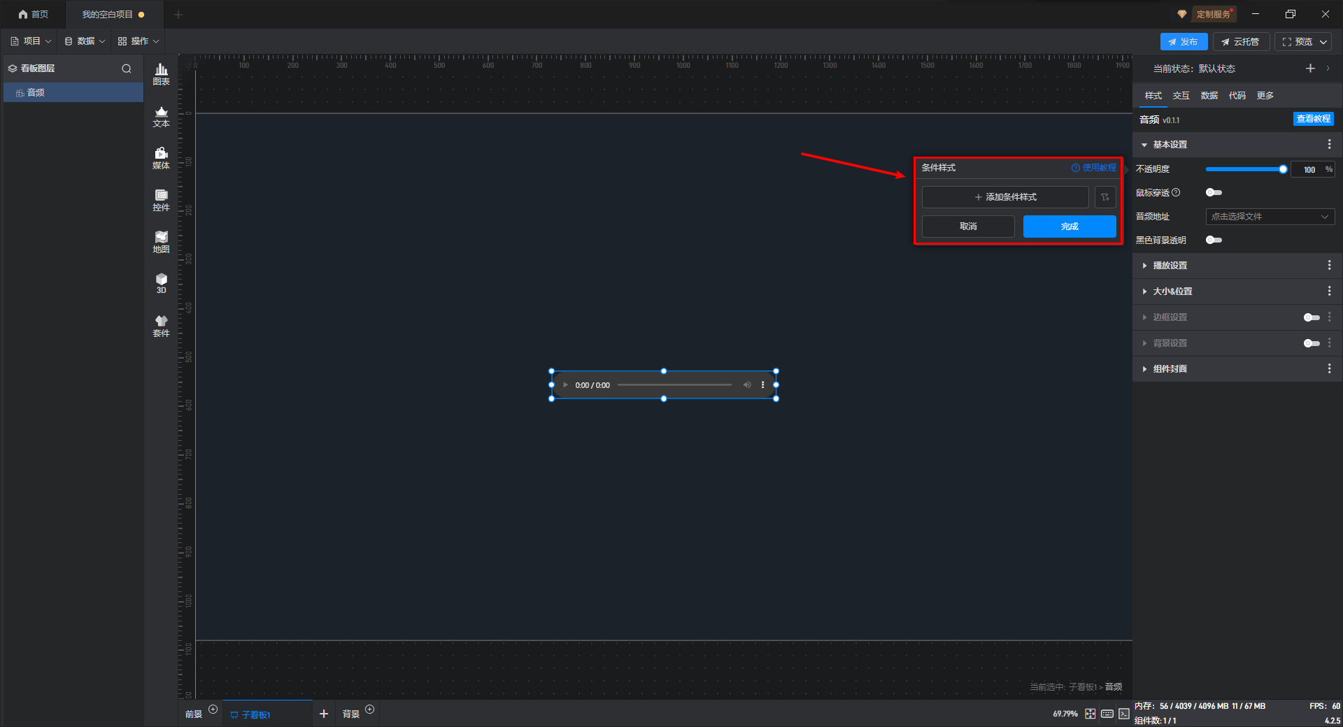 点击选中音频组件,在右侧样式“基本设置”项中,可以对“音频地址”进行设置。