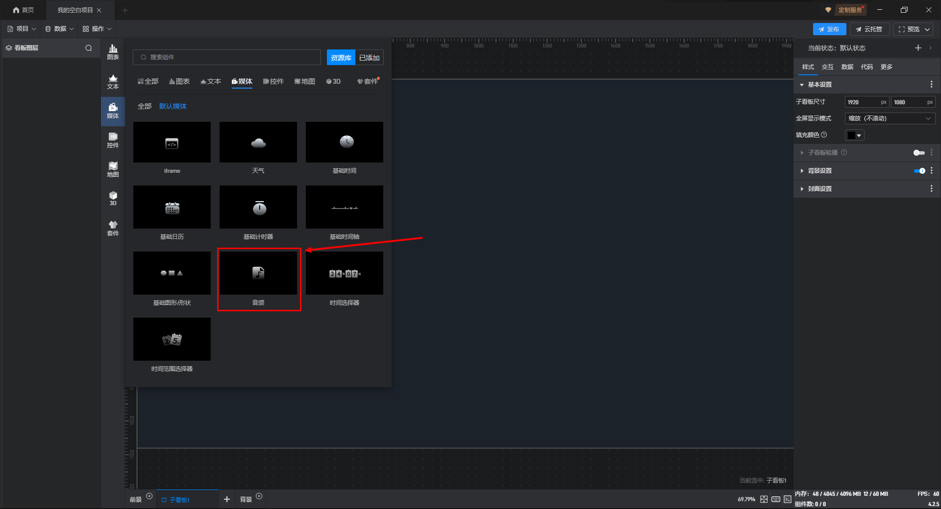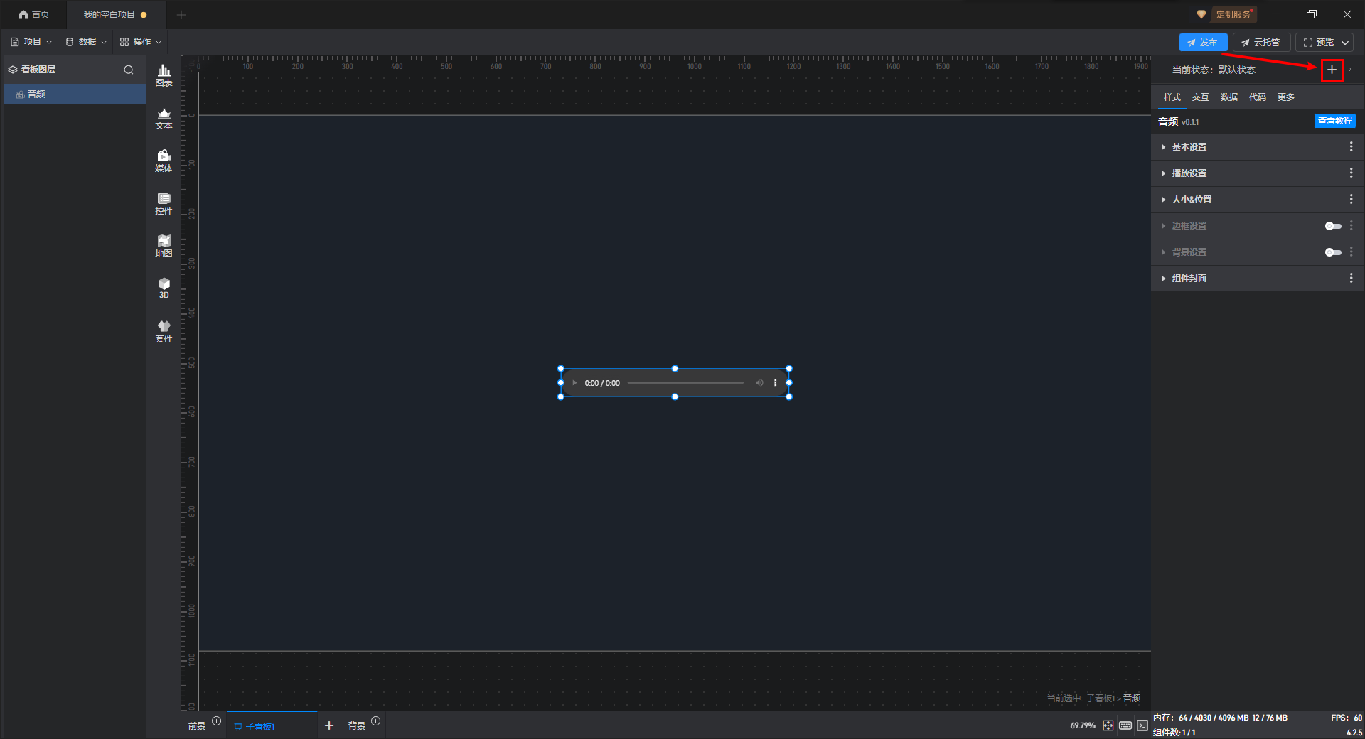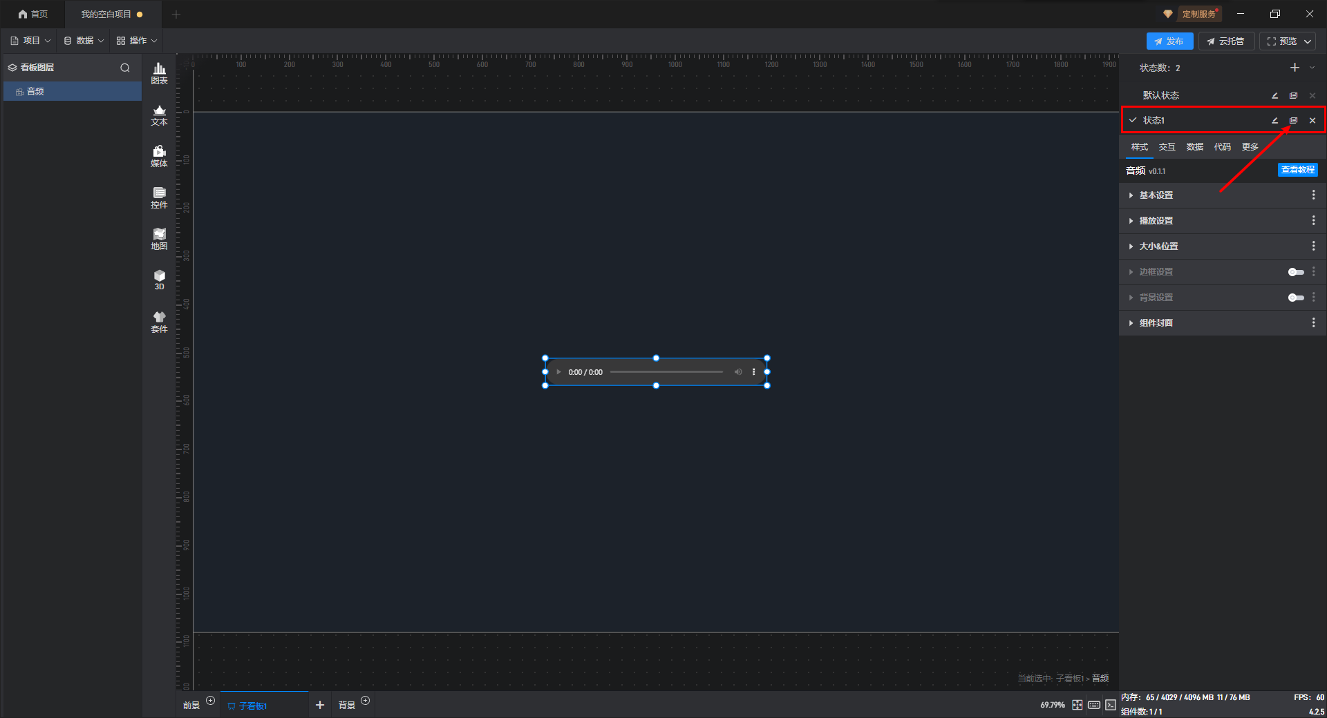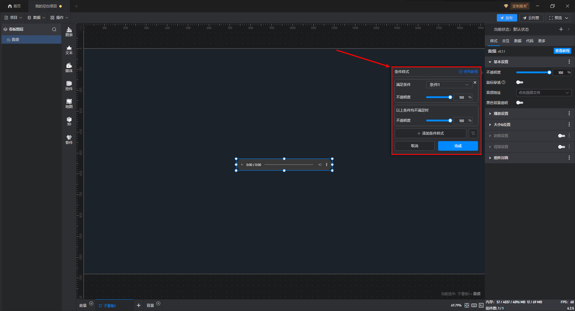 点击选中音频组件,在右侧样式“基本设置”项中,可以对“音频地址”进行设置。
