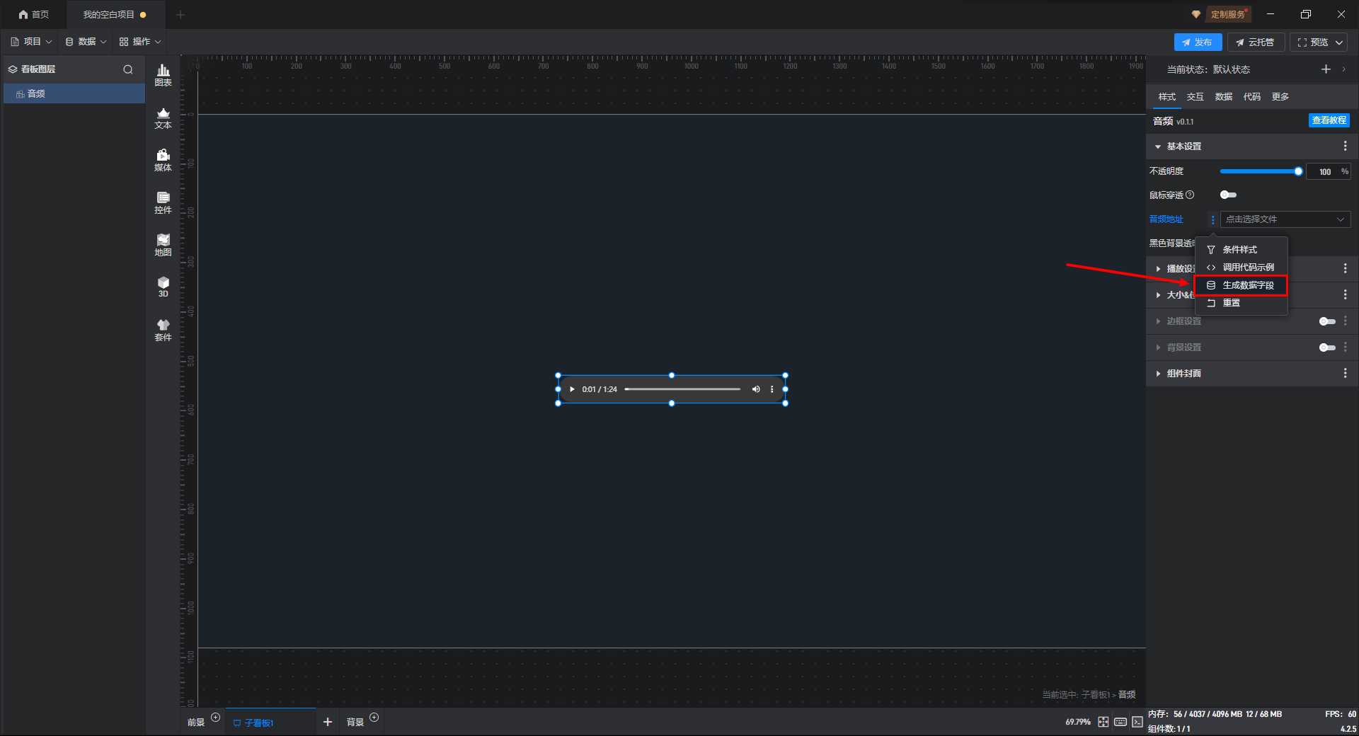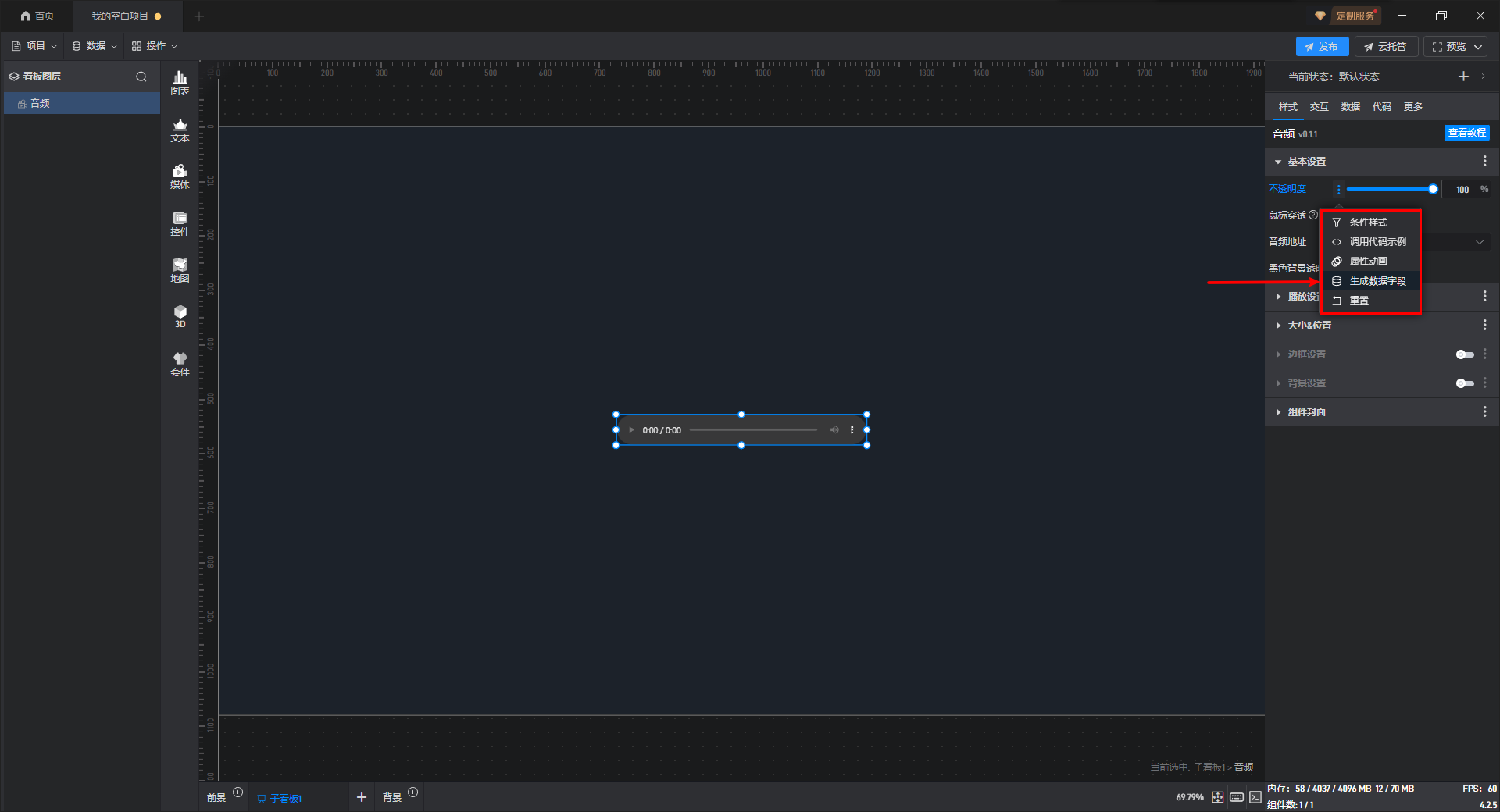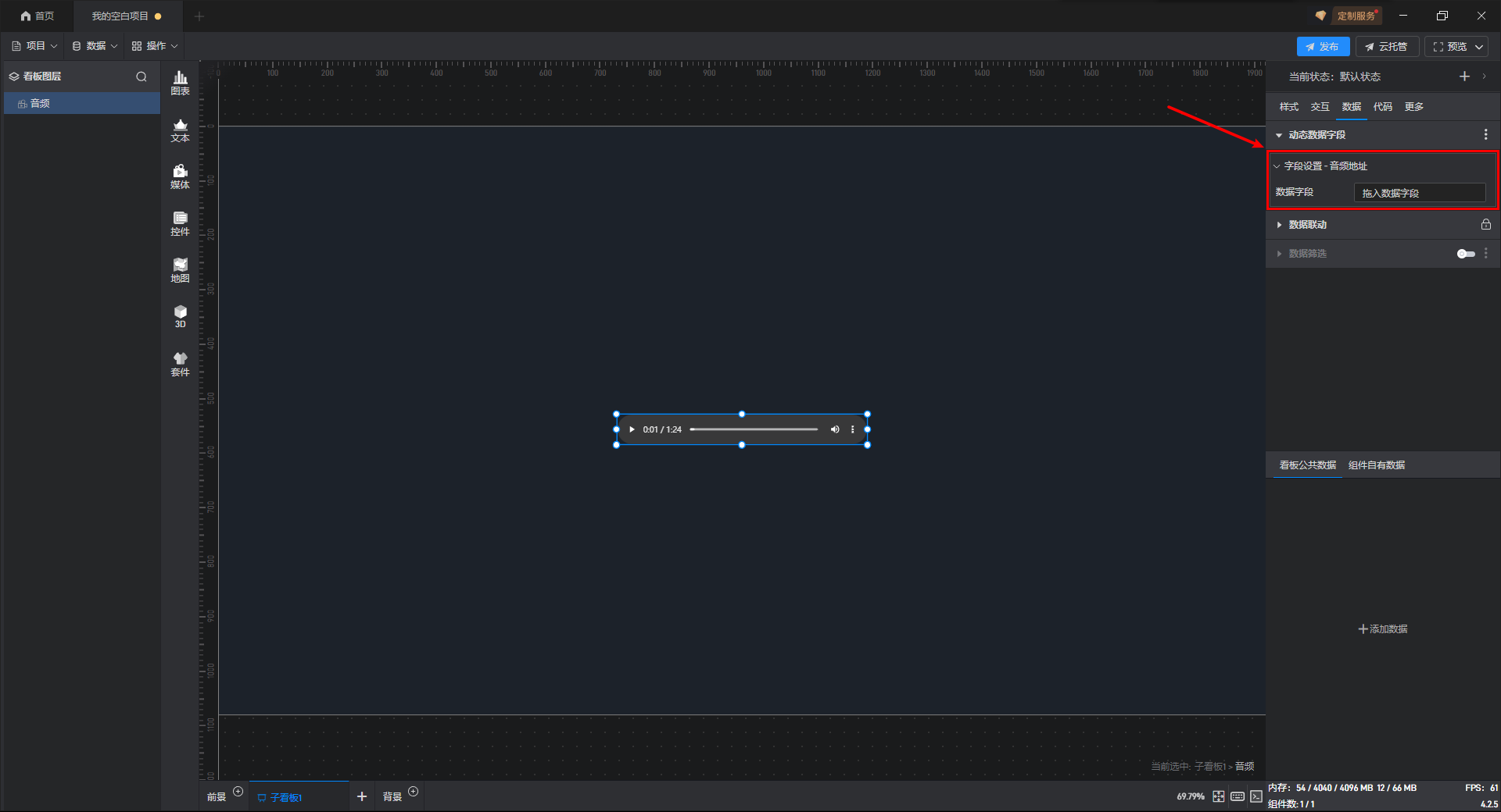 因为音频组件默认没有数据字段,此时我们需要用到“动态数据字段”的功能,这个功能是针对设置项生成一个关联的数据字段,从而可以通过数据字段来对设置项的内容进行控制。