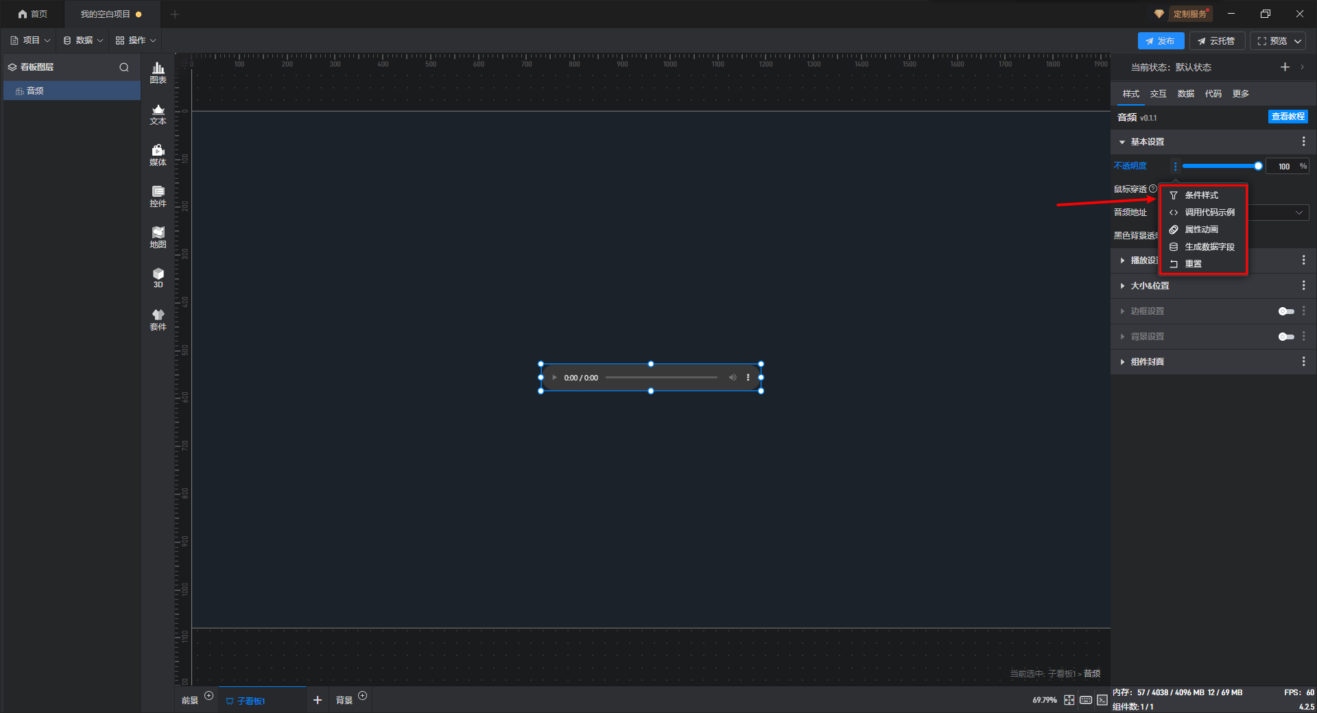 有一些设置项的条件设置方式直接显示在设置项中,这种就可以直接在外面设置,但音频组件的条件样式只能通过方式 1 进行设置。