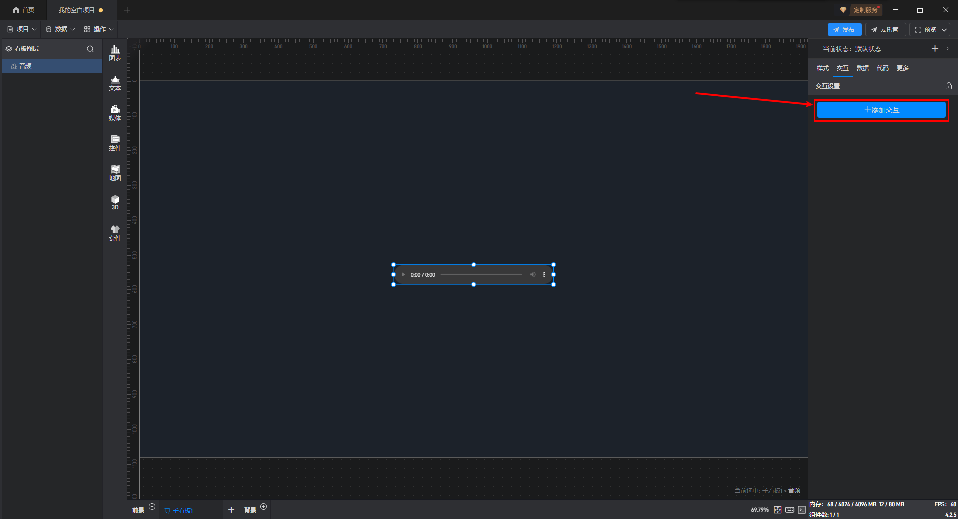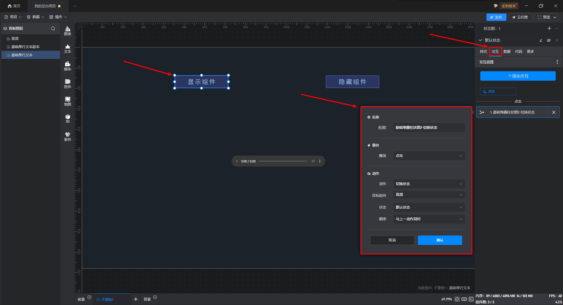点击选中组件,在右侧“交互”设置窗口中可以对当前组件的交互进行添加和删除。