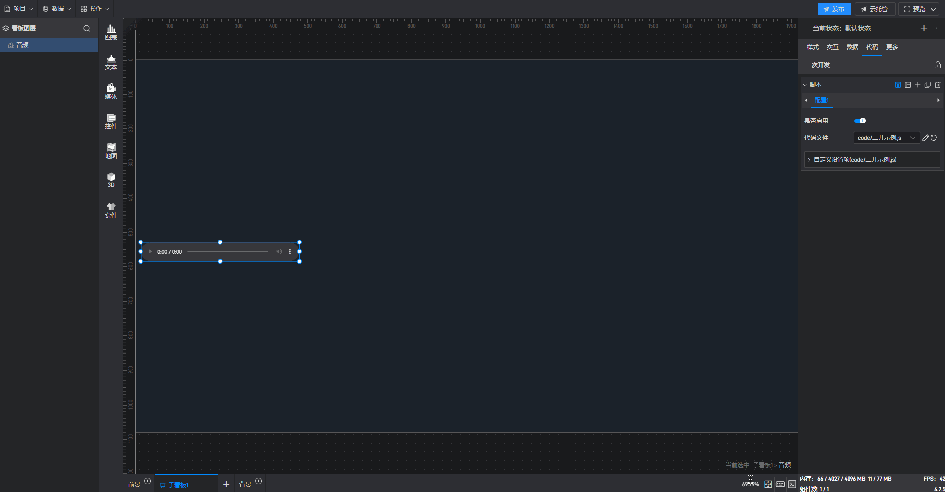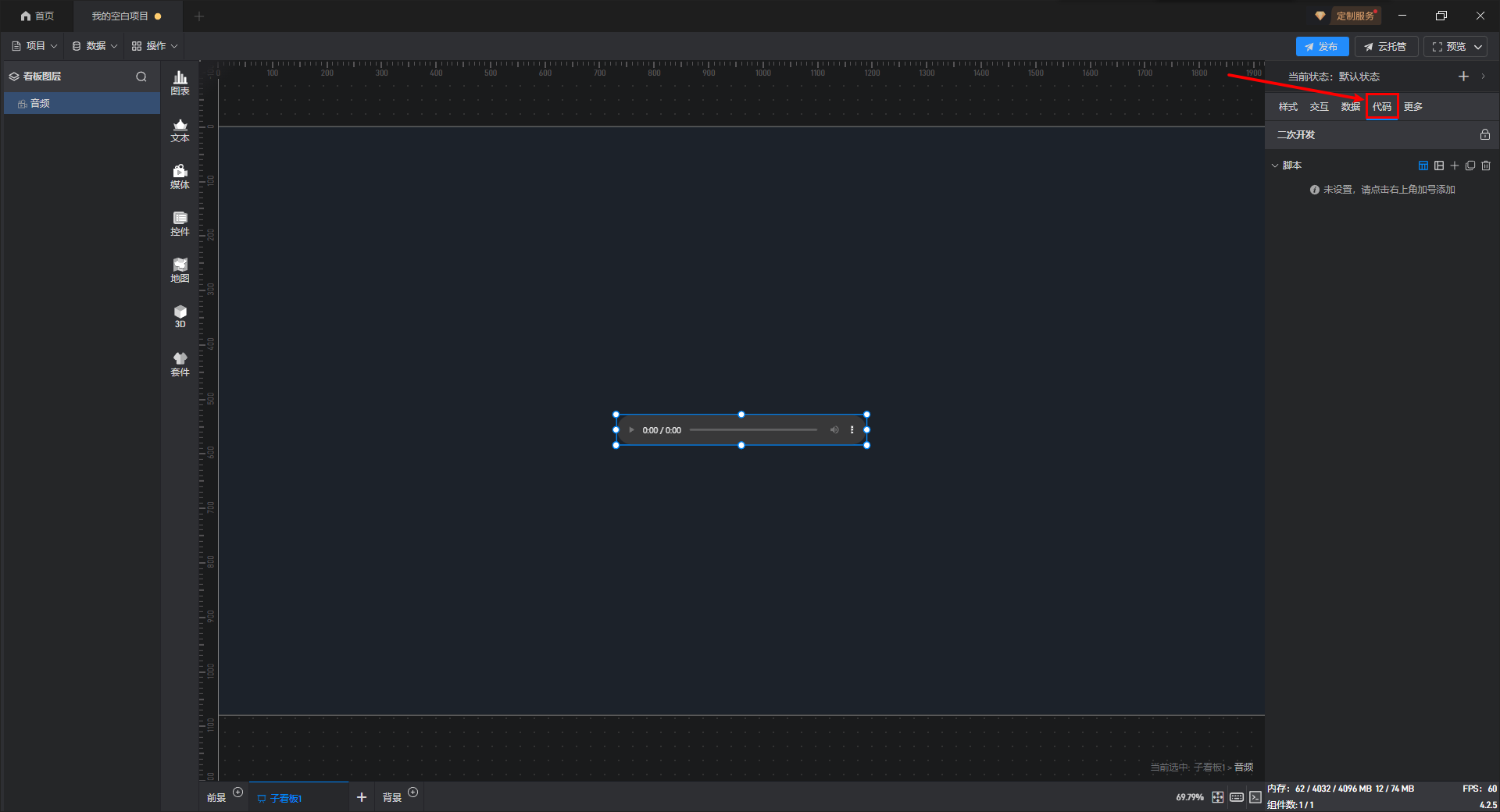 点击选中组件,在右侧“代码”设置窗口中可以对组件进行二次开发设置。