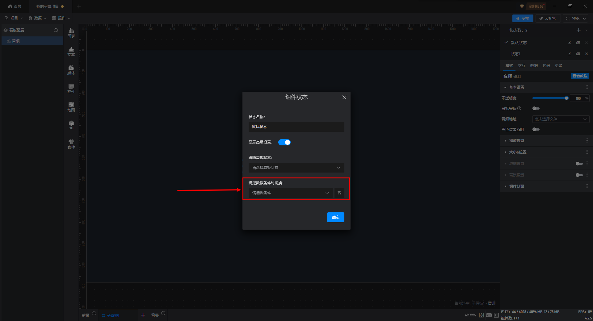 在这里我们可以选择已设置的数据条件,从而在数据条件满足时,组件的状态就会发生变化。