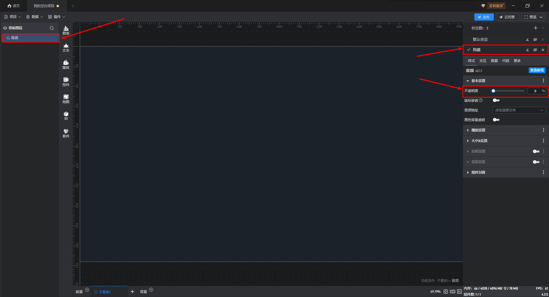 添加一个数值为“0”的数据到数据字段中,可以看到通过动态数据字段将不透明度的数值修改为“0”,从而使组件隐藏。