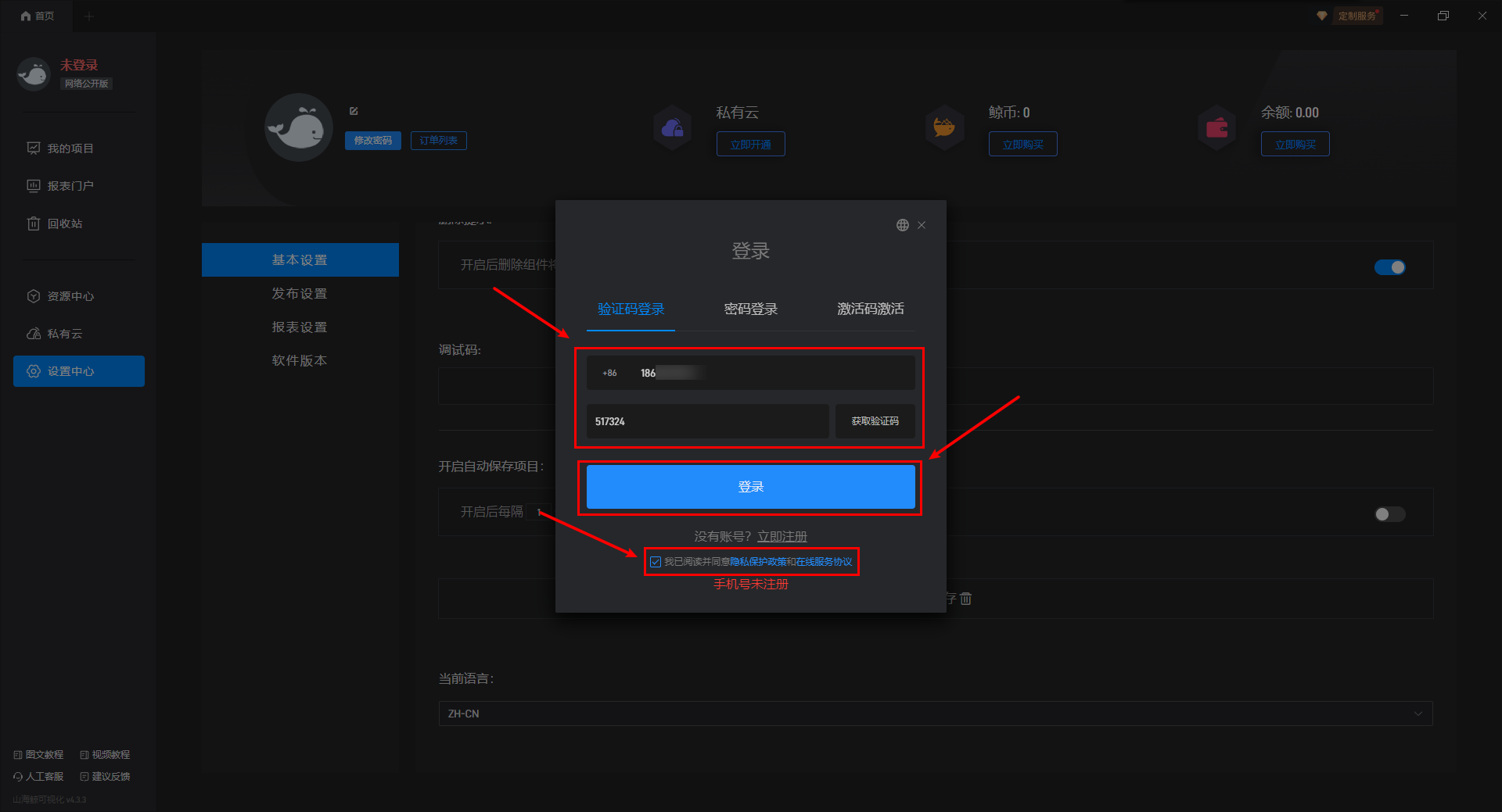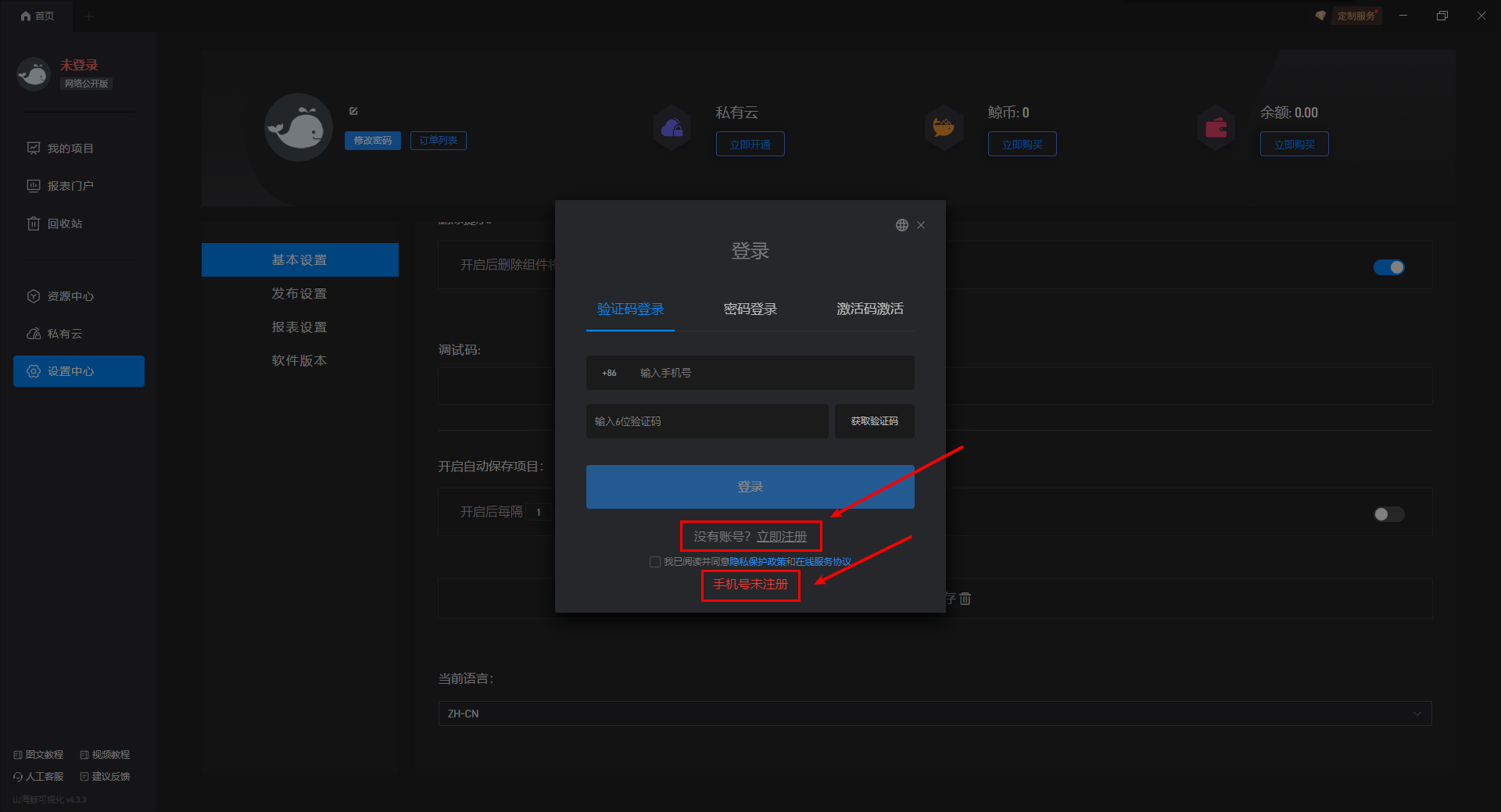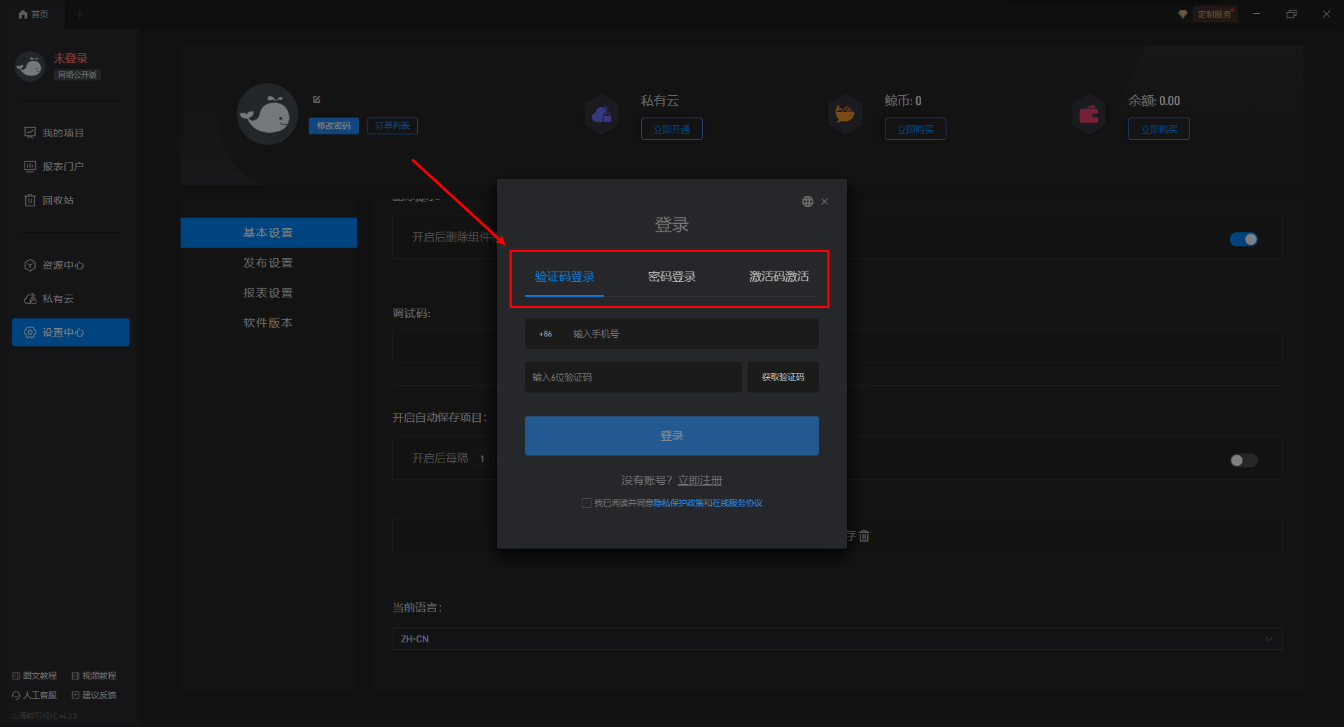 首次,进入山海鲸可视化,需要登录山海鲸账号,支持验证码登录、密码登录、激活码激活三种登录方式,其中验证码和密码登录适用于网络公开版,激活码激活适用于局域网版。