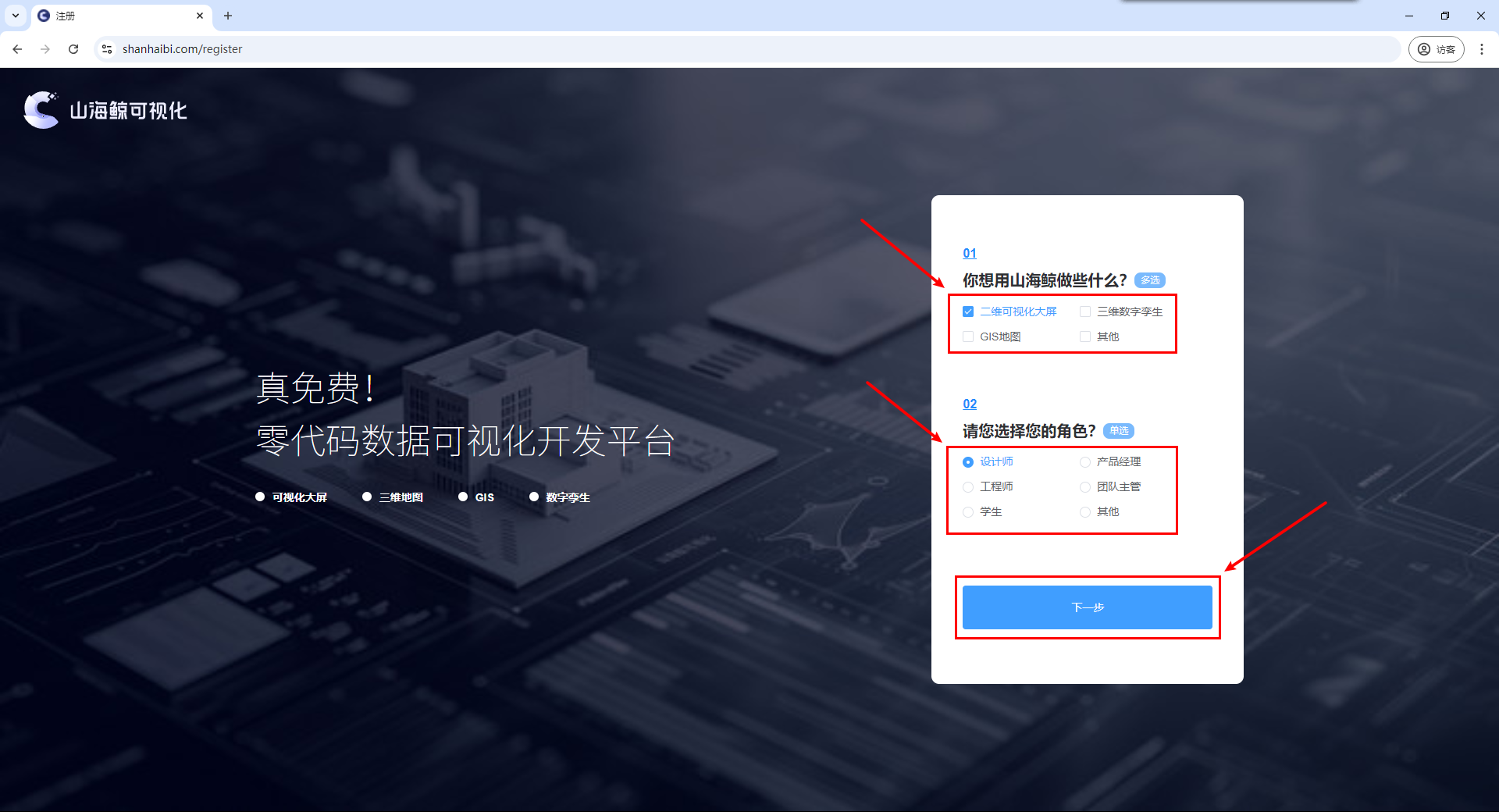 按实际情况在“你想用山海鲸做些什么?”和“请您选择您的角色?”中勾选对应选项后,点击“下一步”。