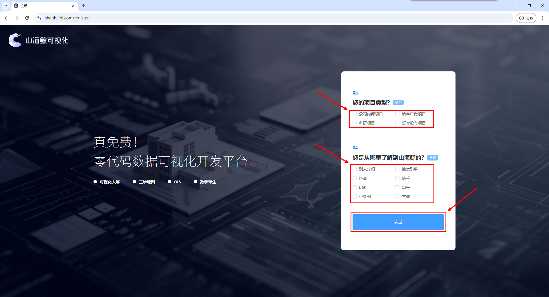 按实际情况在“您的项目类型?”和“您是从哪里了解到山海鲸的?”中勾选对应选项后,点击“完成”,即可完成注册。