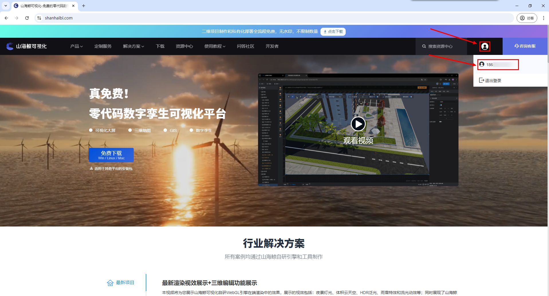 注册完成后会自动跳转到山海鲸可视化官网,点击右上角图标可以查看当前登录的账号。
