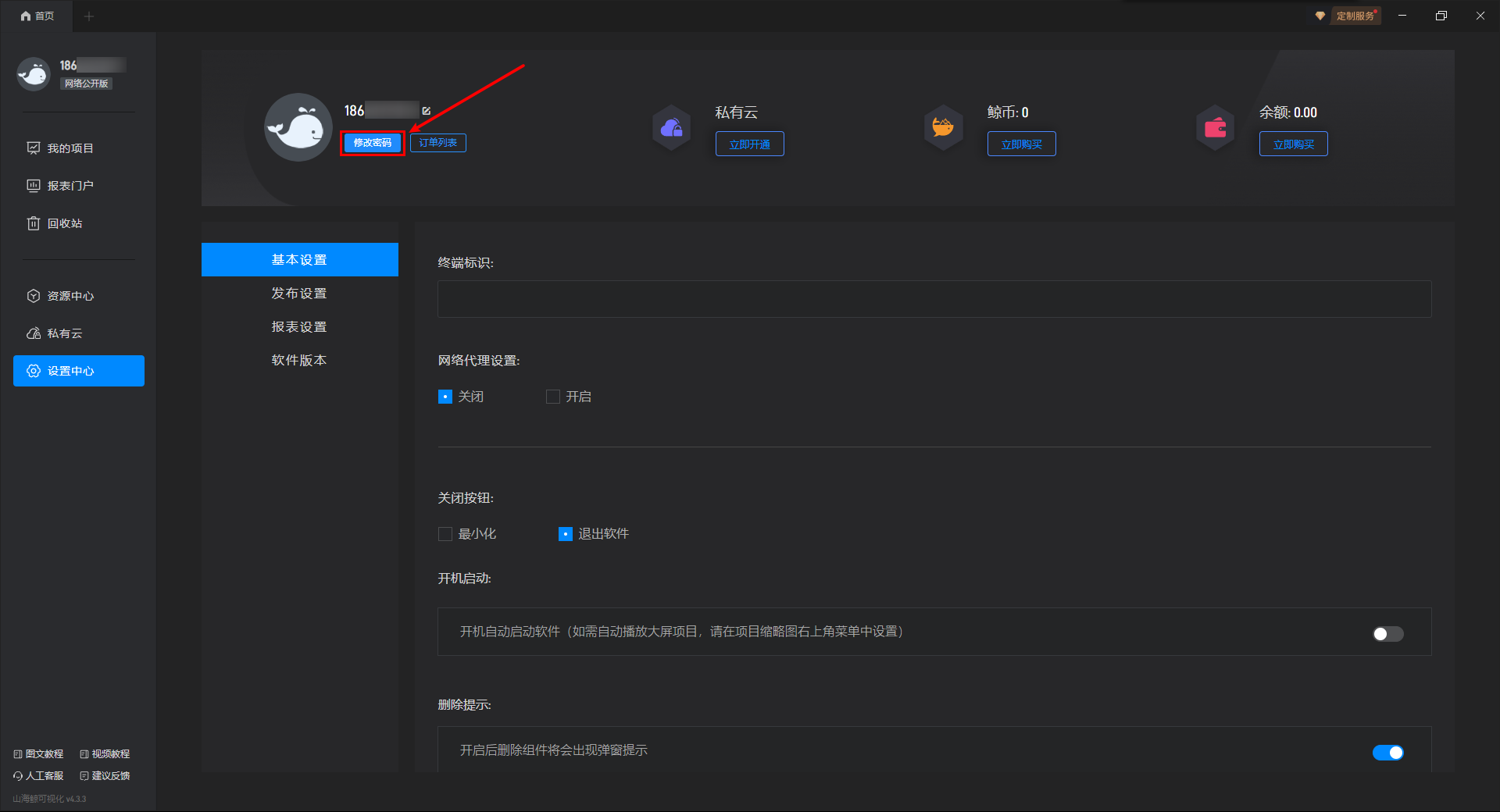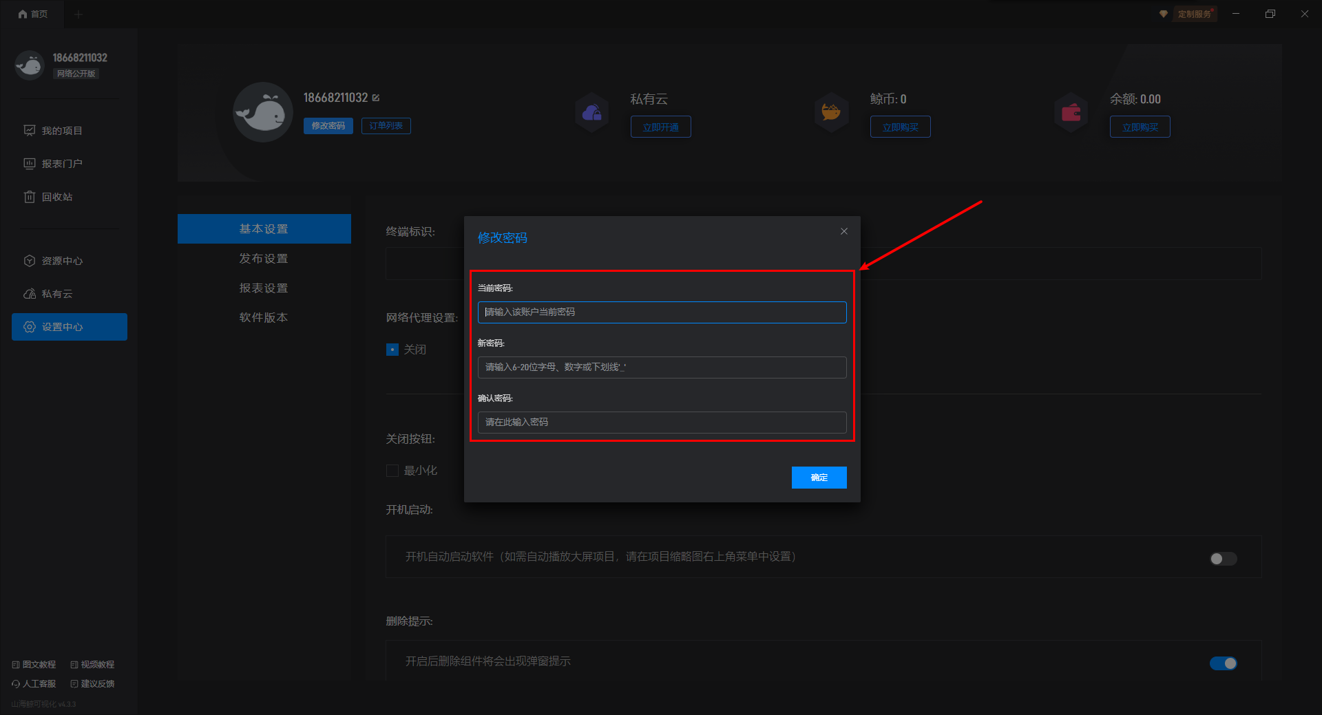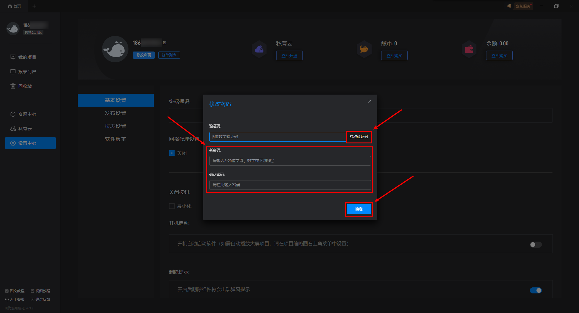 通过手机号验证码首次进入山海鲸可视化后,可以进入“设置中心”,点击“修改密码”来设置一个密码。