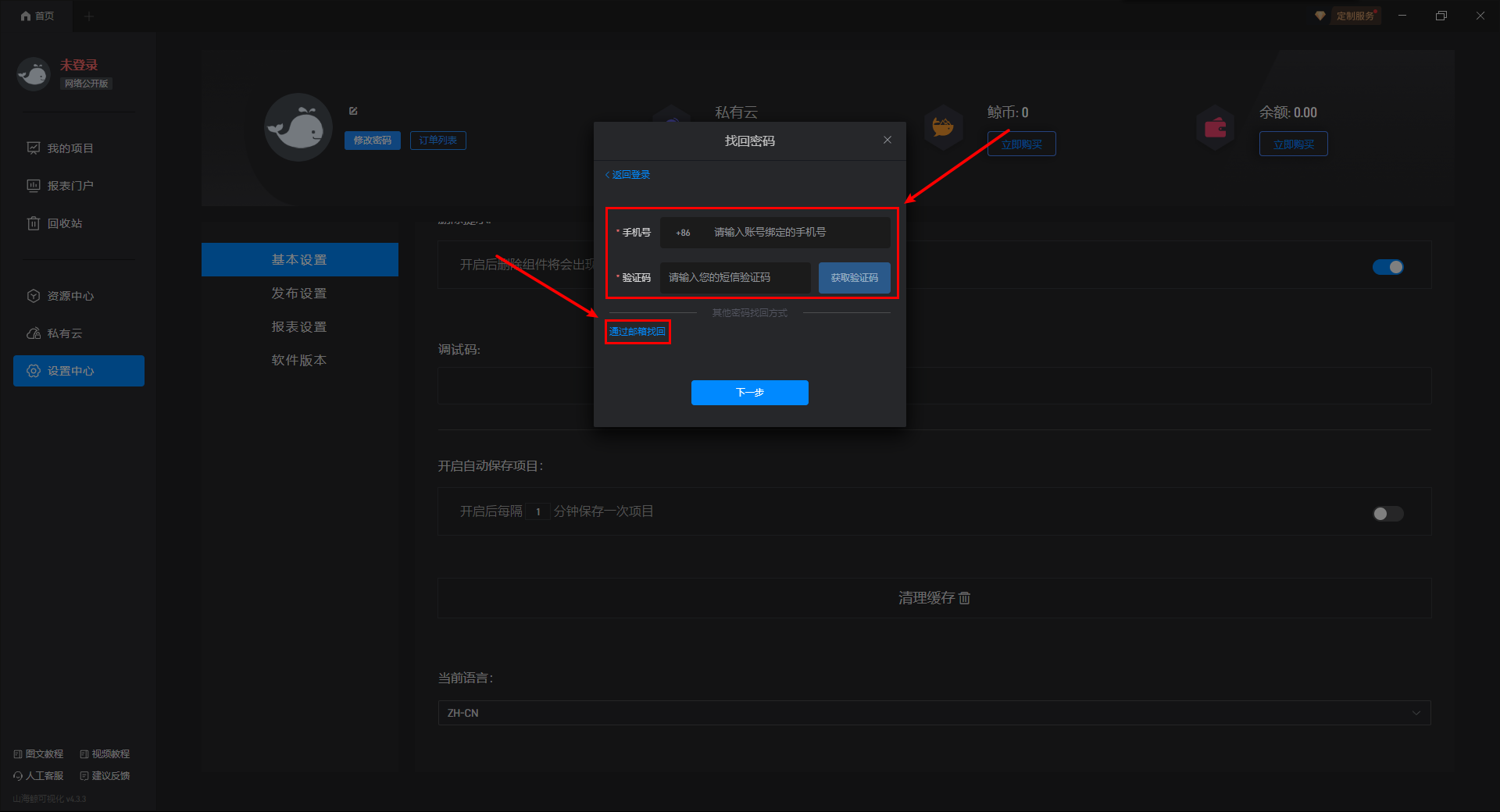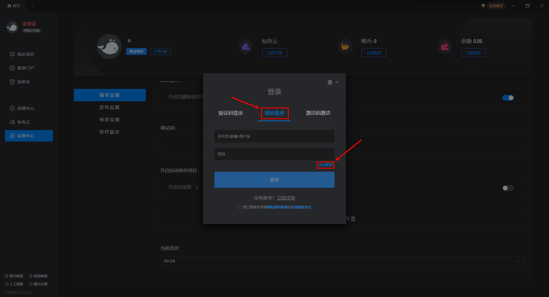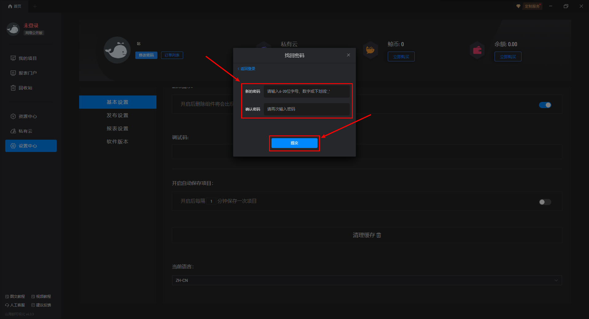 山海鲸可视化拥有网络公开版和局域网版两种版本,其中网络公开版需要先注册账号然后登录,登录后可以对密码进行设置、修改、找回。