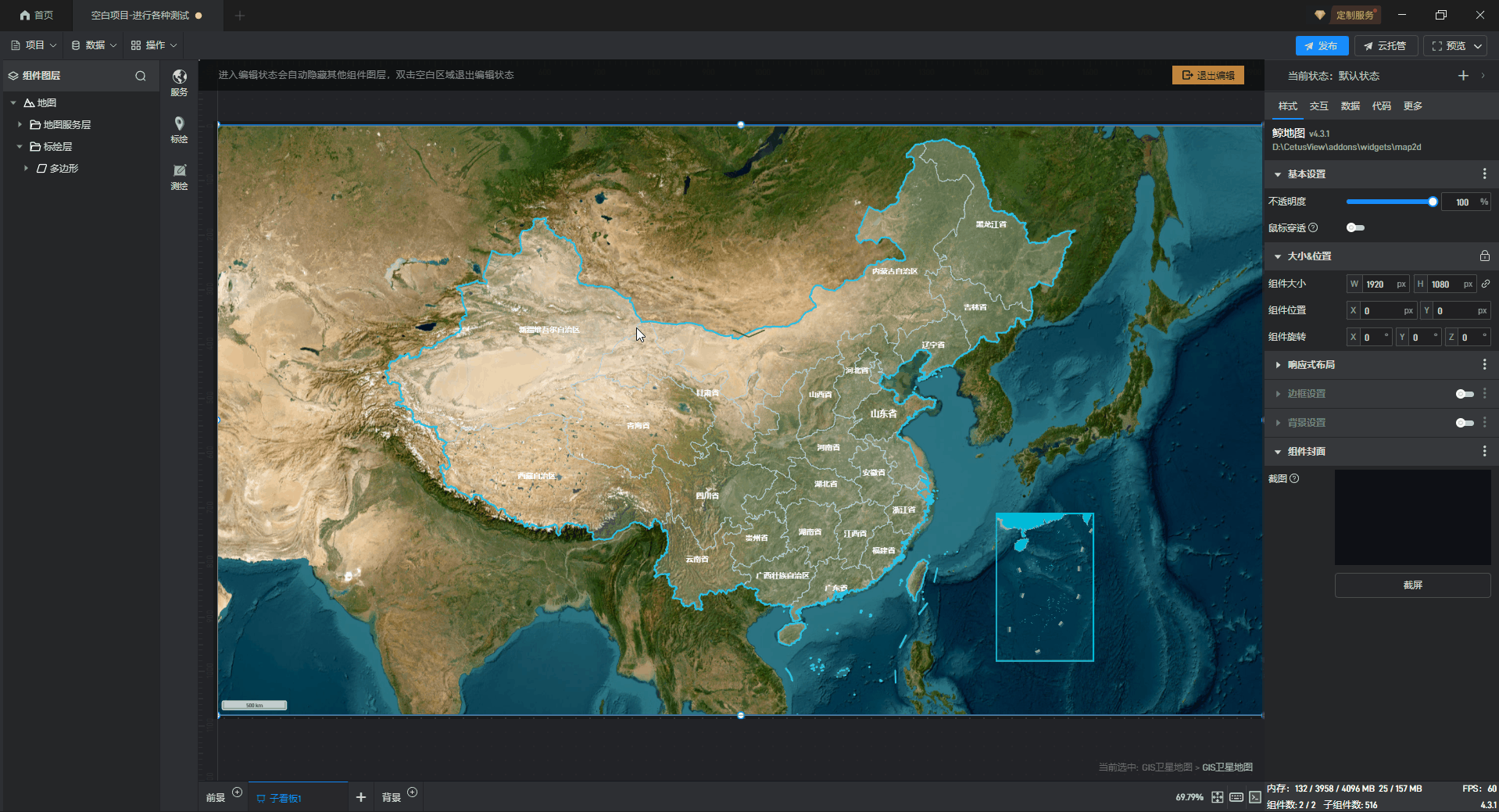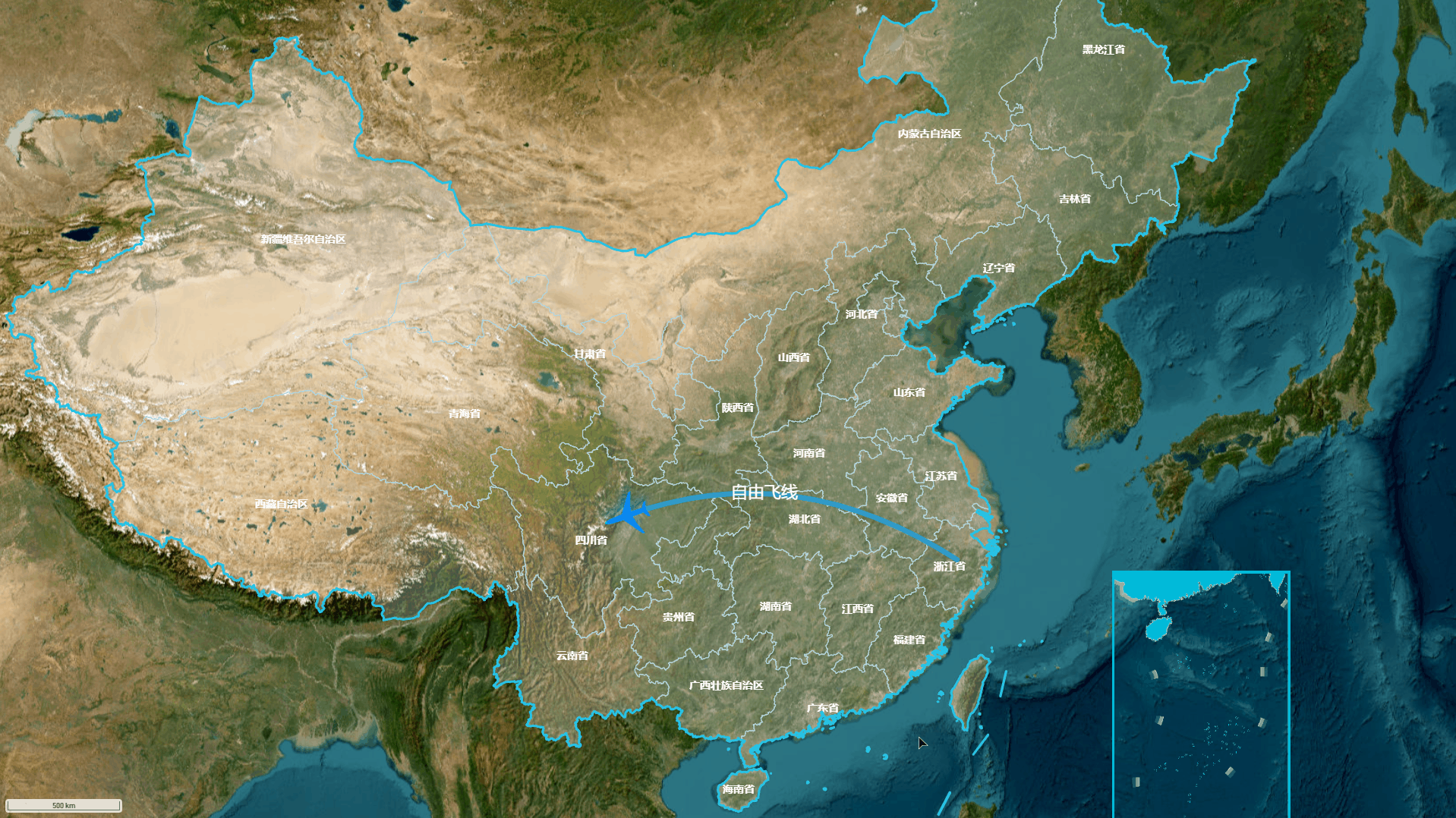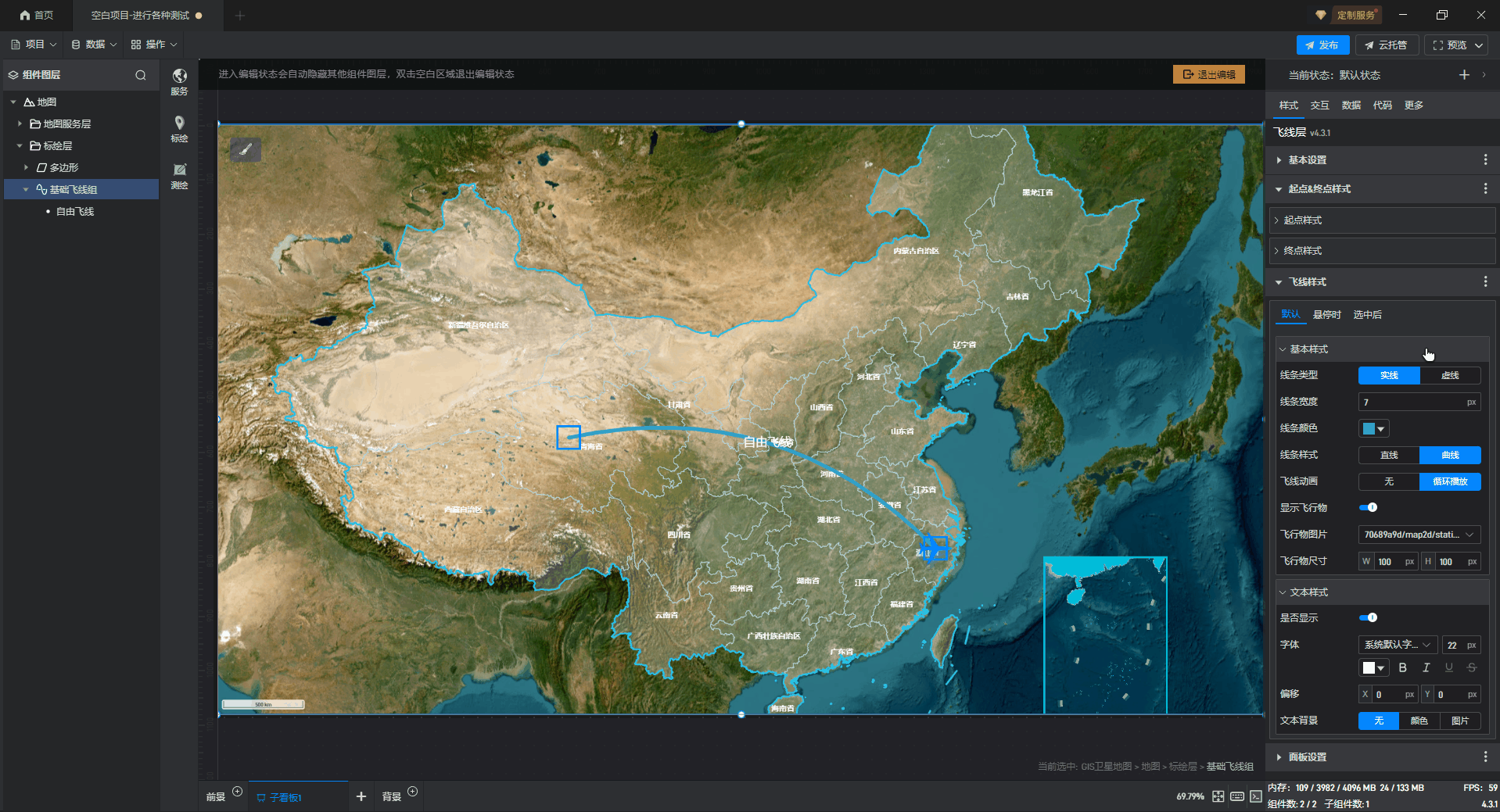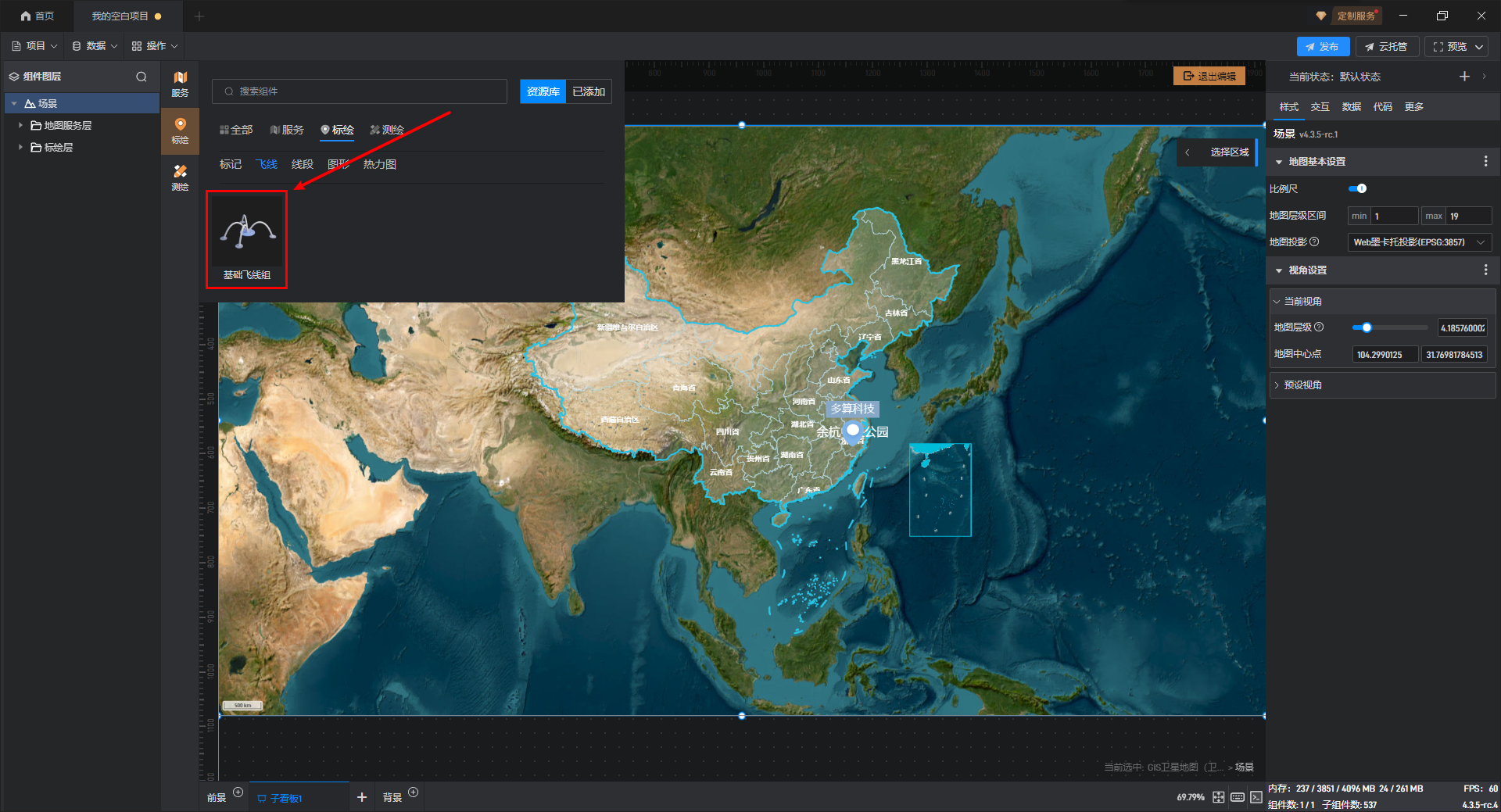 在鲸地图组件的编辑界面左侧功能菜单栏标绘中点击“飞线”即可在场景中添加飞线。