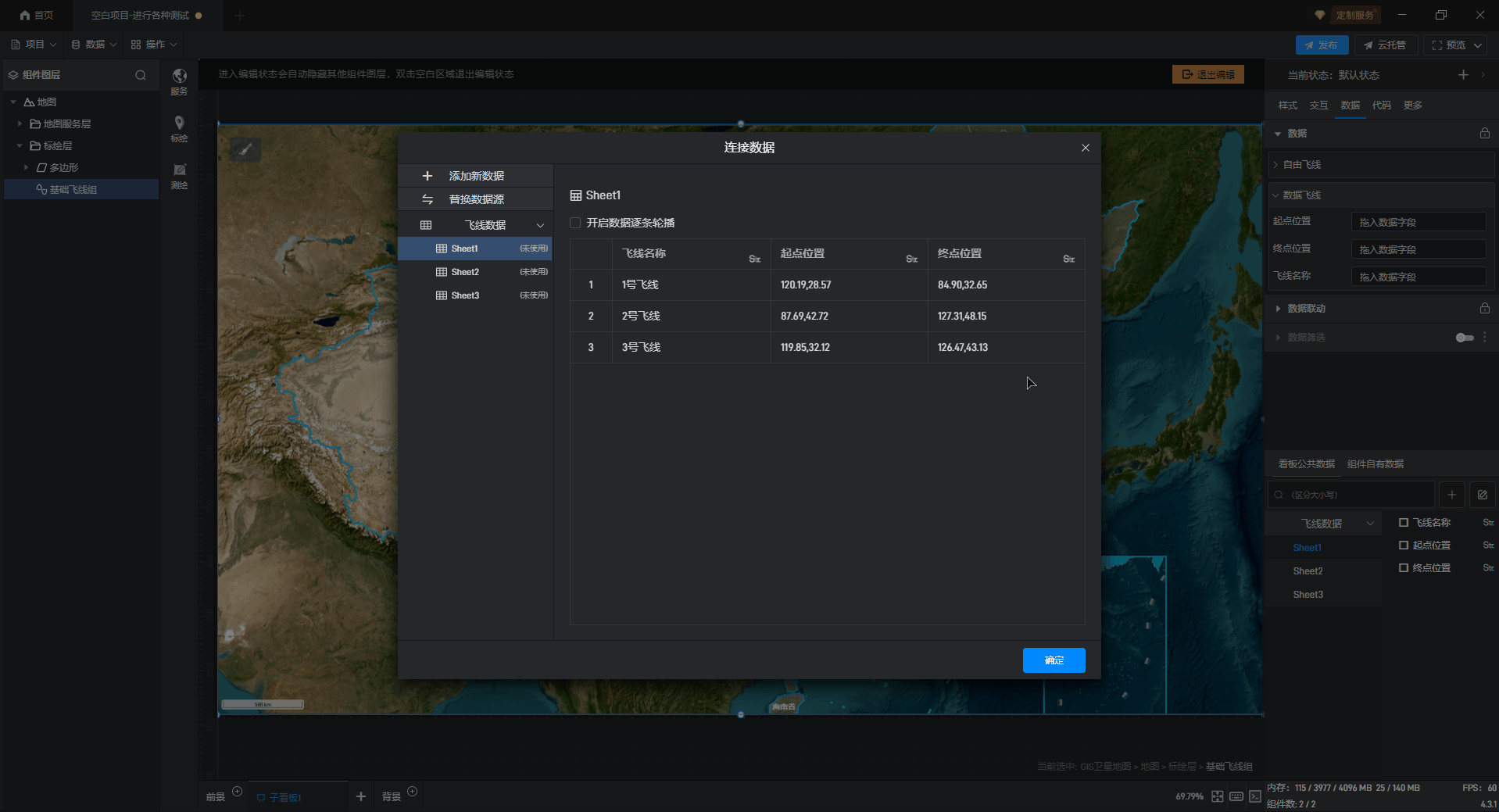 选中左侧组件图层中的“基础飞线组”,将提前准备好的数据绑定到对应的数据字段中,即可自动生成飞线,如下图所示: