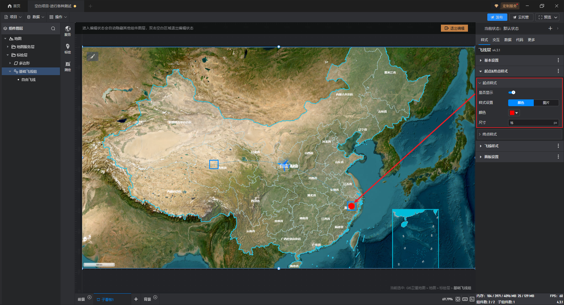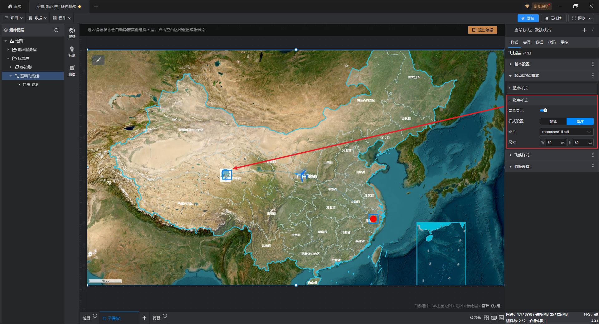 飞线的添加需要确定“起点”和“终点”,通过鼠标点击可以选择起点和终点,添加后还可以详细调整每个飞线的经纬度坐标,如下图所示: