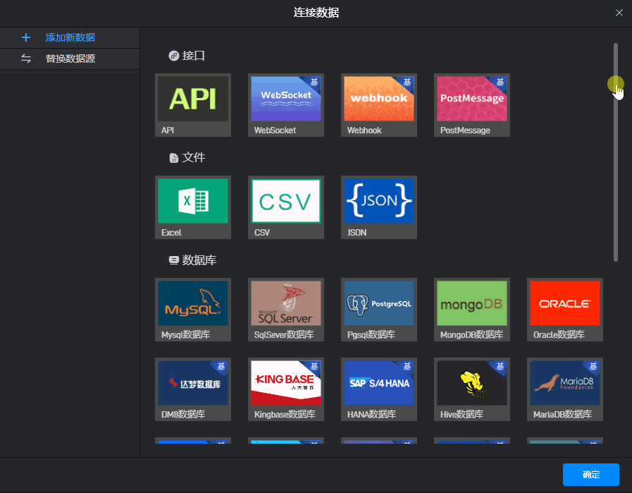 动态数据源包括: API、WebSocket、Webhook、PostMessage 接口,MySQL、达梦、InfluxDB、OceanBase、ClickHouse 等多种数据库,以及山海鲸数据管家。