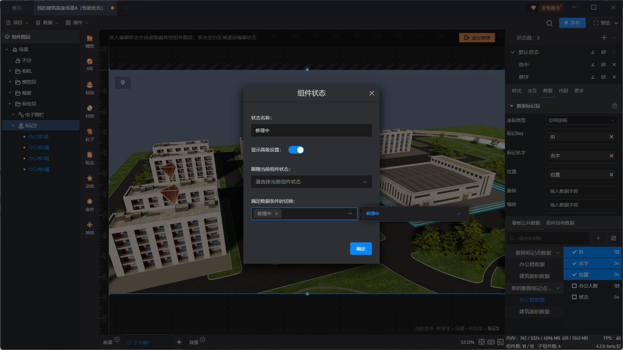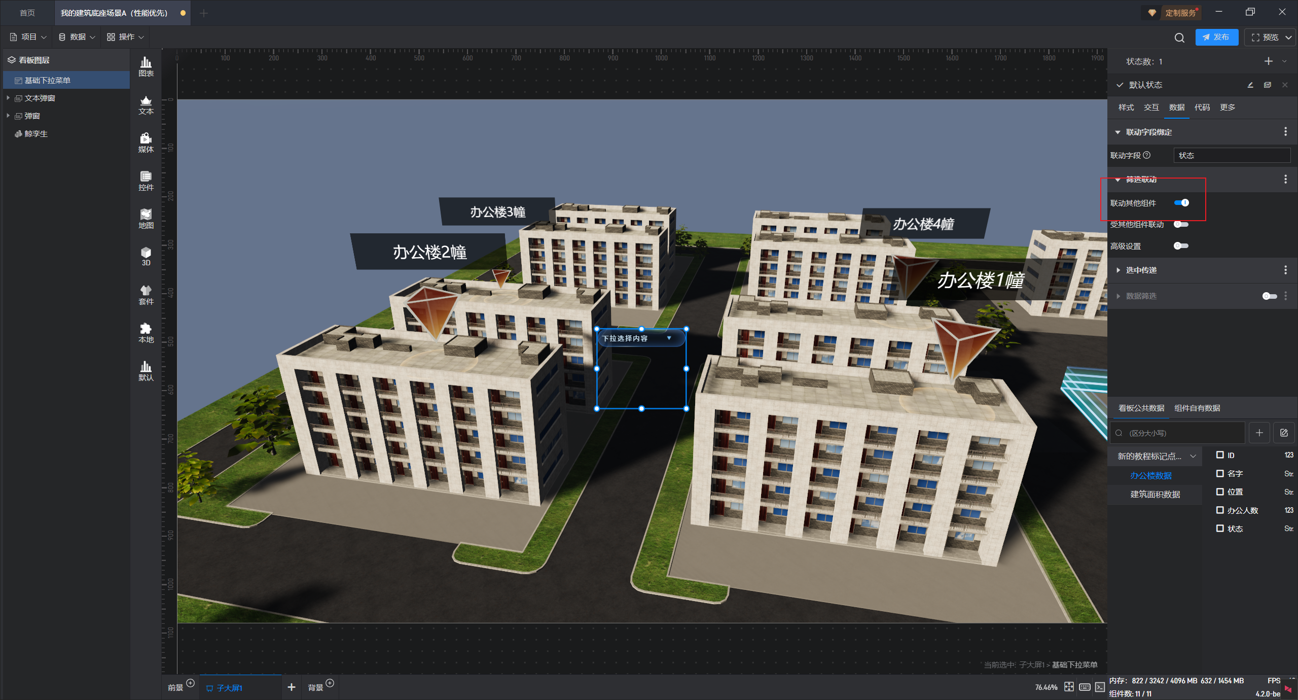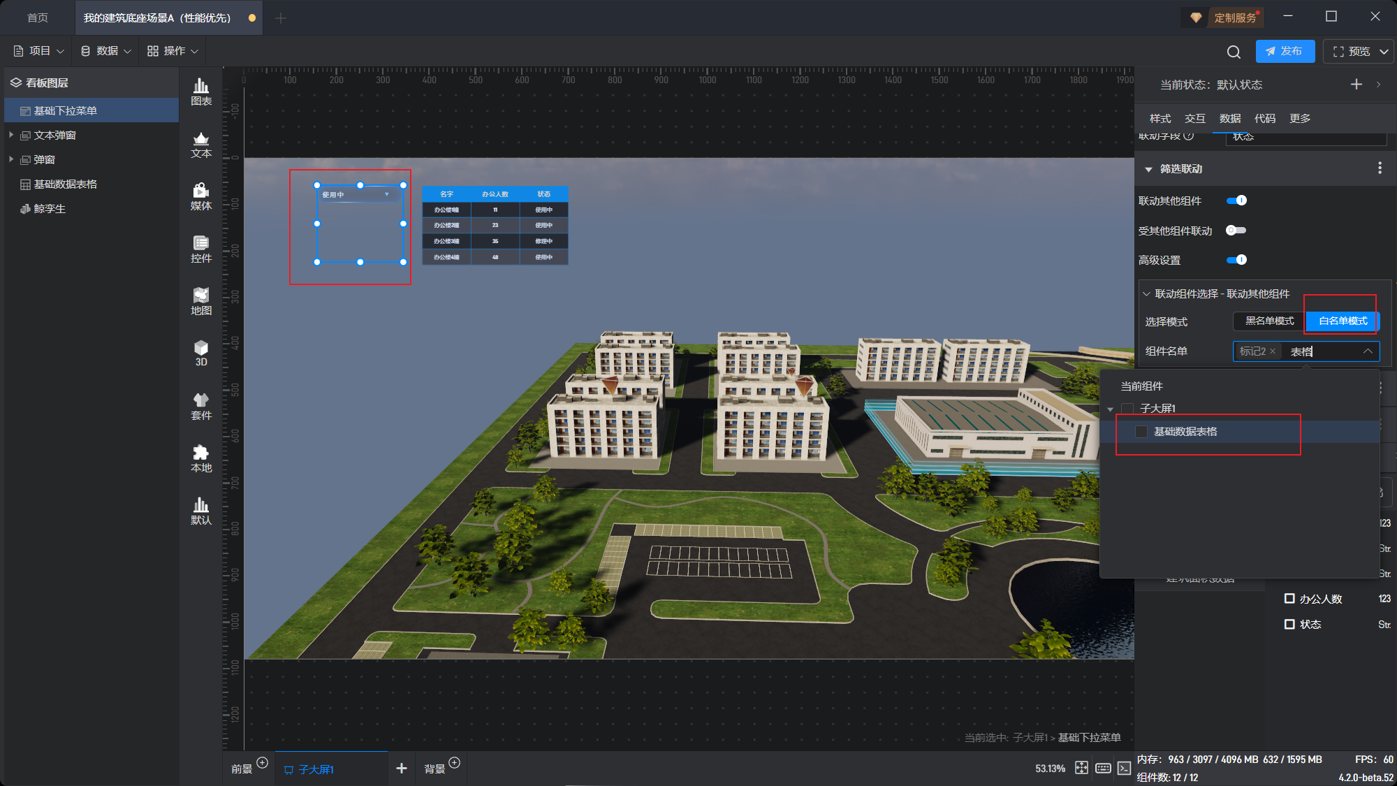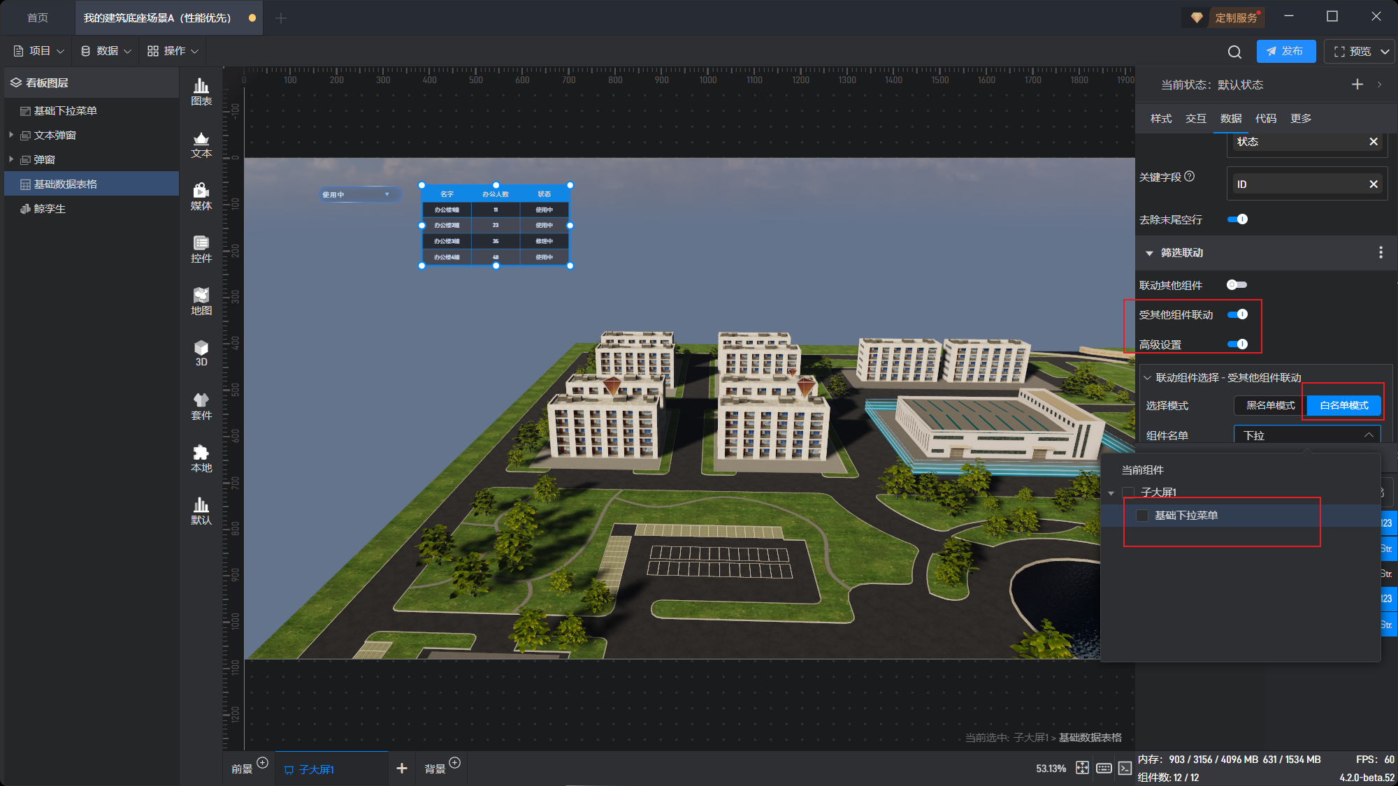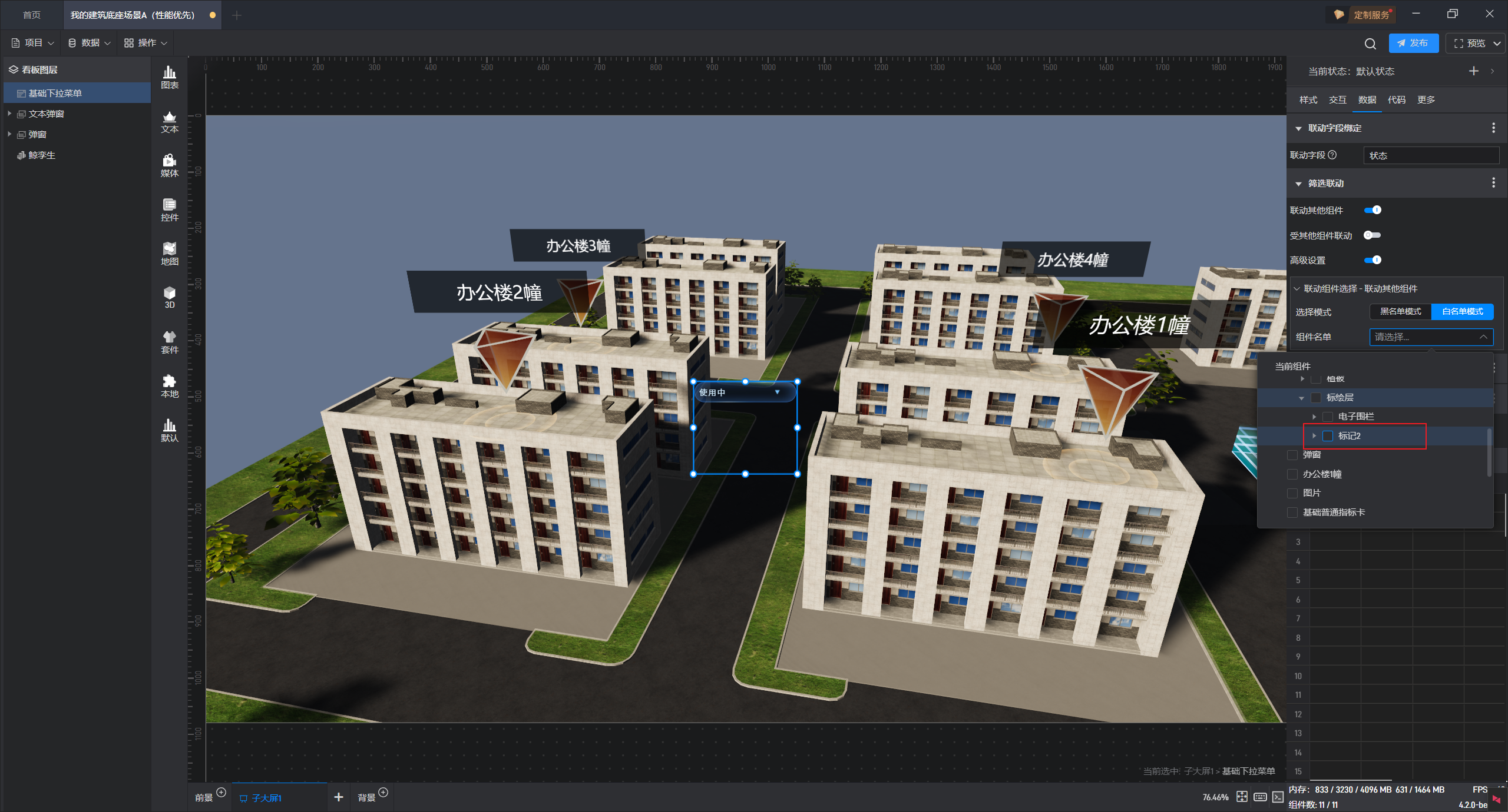 然后我们双击进入 3D 场景编辑,将标记组也打开受其他组件联动,同样,如果希望精准控制,也可以打开高级设置,选择受其他组件联动选项卡,并切换成白名单模式,选择为下拉组件:
