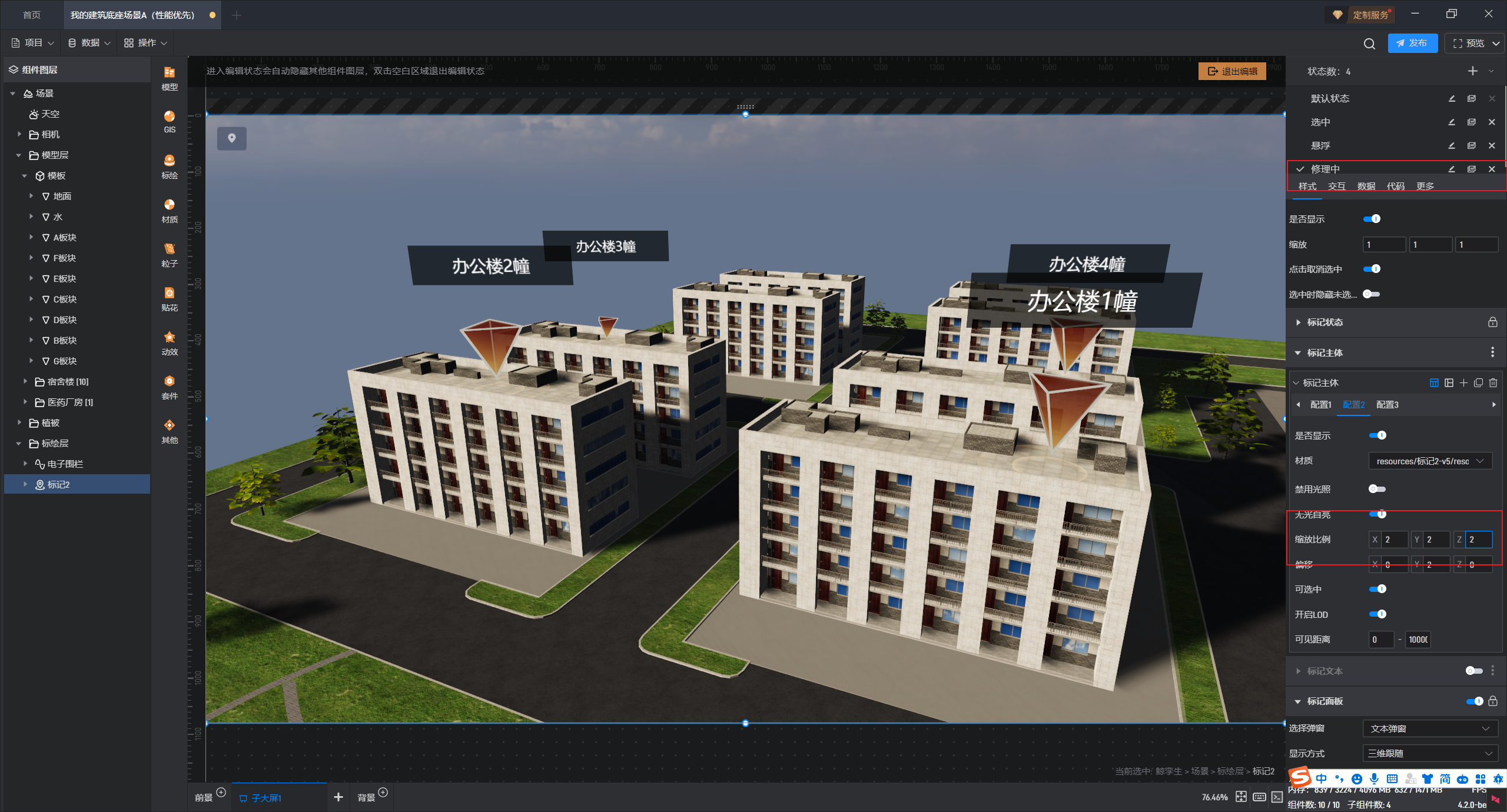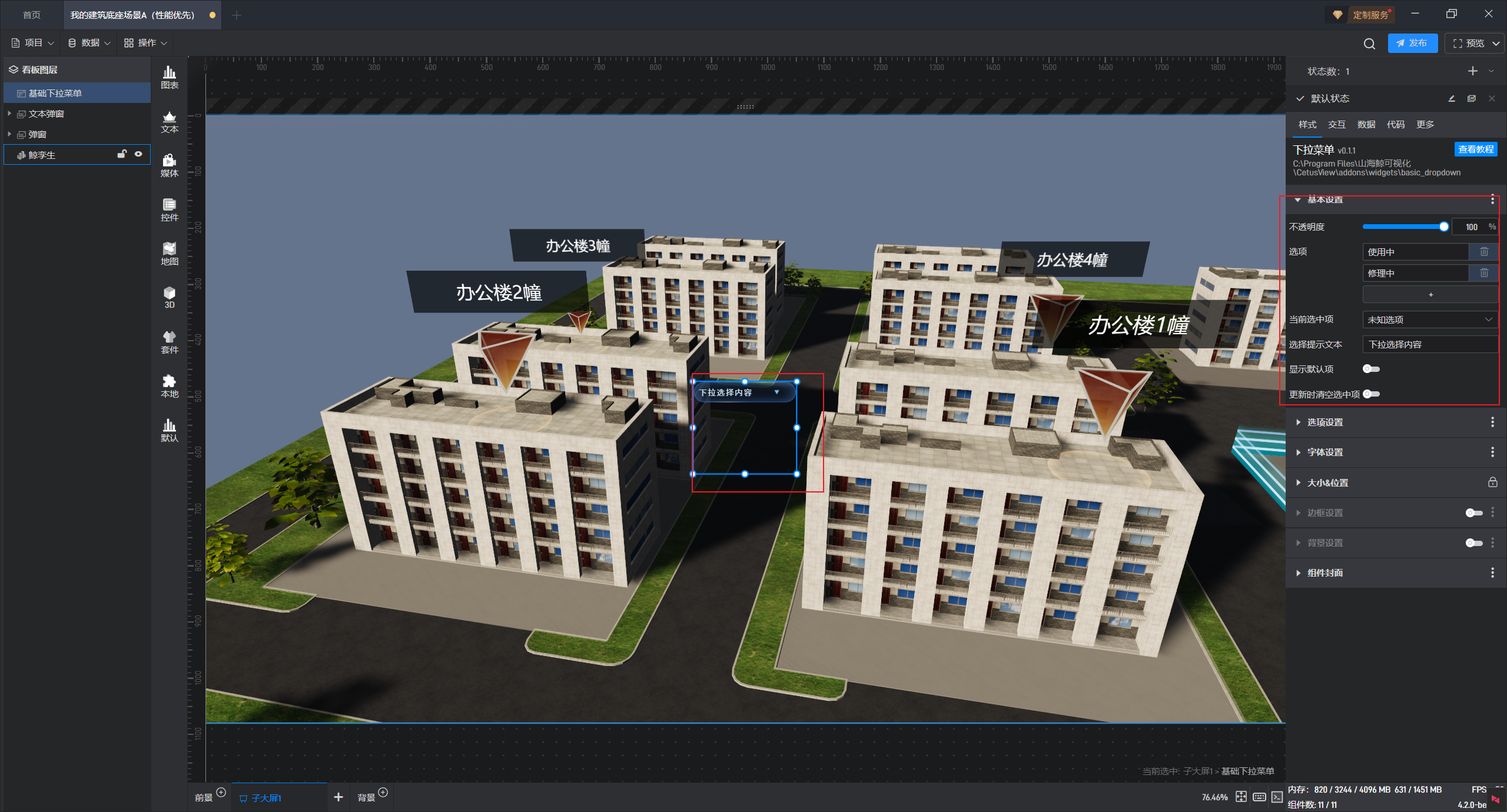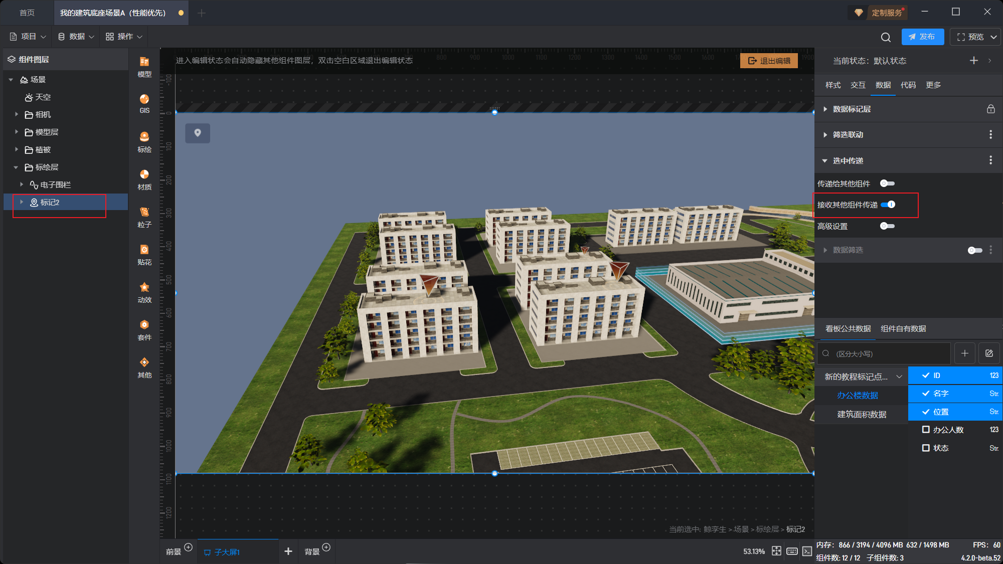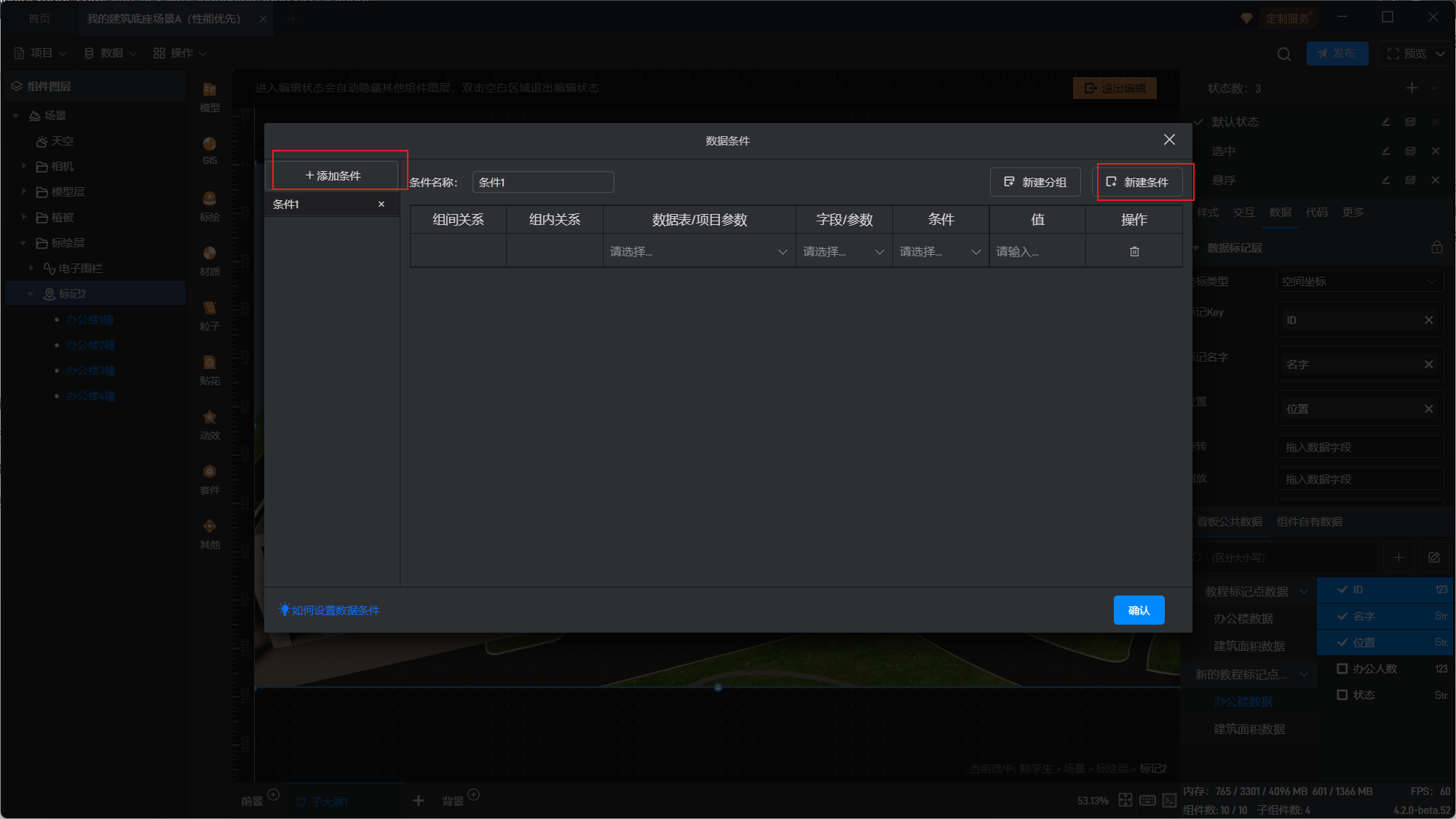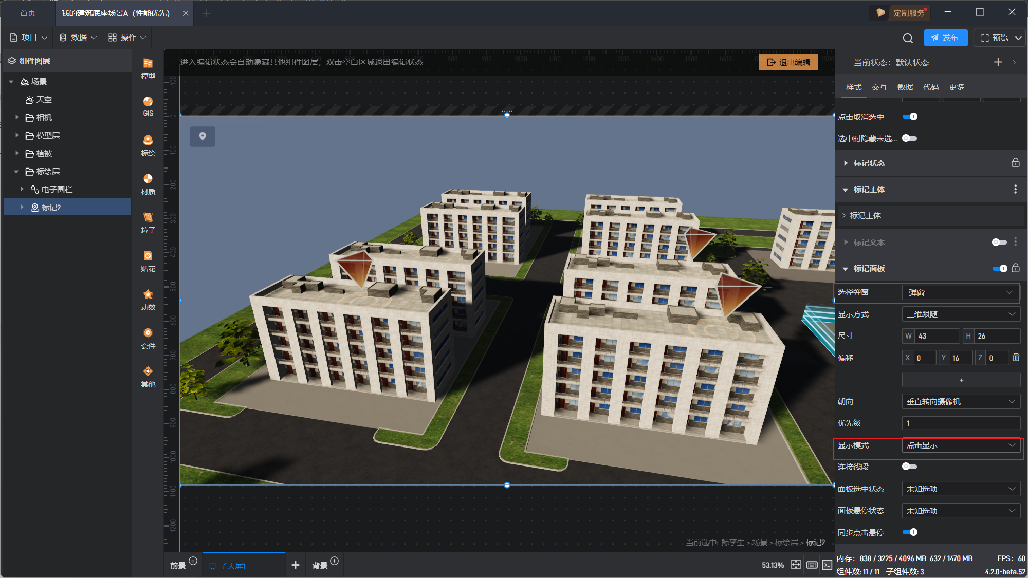 然后我们双击进入 3D 场景编辑,将标记组也打开受其他组件联动,同样,如果希望精准控制,也可以打开高级设置,选择受其他组件联动选项卡,并切换成白名单模式,选择为下拉组件: