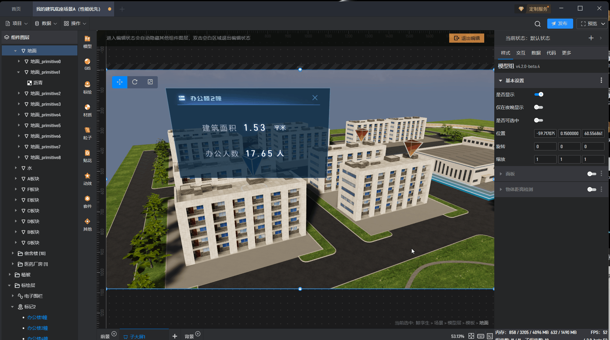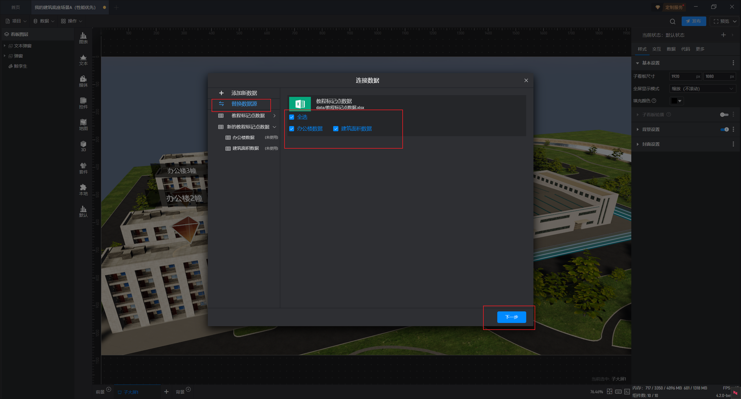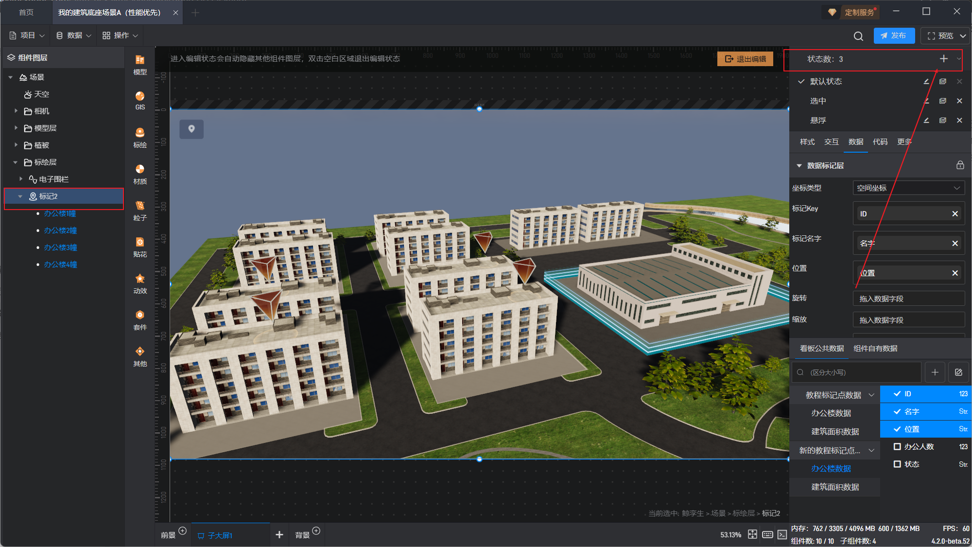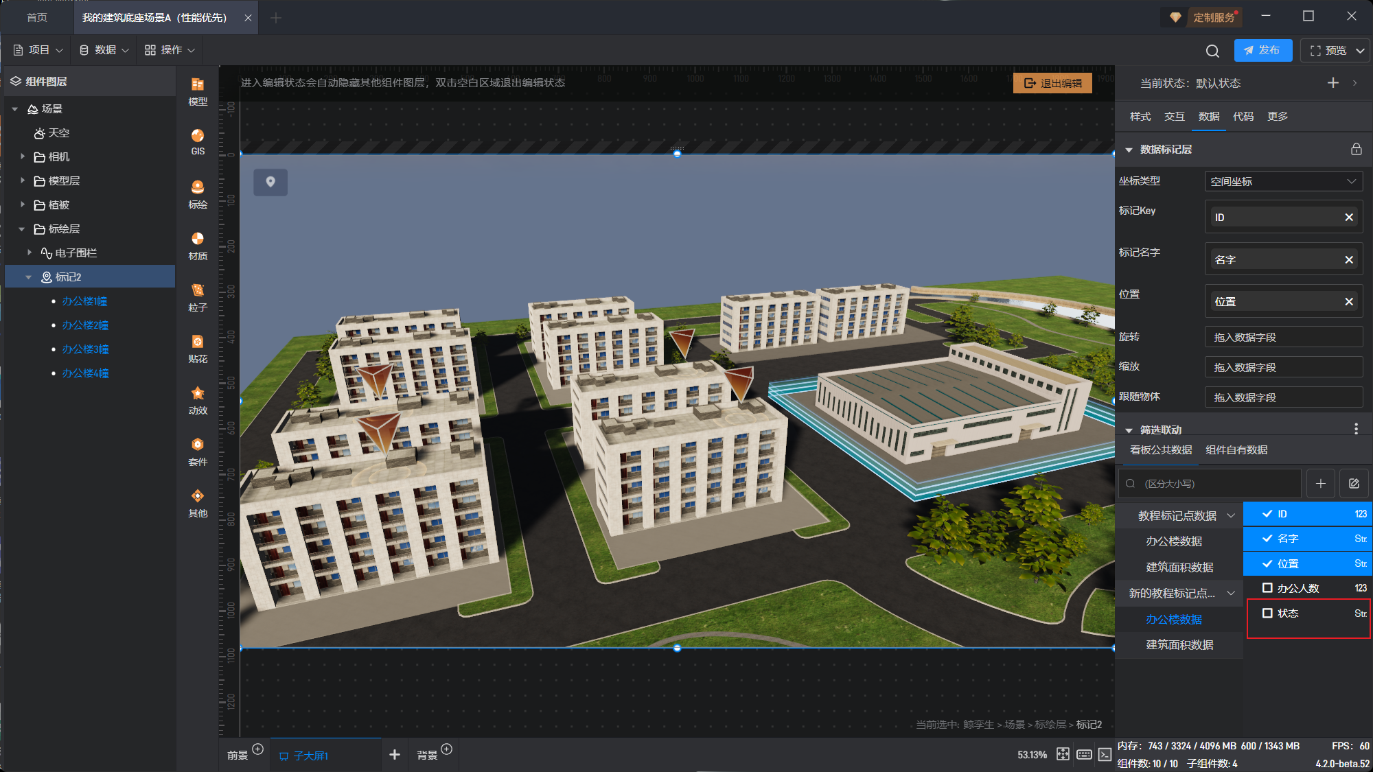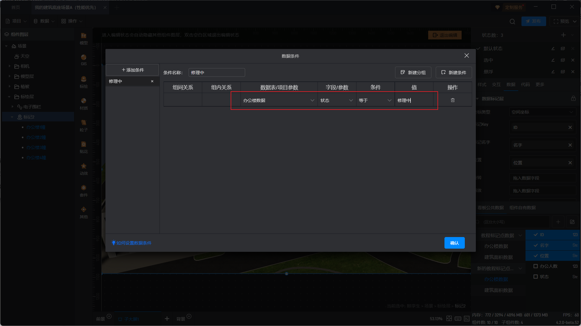 然后我们双击进入 3D 场景编辑,将标记组也打开受其他组件联动,同样,如果希望精准控制,也可以打开高级设置,选择受其他组件联动选项卡,并切换成白名单模式,选择为下拉组件: