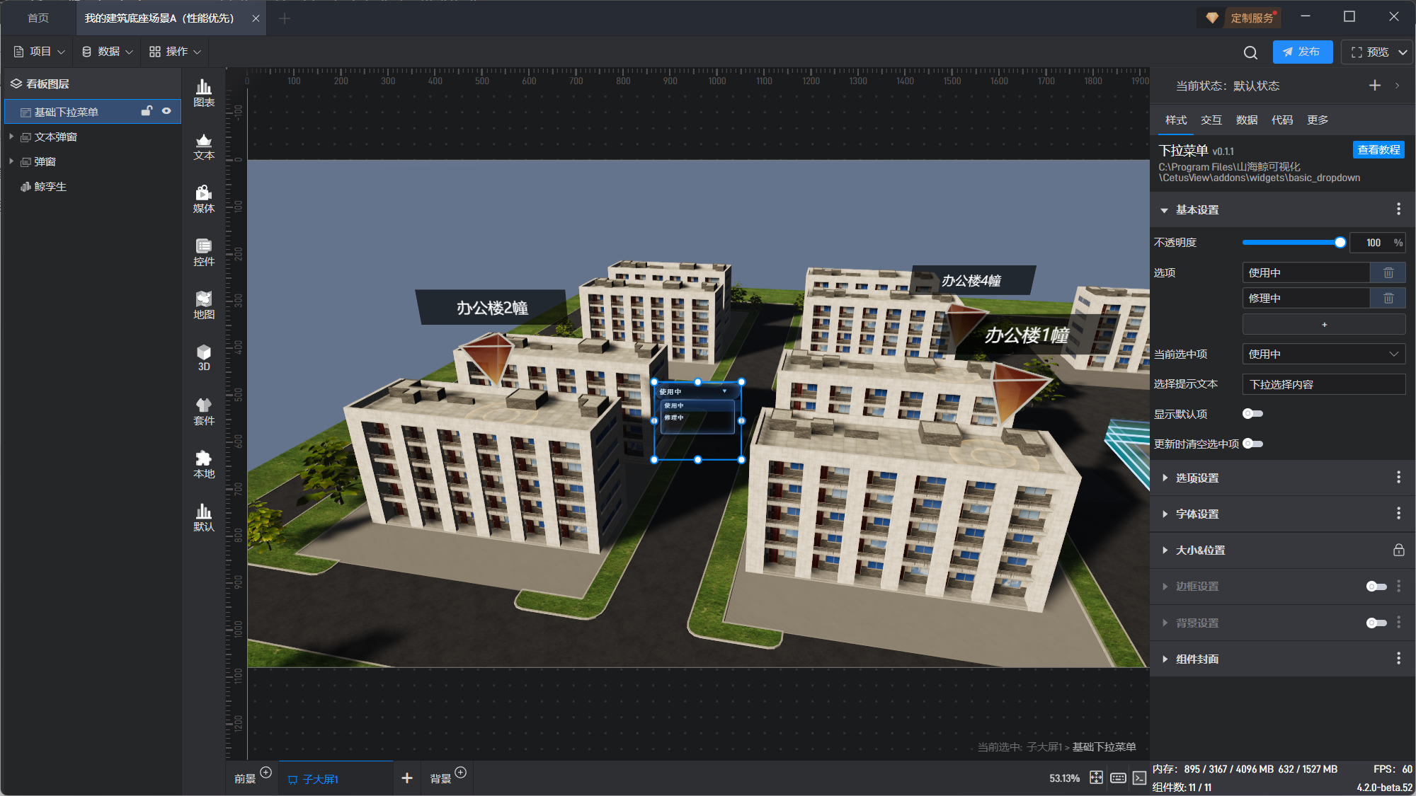 有的时候我们希望只显示符合条件的标记点,这个就要用到标记点筛选,我们在画面中添加一个下拉框,并添加使用中和修理中两个选项:
