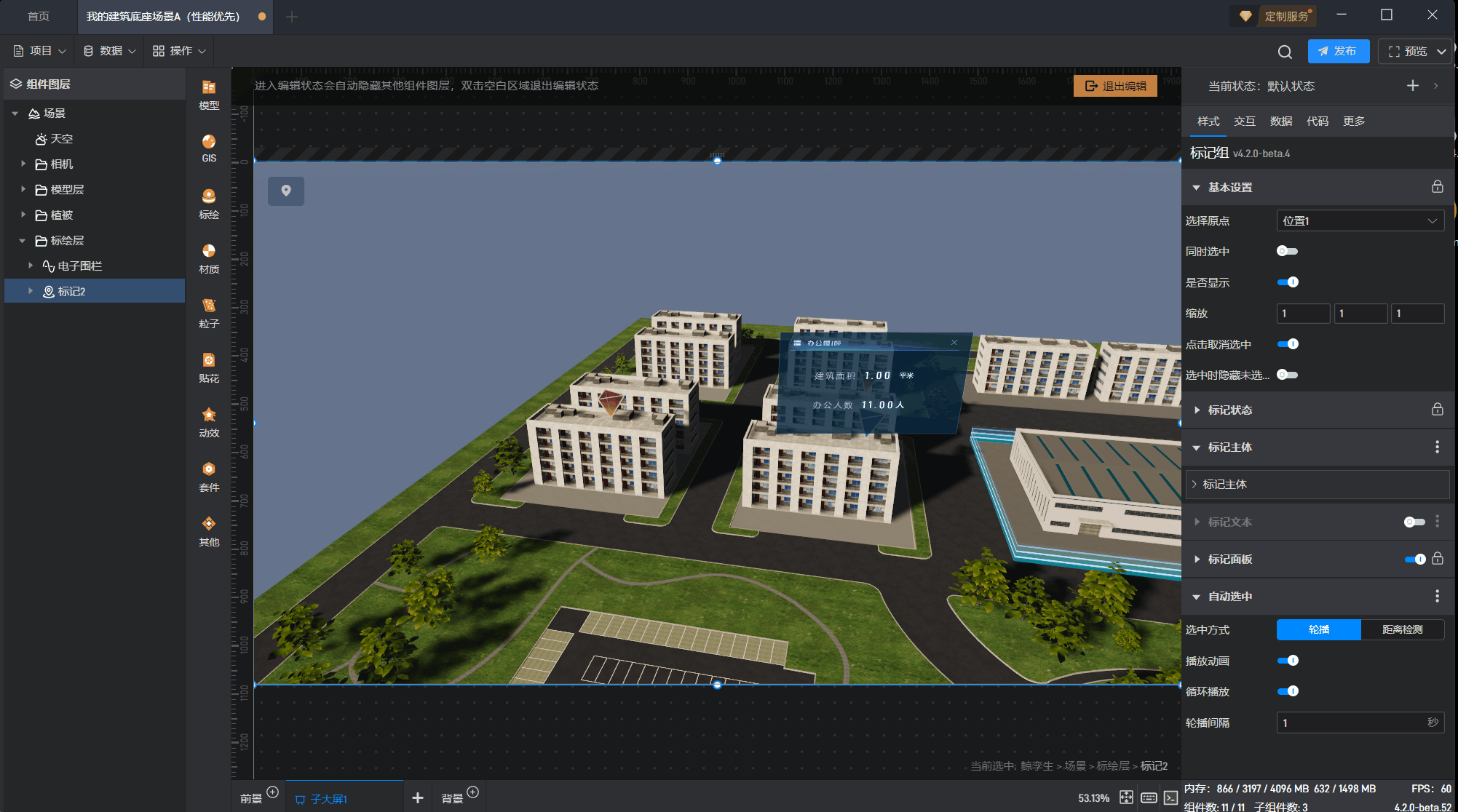 标记点的选中除了手动点击外,还有多种触发方式,包含轮播选中,走近自动选中,表格传递选中等等。