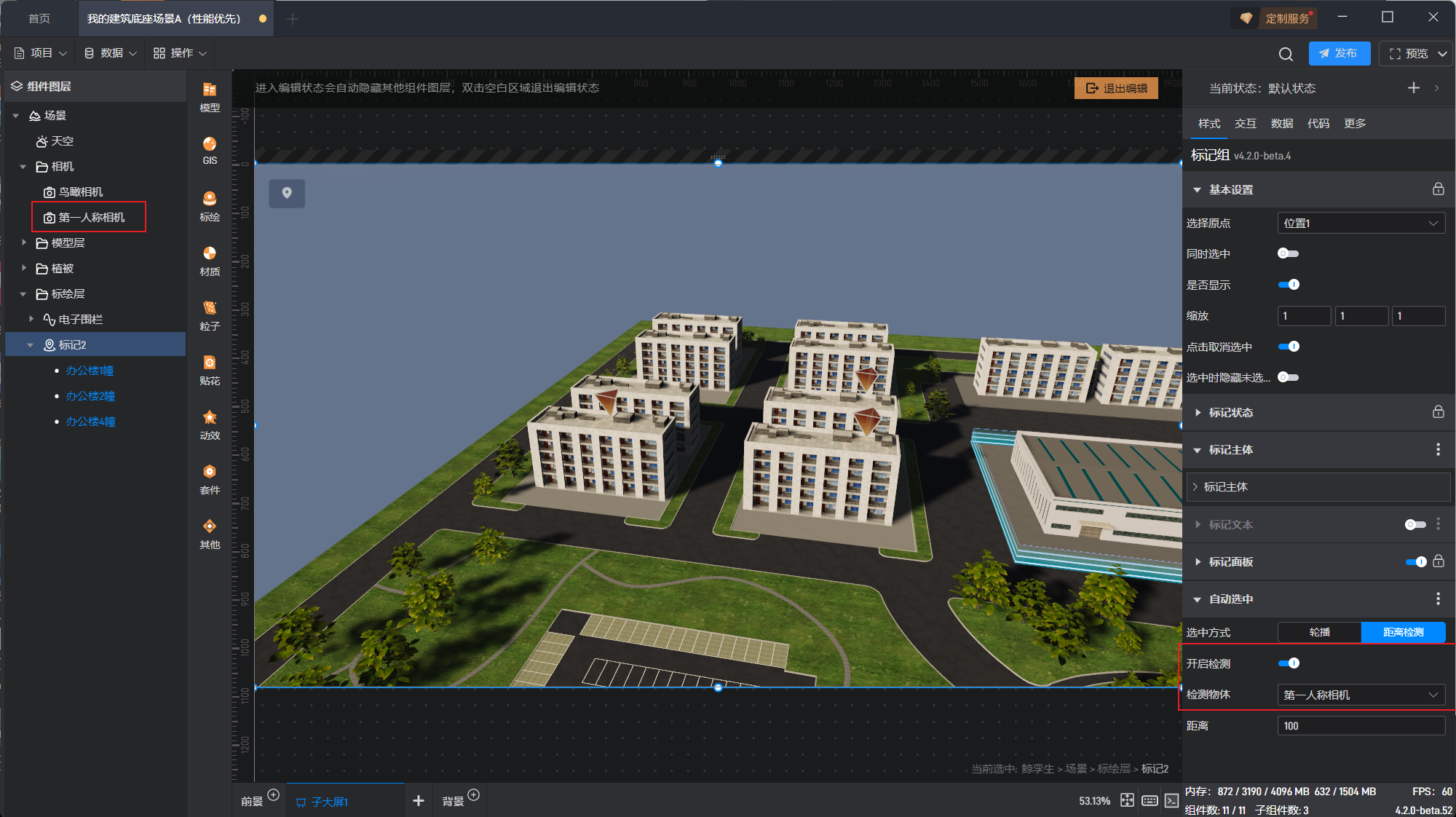 有的时候,我们需要能够相机走近时弹出面板或者其他物体靠近时弹出面板,我们在标记组的自动选中里,切换到距离检测,打开开始检测,选中当前的主相机,修改一个合适的距离: