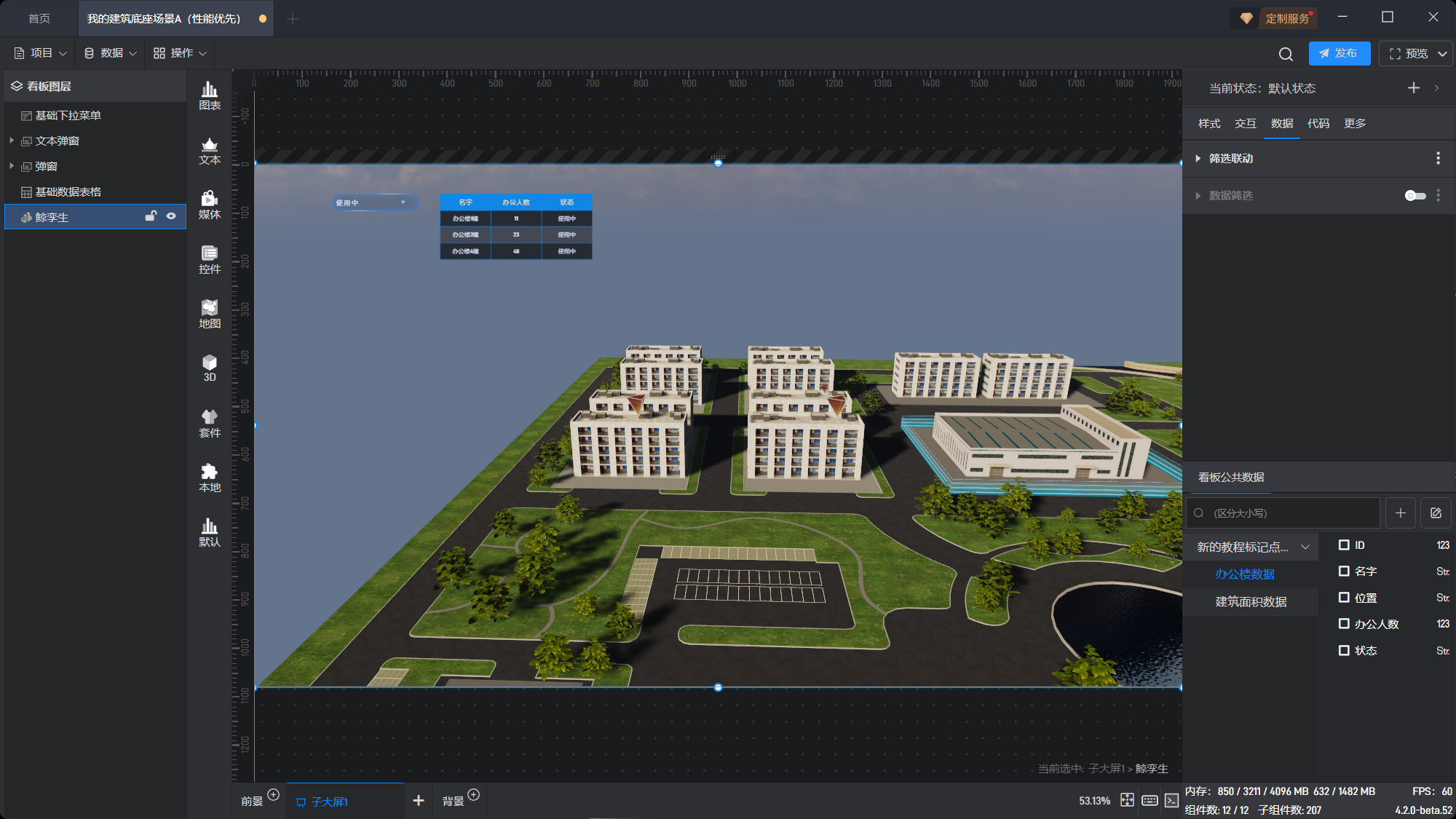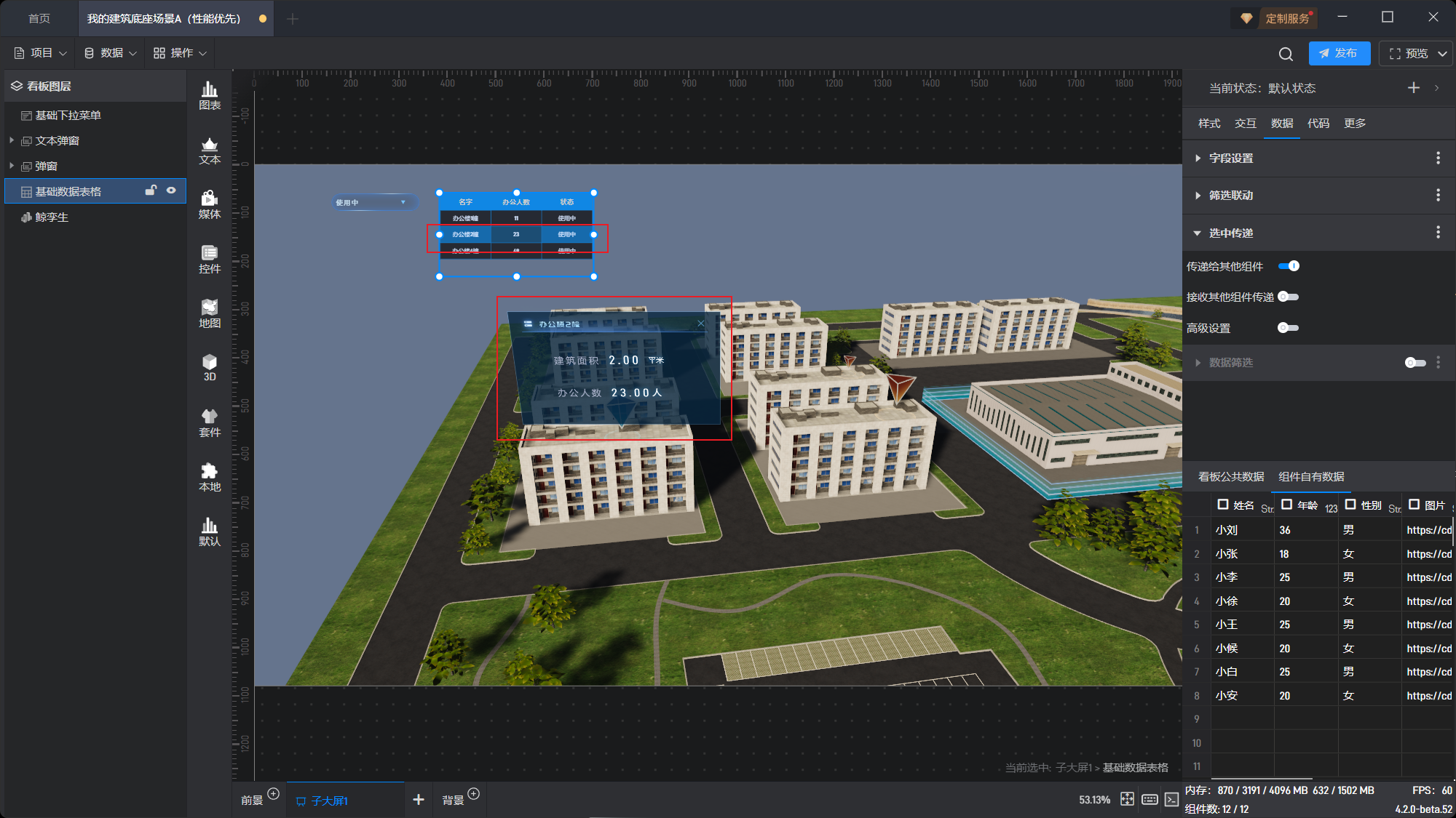 我们首先在页面中加入表格组件,同时将建筑的信息绑定到表格数据中: