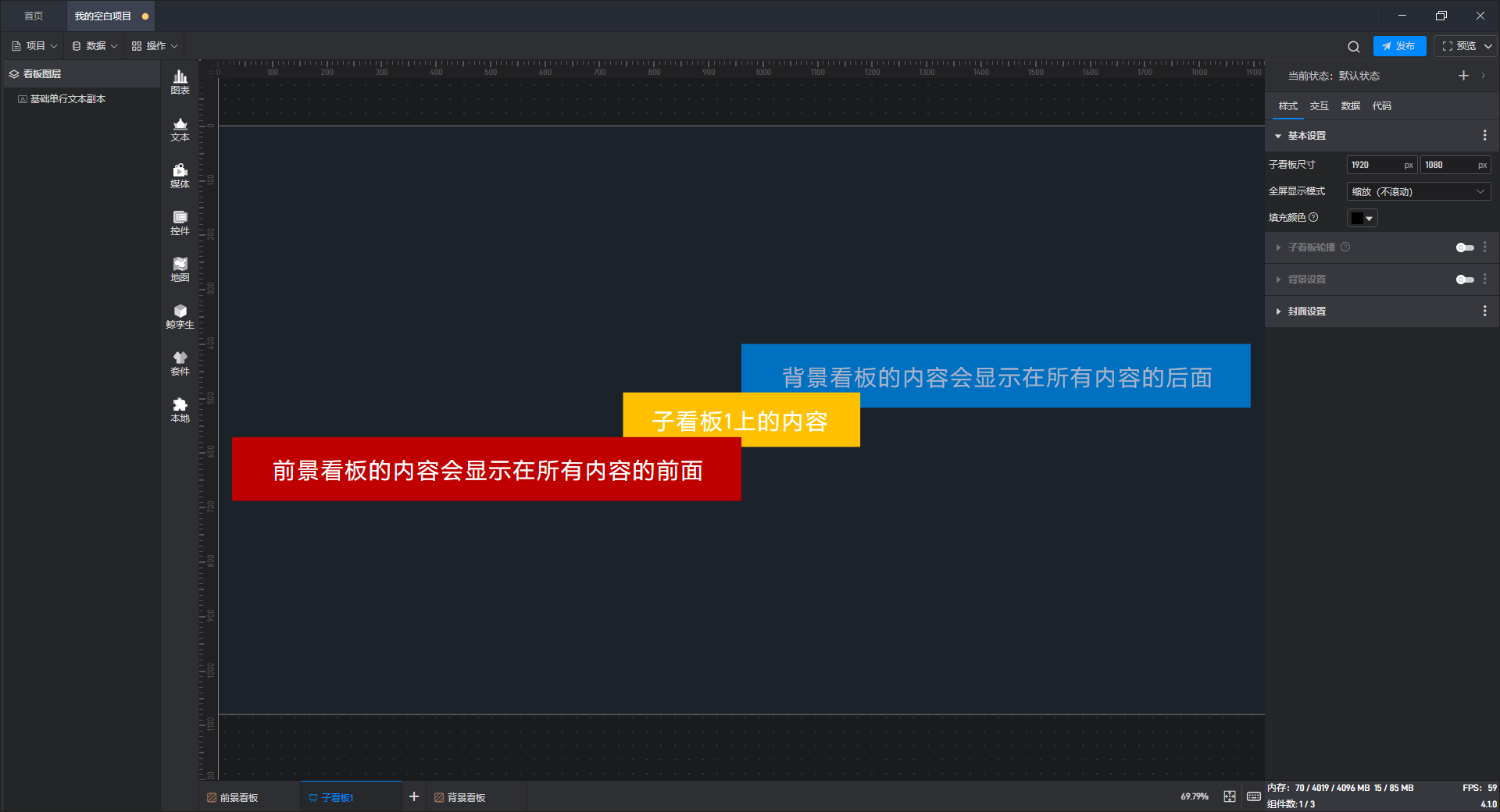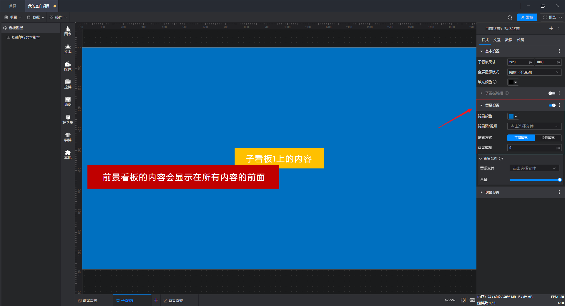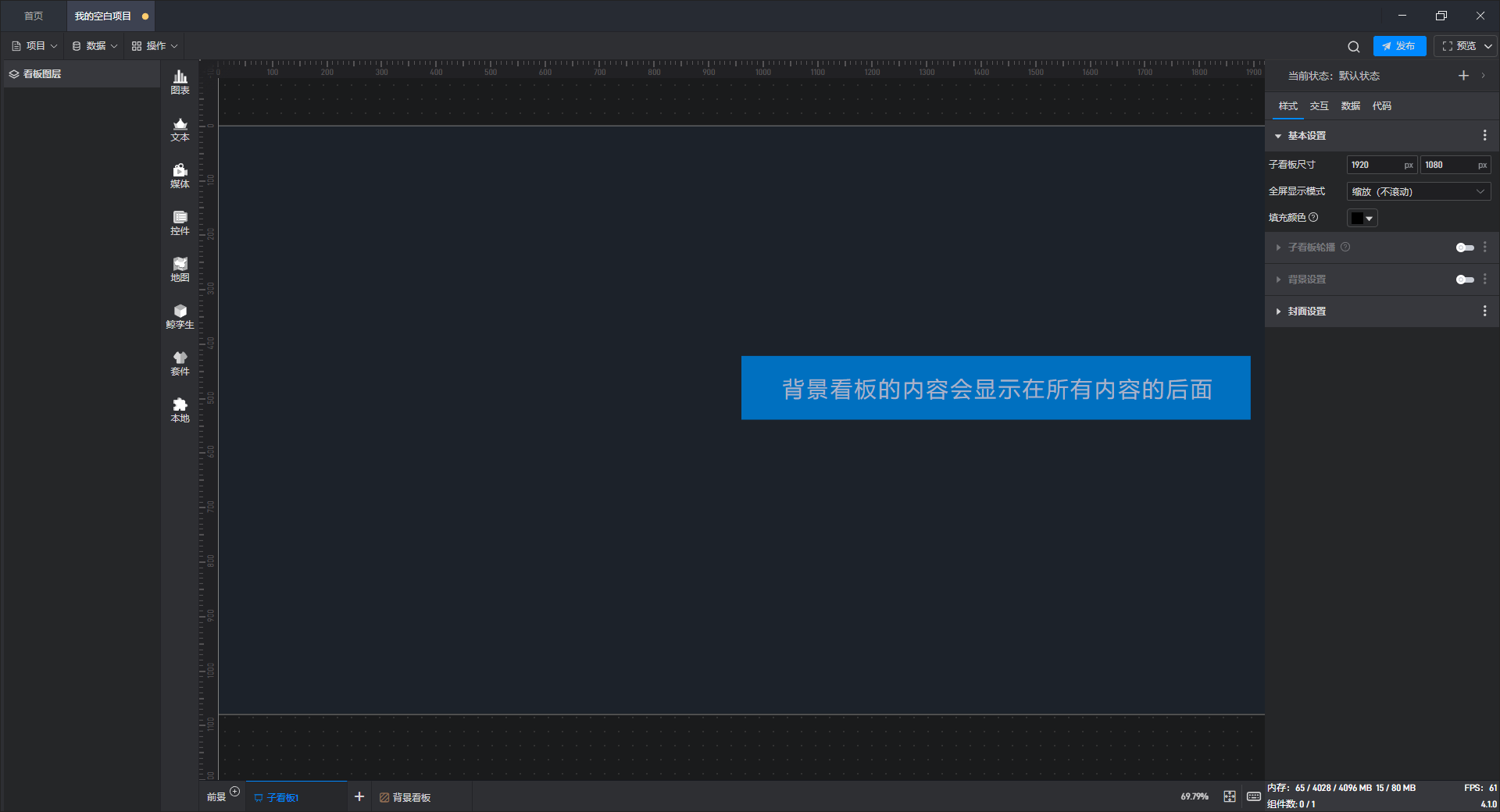 在这些子看板中,有时候会存在一些公共的内容(例如标题,菜单,弹窗或者地图等),如果把这些公共的内容单独拿出来放到一个子看板中,可以提升资源复用率从而减少看板资源,提升性能,而且可以减少看板制作过程中的一些重复性工作,提高效率。用来放置这些公共内容的子看板我们称之为“前景看板”或“背景看板”。