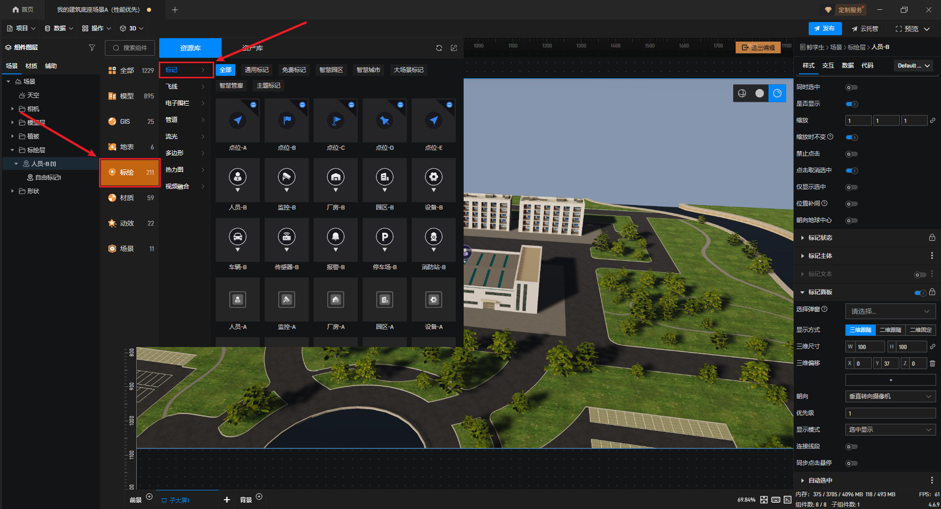 首先,在左侧模型库中选择“标绘-标记”,选择一个标记点添加。