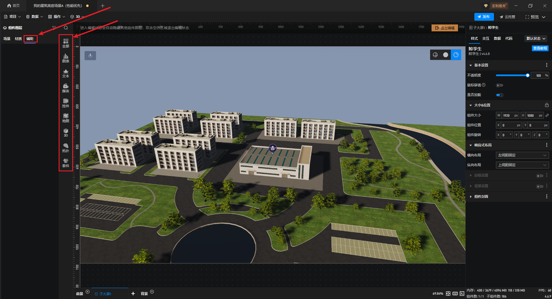 在左侧图层列表上方,将“场景”切换为“辅助”,可以看到此时左侧模型库变为了组件库。
