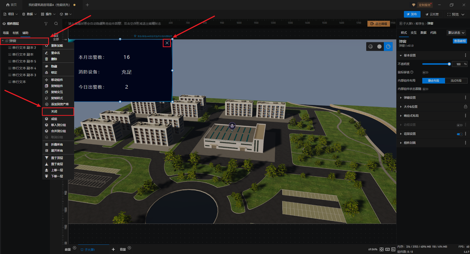 添加“弹窗”组件后,左侧图层列表中会显示该组件,我们可以右键组件图层关闭弹窗,或点击右上角的“×”关闭弹窗。