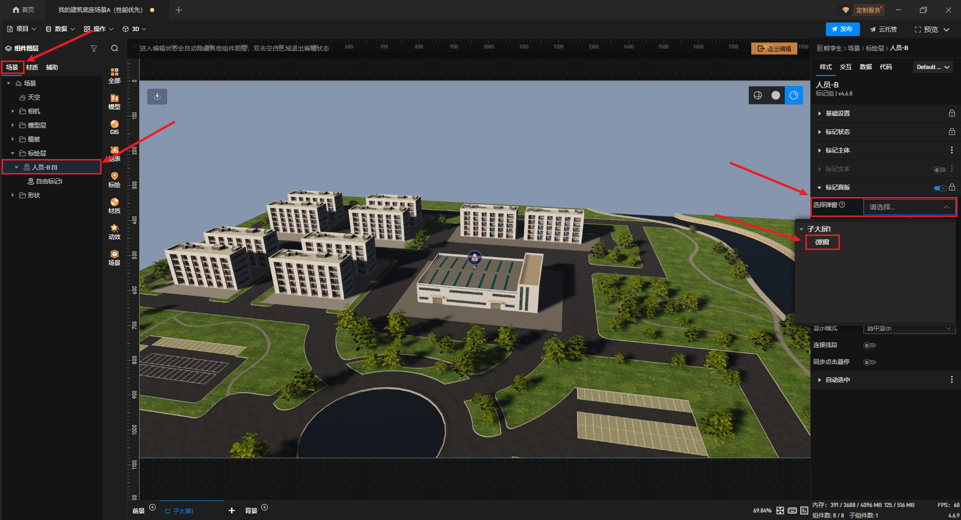 回到“场景”设置,在左侧图层列表中选中标记组图层,然后在“选择弹窗”中添加刚才设置的弹窗。