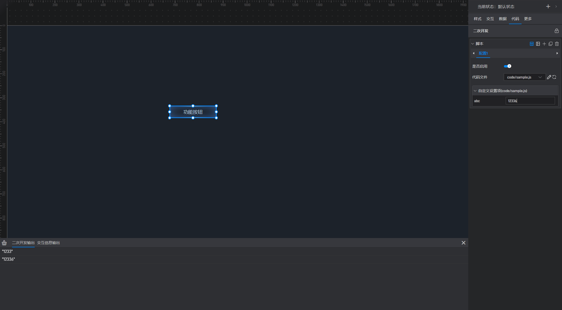 当属性面板中的属性值被修改时,我们希望在二开代码中能够实时响应,那么我们就需要用到 onPropertyChanged 方法,代码如下: