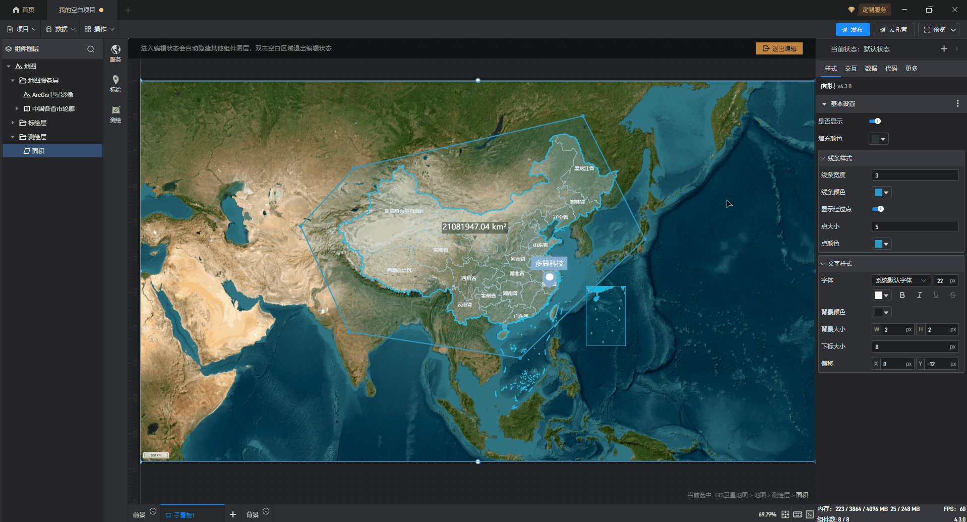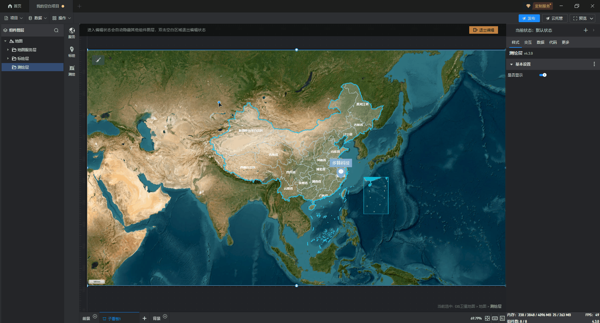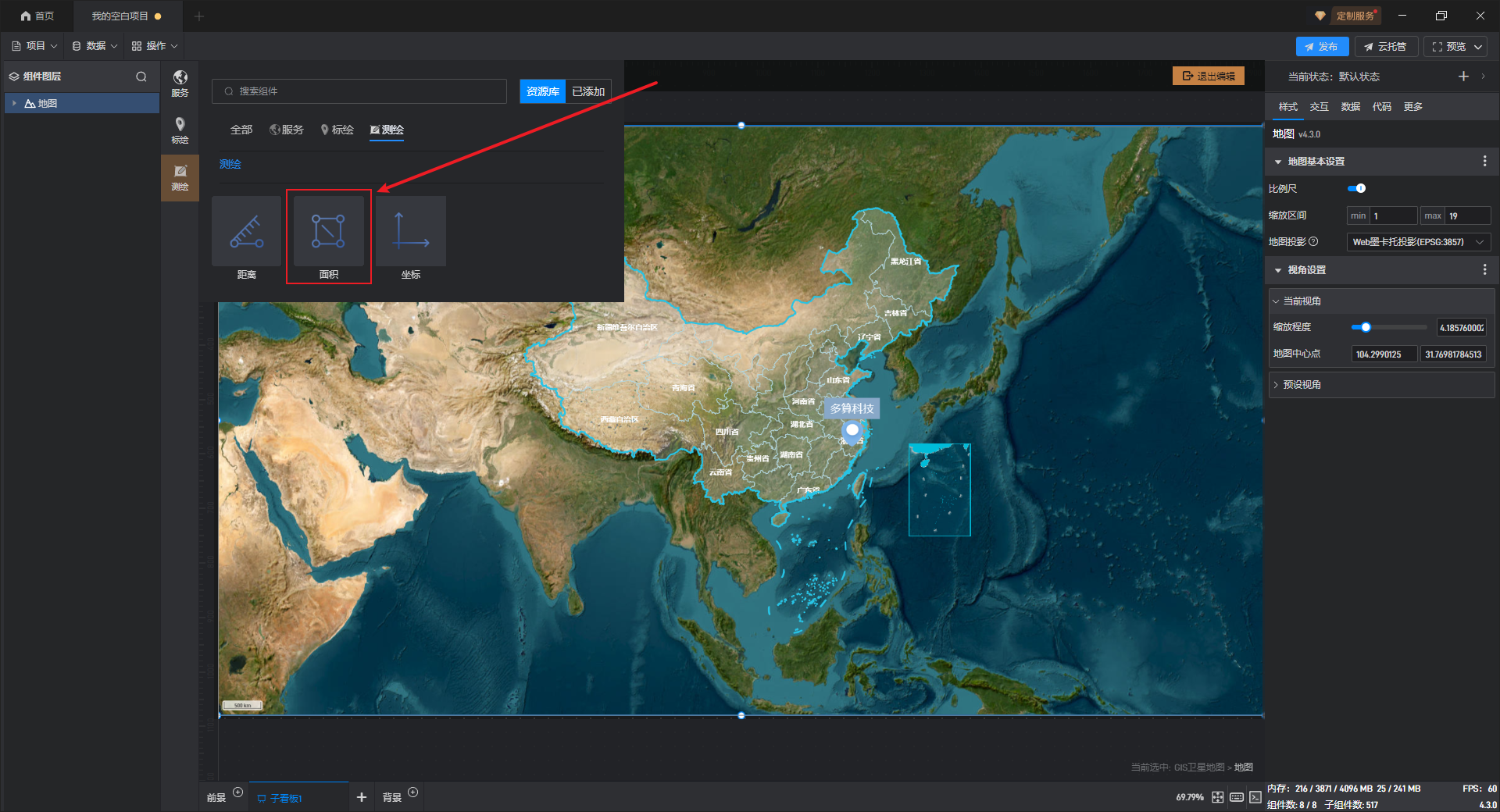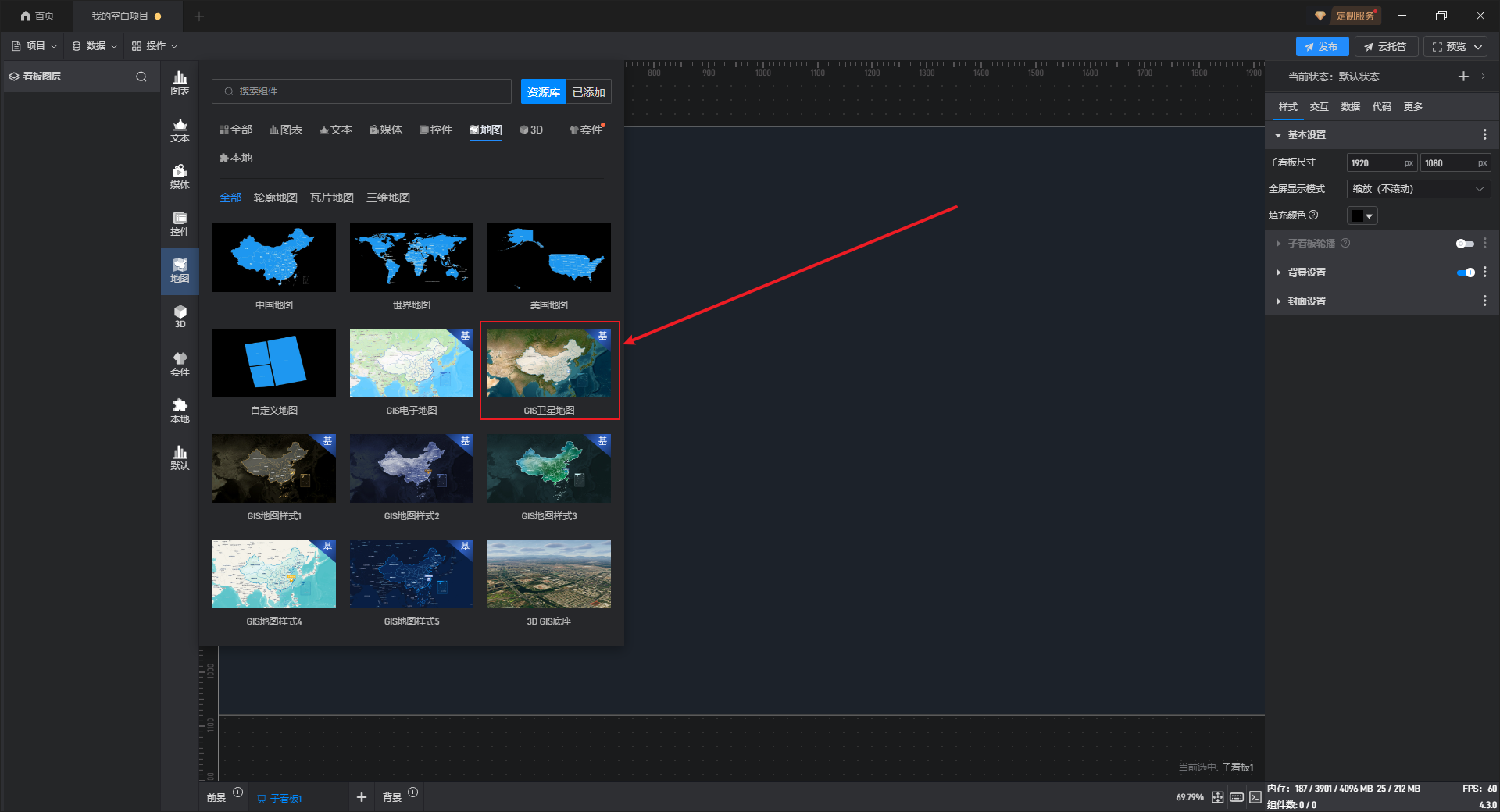 1. 创建一个空白项目后,点击左侧资源库中的“地图”分类,其中GIS 电子地图、GIS 卫星地图、GIS 地图样式这三个组件都属于鲸地图的预设样式,任意选择其中一个添加即可,这里使用“GIS 卫星地图”进行演示。