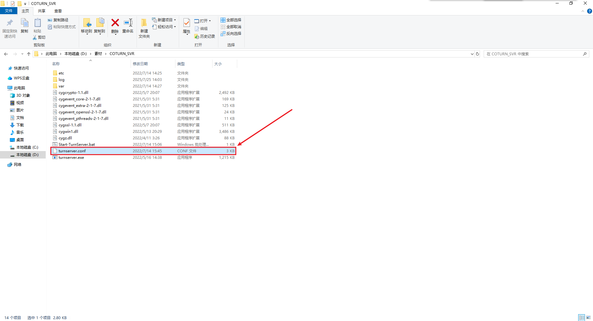 解压后打开“COTURN_SVR”文件夹,然后用记事本打开“turnserver.conf”文件。
