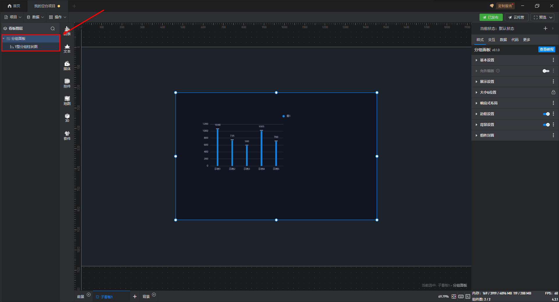 首先添加一个“分组面板组件”,在“分组面板组件”中添加一个“T 型分组柱状图组件”。
