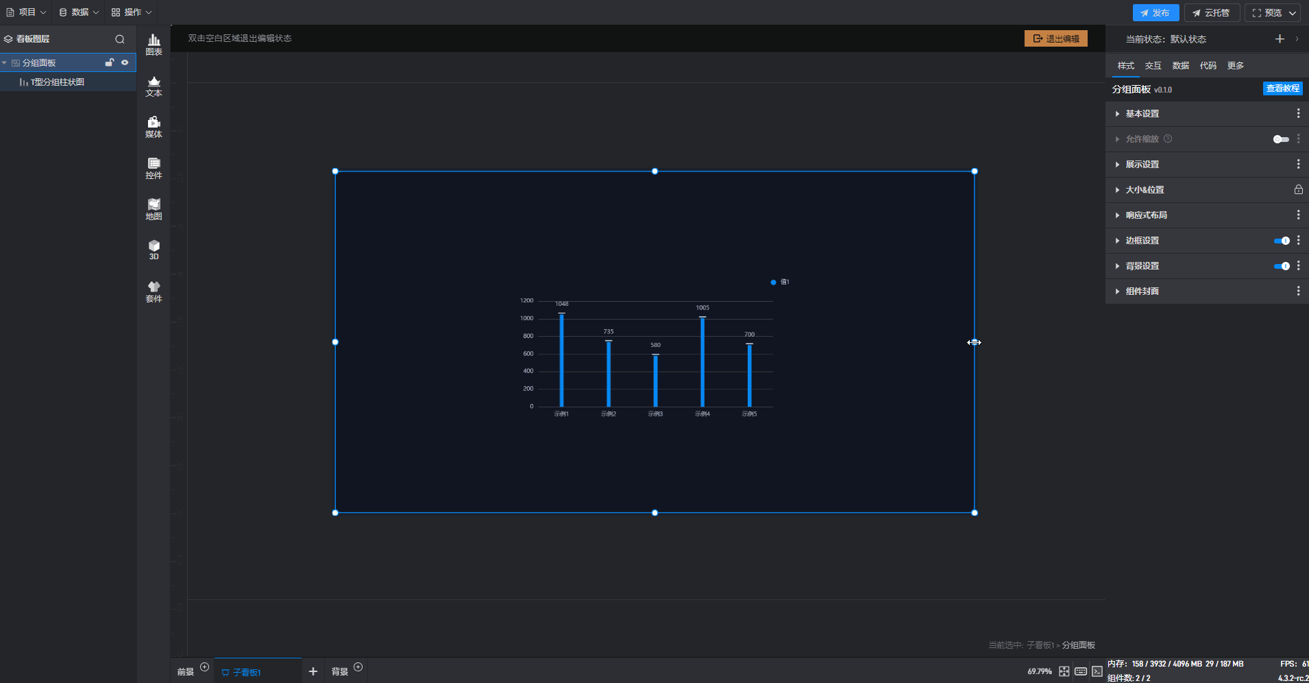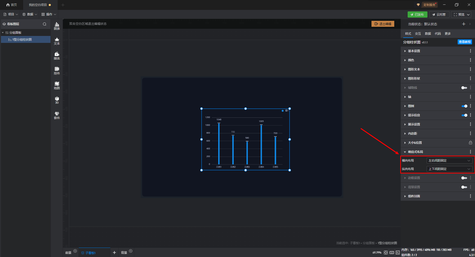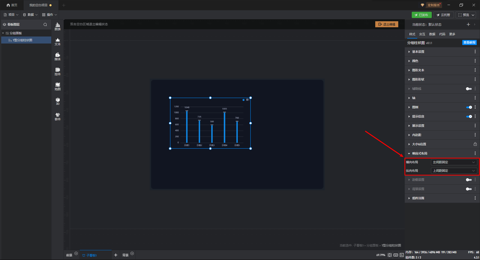 双击进入“分组面板组件”的编辑状态,选择“T 型分组柱状图组件”,此时响应式布局设置为默认的“左间距固定”和“上间距固定”。