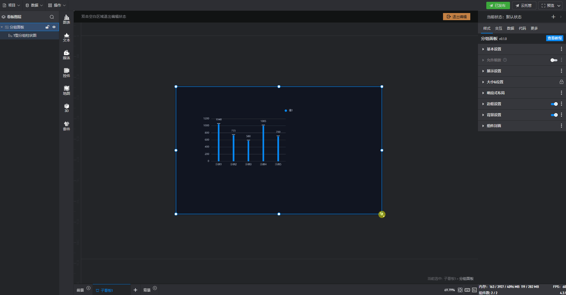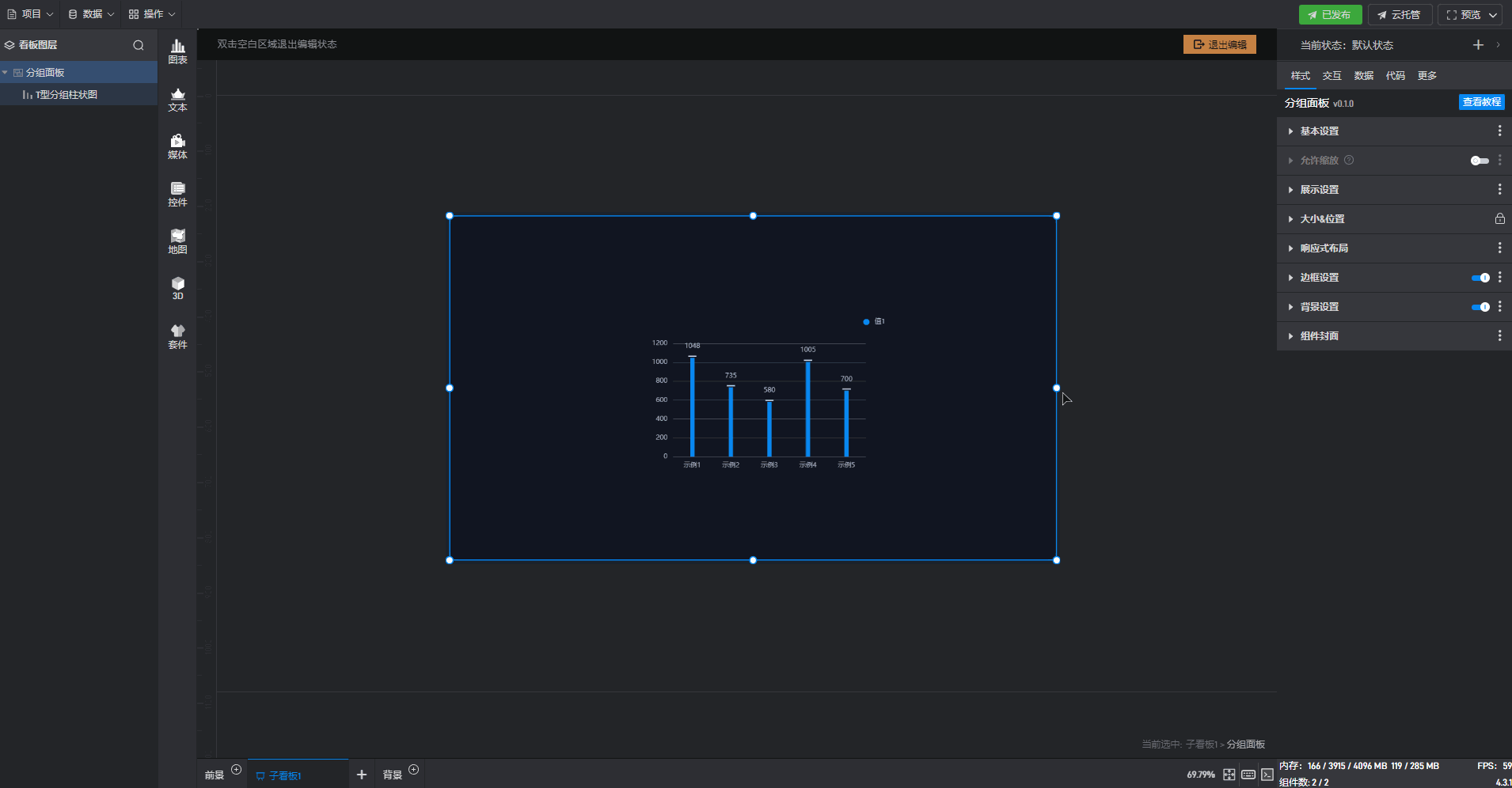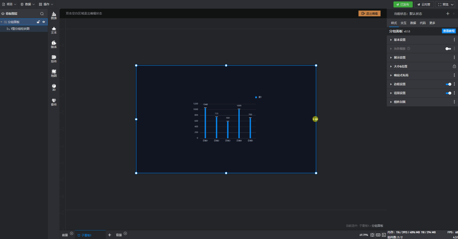 双击进入“分组面板组件”的编辑状态,选择“T 型分组柱状图组件”,此时响应式布局设置为默认的“左间距固定”和“上间距固定”。
