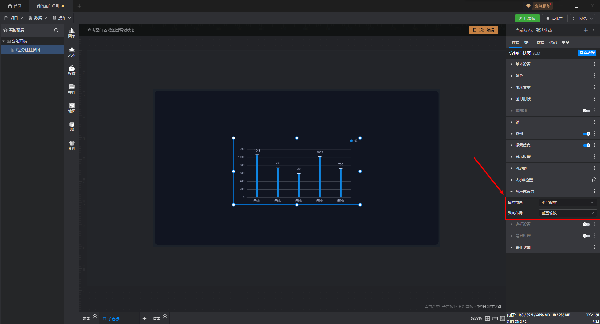 双击进入“分组面板组件”的编辑状态,选择“T 型分组柱状图组件”,将响应式布局设置修改为“水平缩放”和“垂直缩放”。