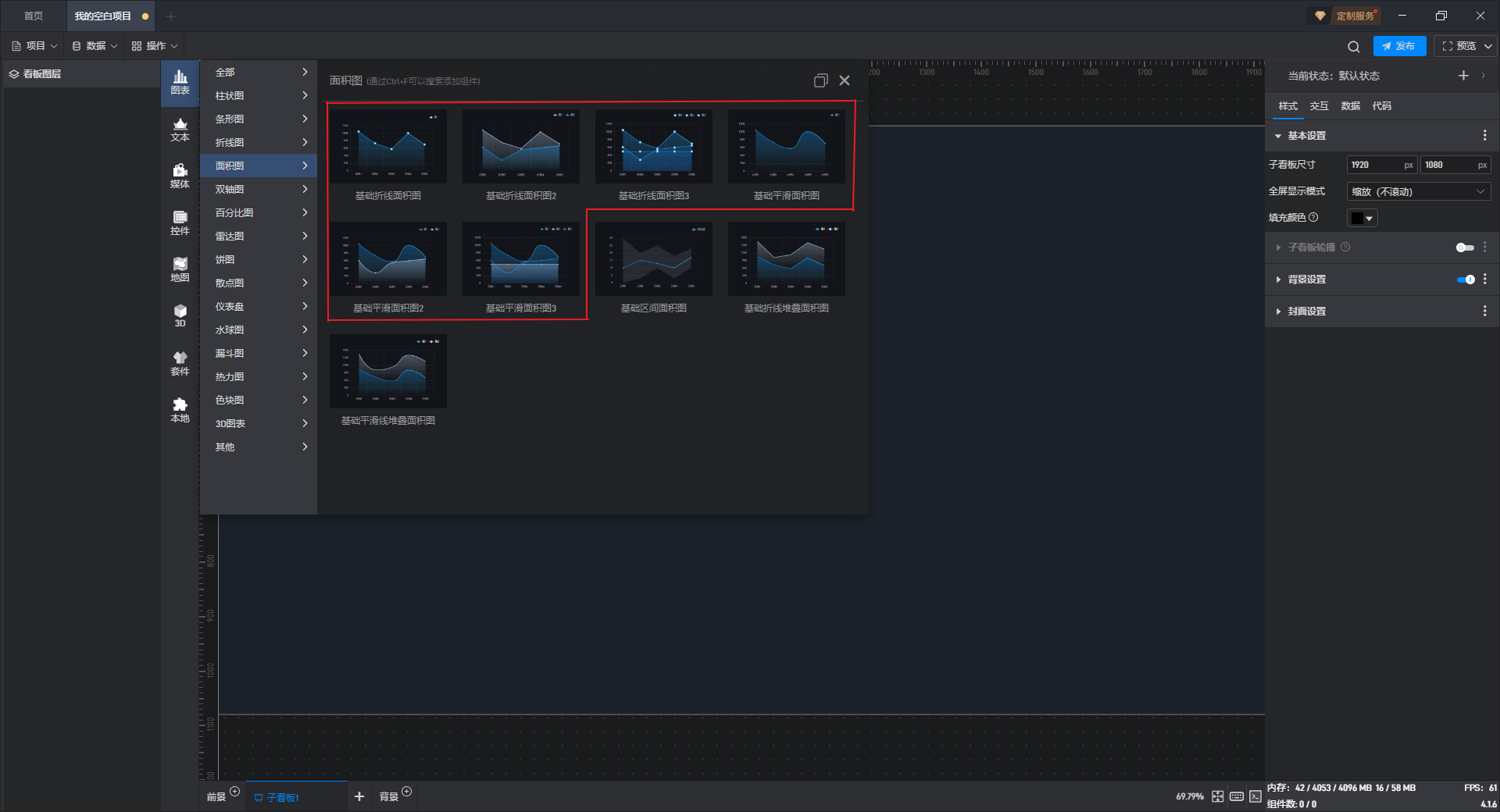 基础折线面积图、基础折线面积图 2、基础折线面积图 3、基础平滑面积图、基础平滑面积图 2、基础平滑面积图 3都是面积图组件的预设样式,这些预设的样式主要包括组件自有数据、组件图形的形状、颜色和数量,但是本质上这些图表都属于面积图组件。