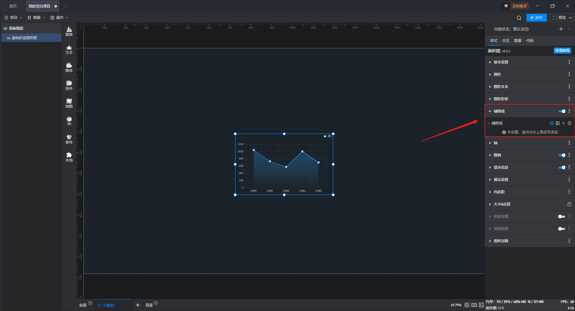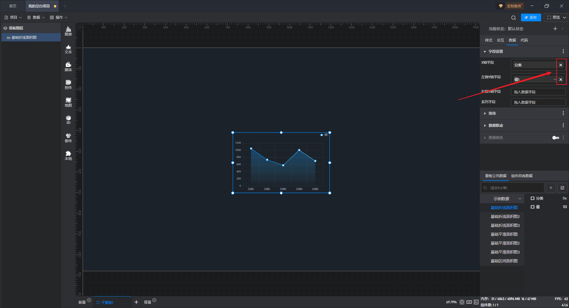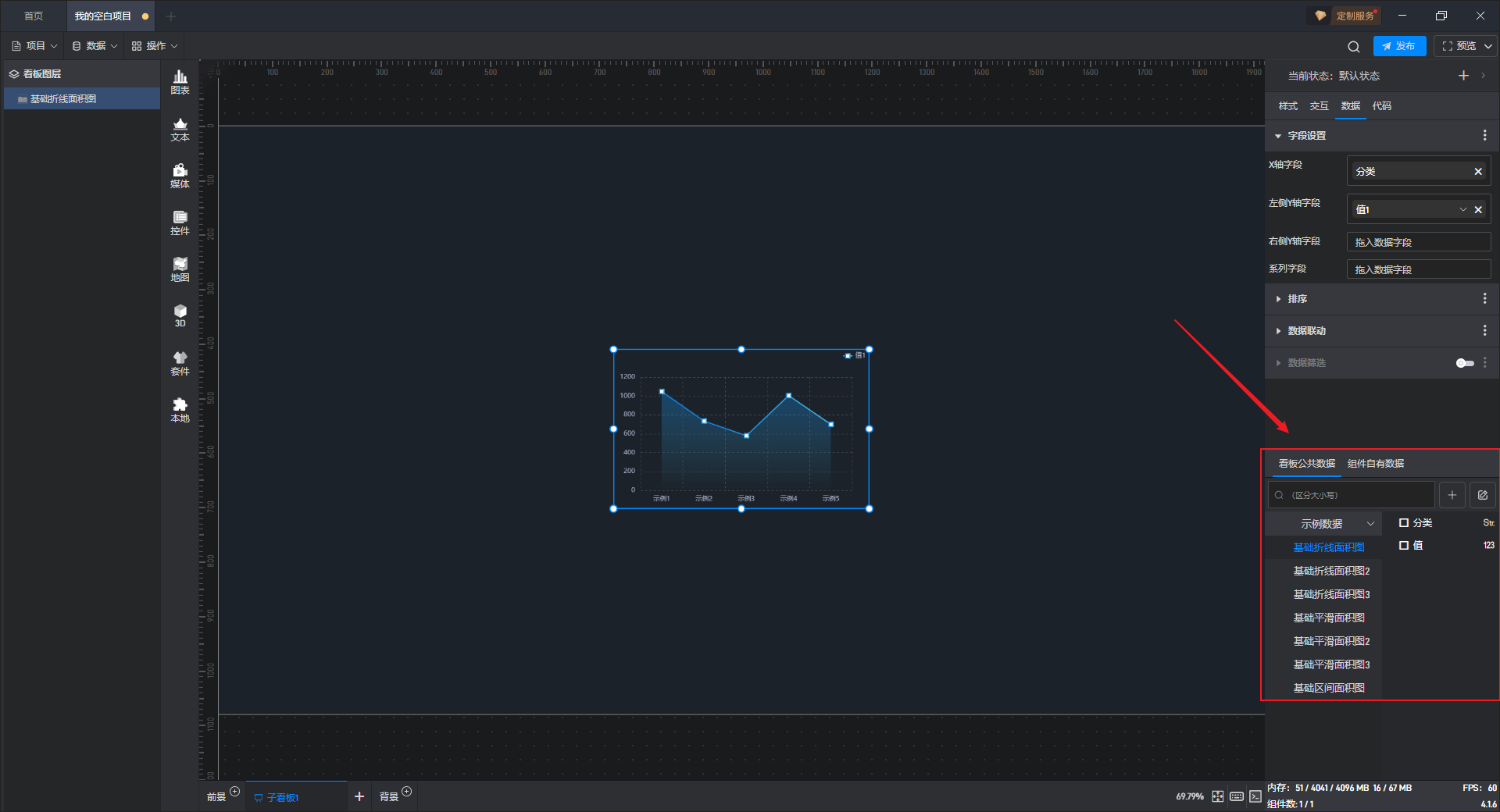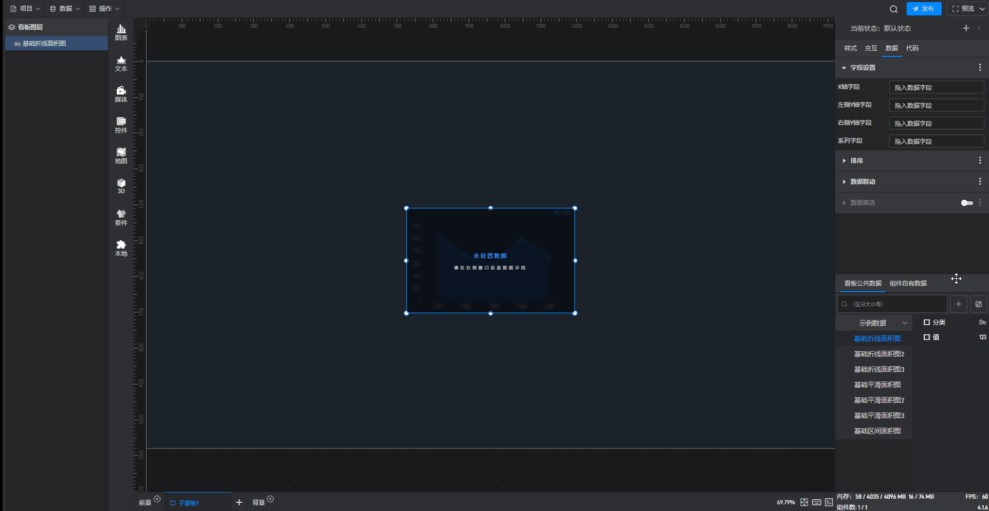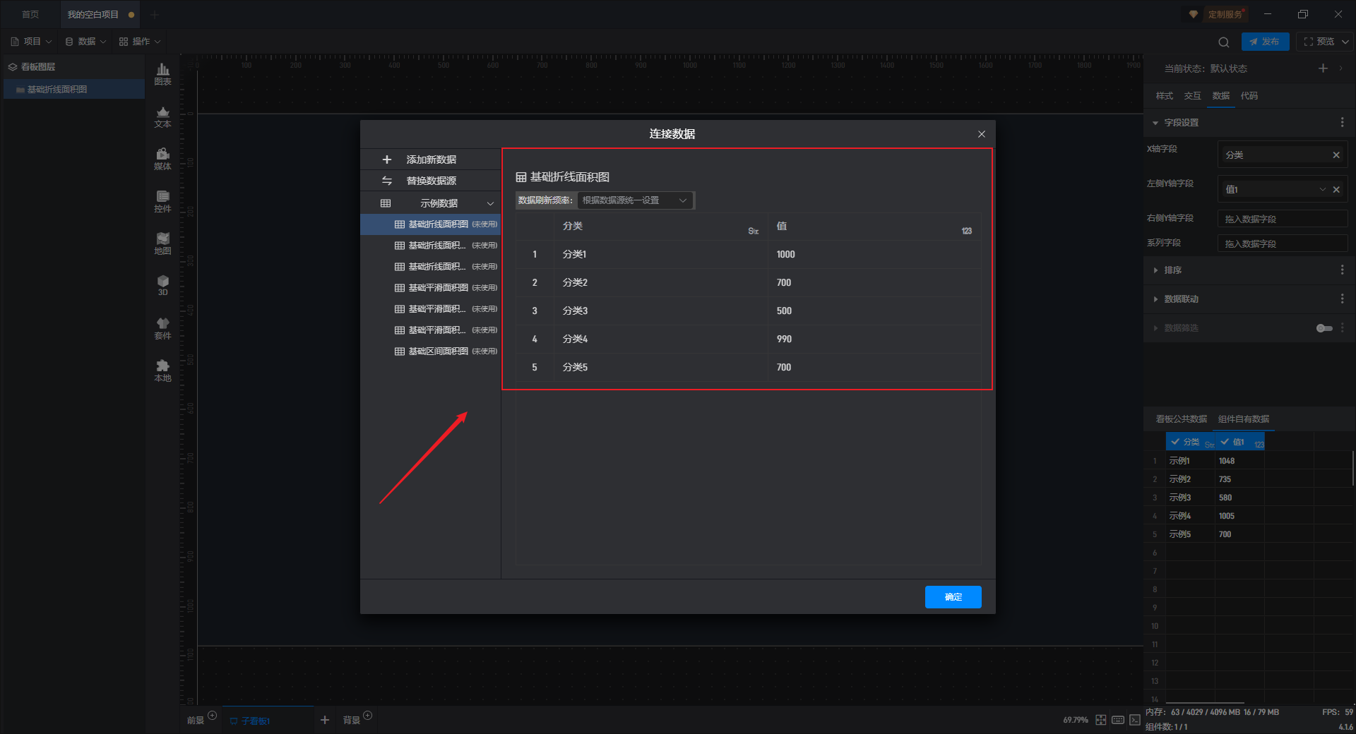 下面我们以基础折线面积图为例,为大家介绍一下该组件的使用步骤:
