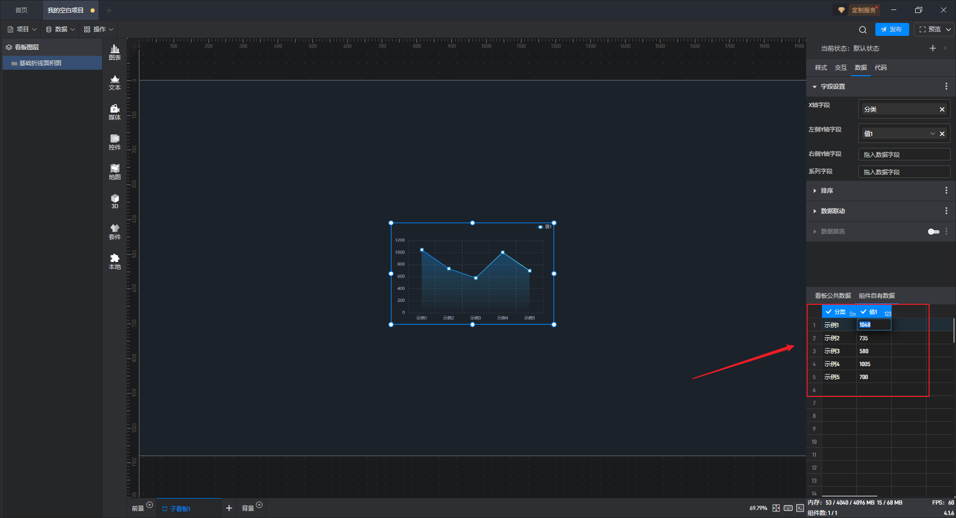 在“数据”设置界面下方可以直接修改数据,组件中的数据也会实时更新。