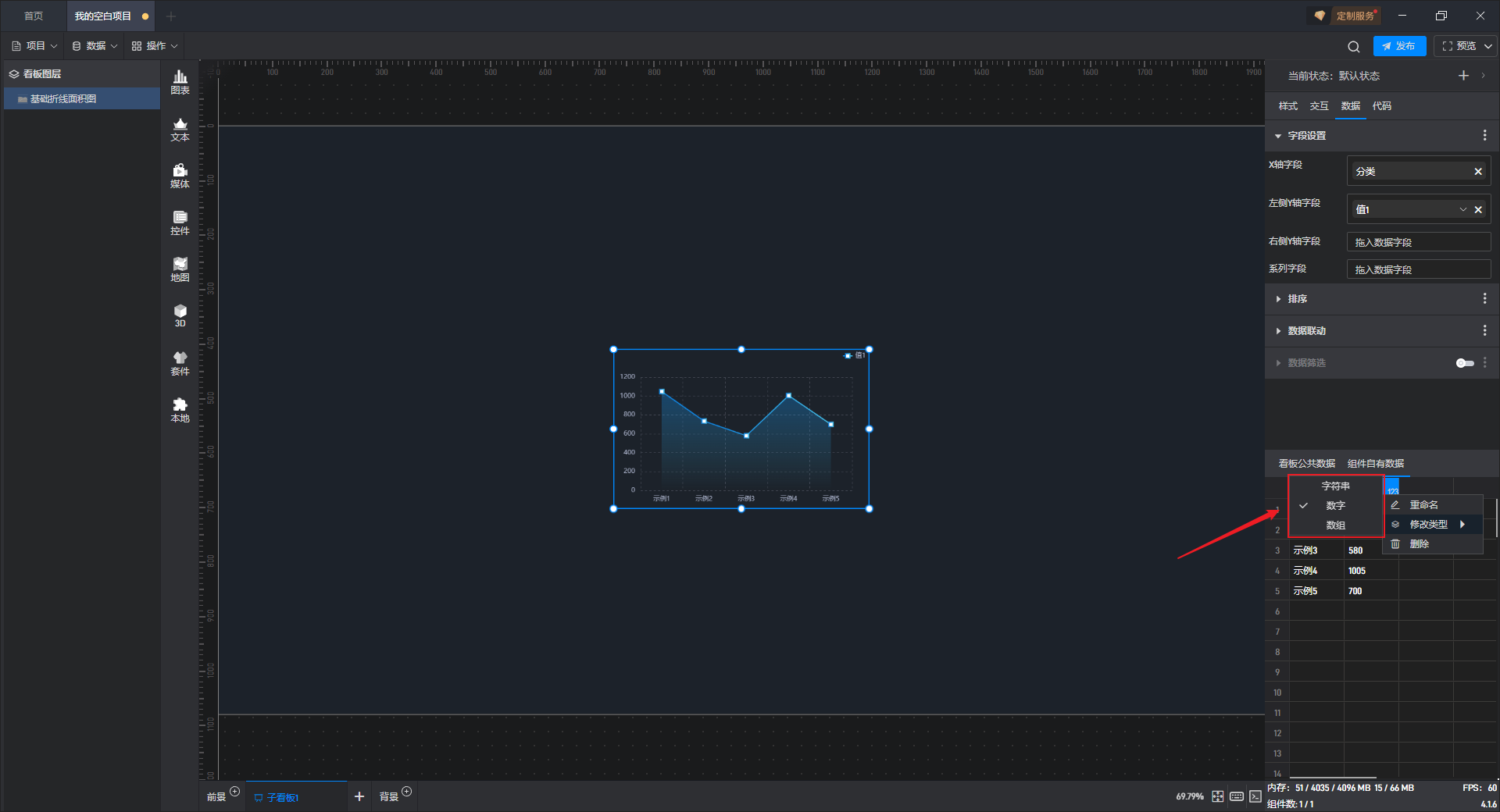 字段类型包括:字符串、数字和数组(X 轴字段和系列字段都是字符串类型,Y 轴是数字类型,数组类型用于词云组件),只有在字段类型正确的情况下,组件内容才能正常显示。