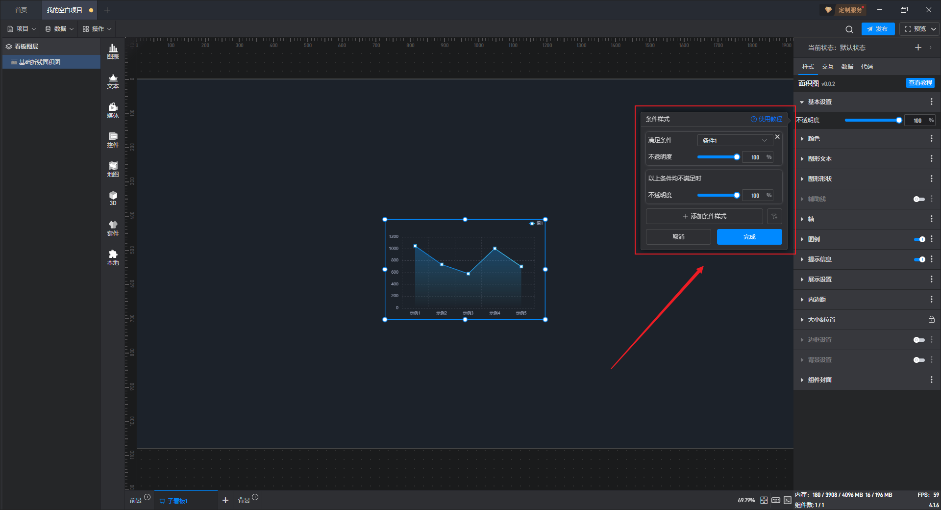 部分设置项的条件设置方式直接显示在该设置项中,可以直接在该设置项上设置,但面积图的条件样式只能通过方式 1 进行设置。
