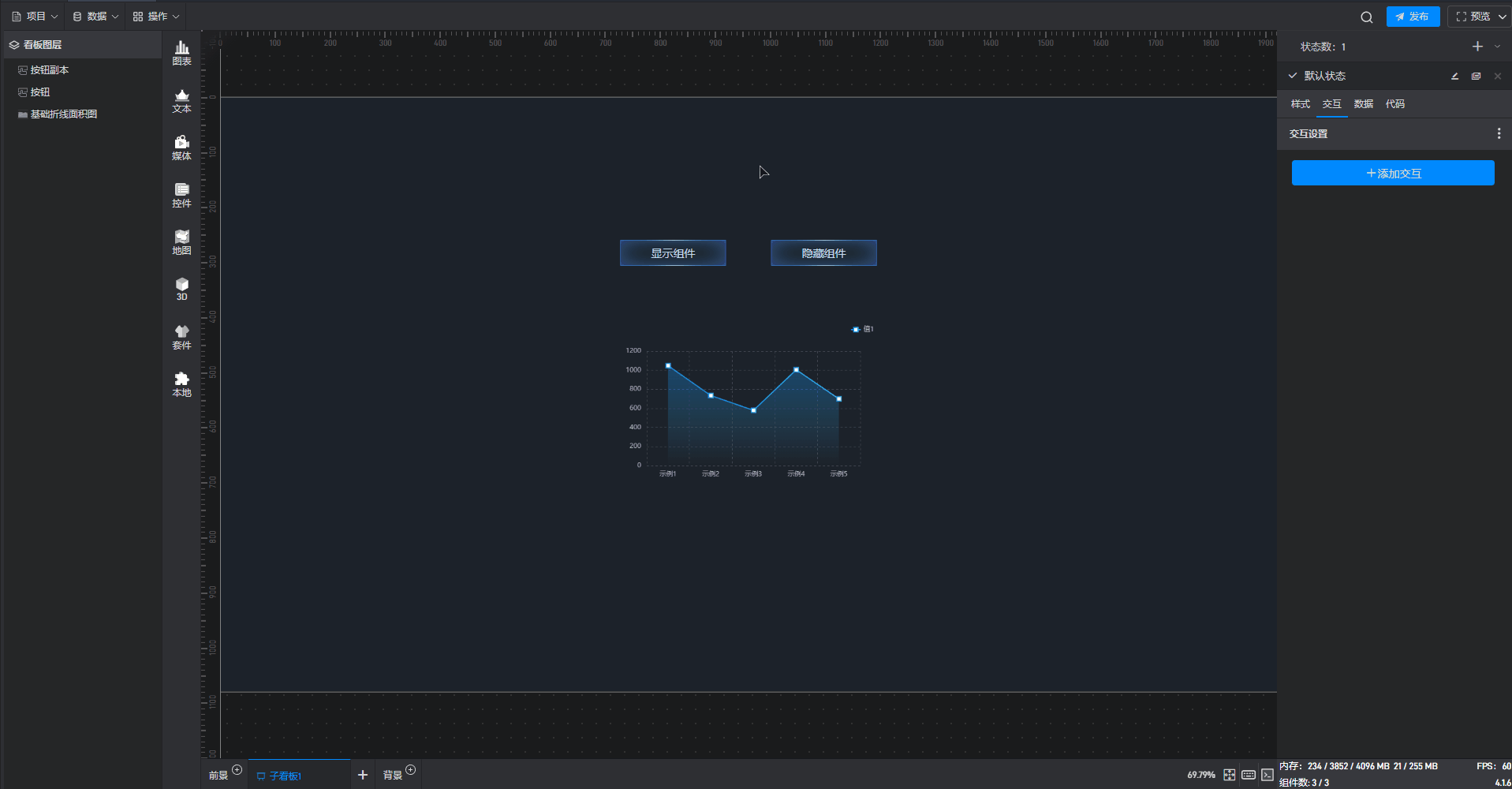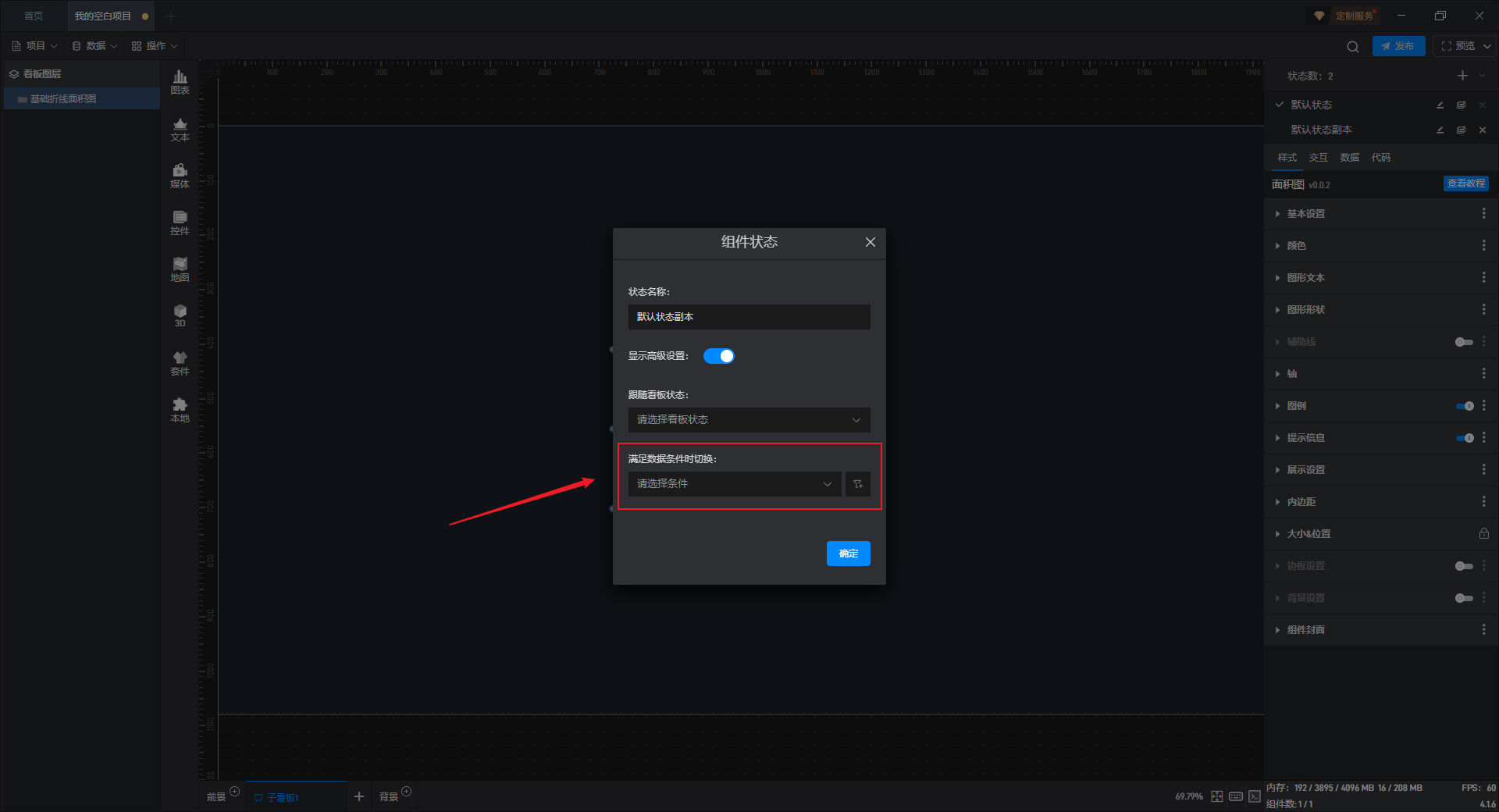 多状态主要用于通过数据条件或是点击交互(通常是点击其他组件来触发本组件的状态切换)来切换组件设置项的场景,这里的设置项包括组件的样式、交互、数据和代码。
