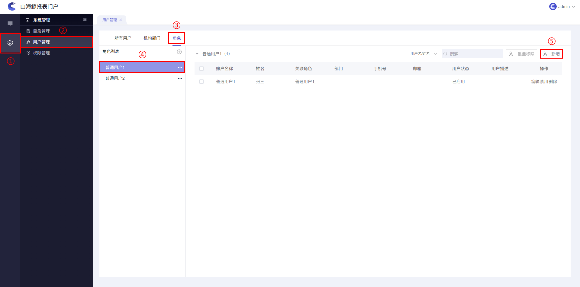 管理员登录报表门户系统,点击“系统管理>用户管理>角色”,点击“新增”按钮,将用户“张三”添加进角色“普通用户 1”中。如下图所示: